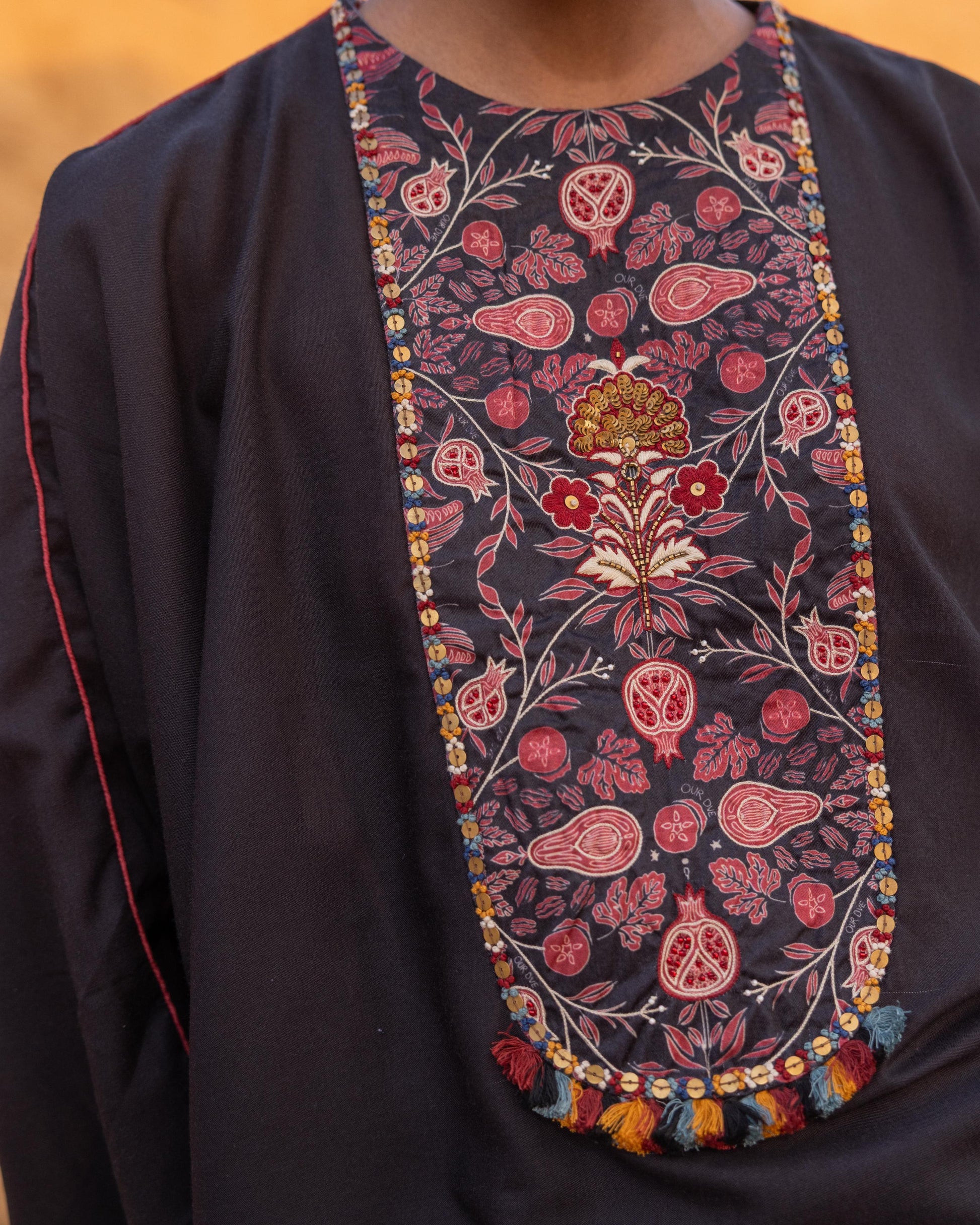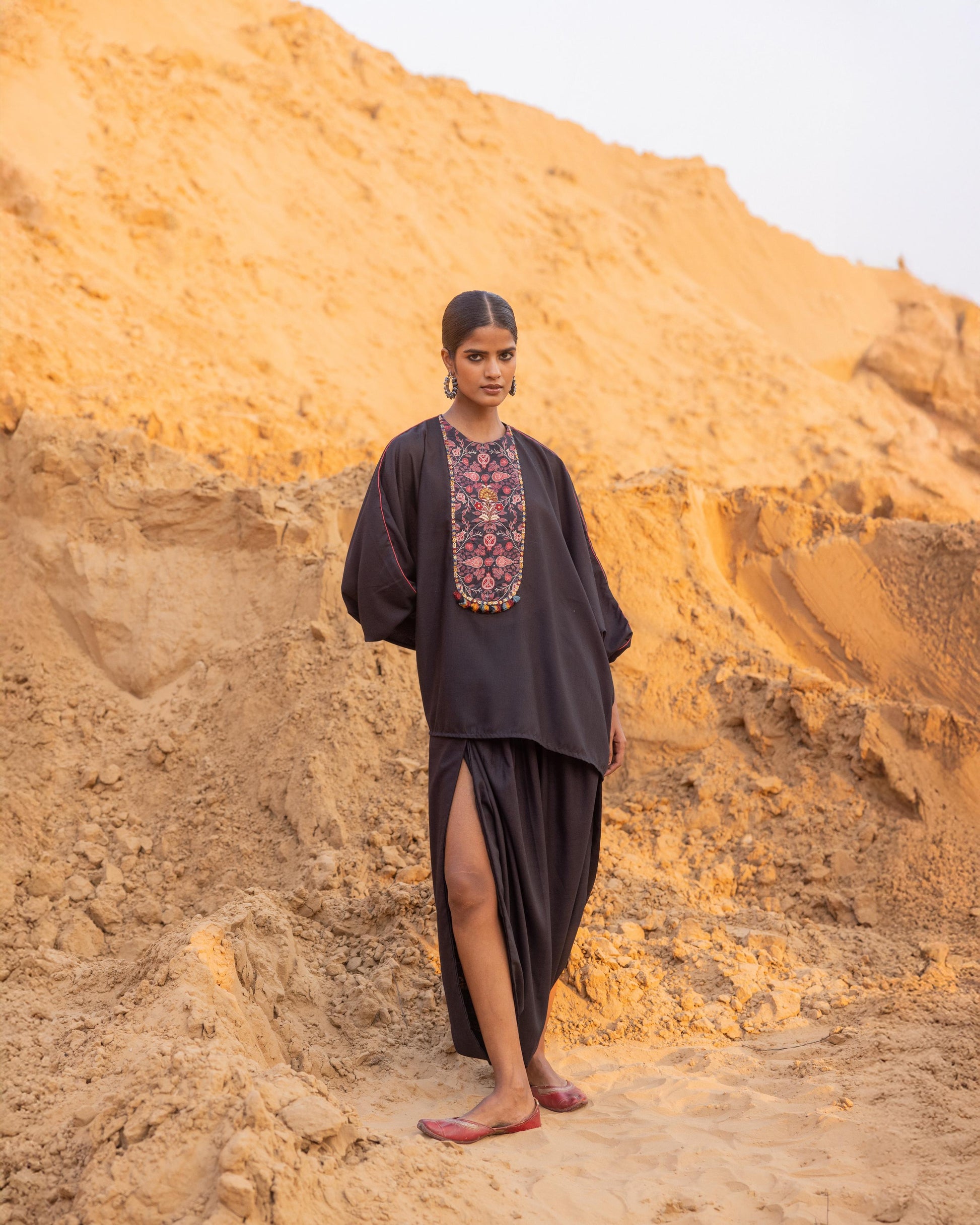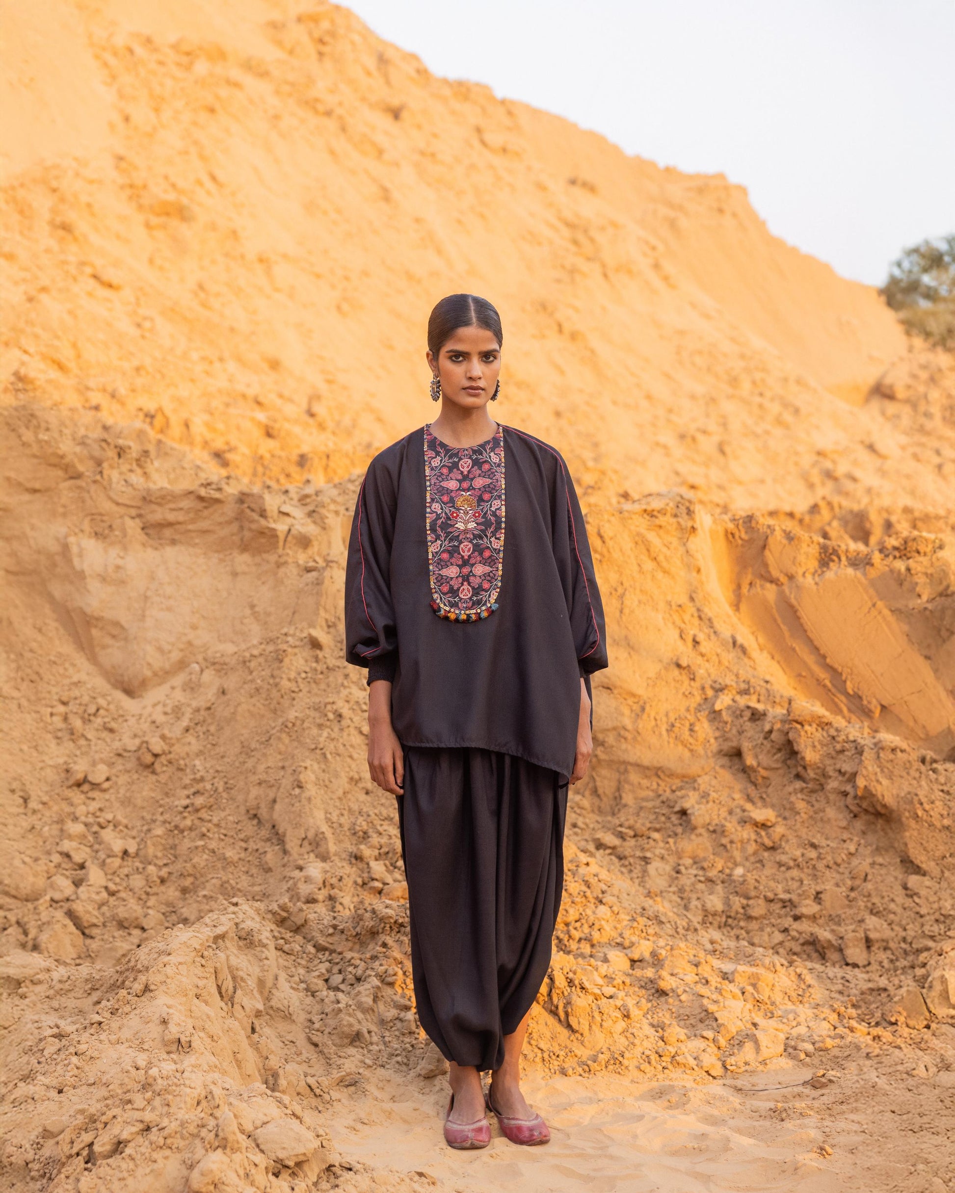 A free-size top paired with elegantly draped trousers, featuring printed patchwork enhanced with delicate threadwork, subtle sequins, and tiny tassels attached along the patched hem. Designed with sustainability and style in mind, this effortlessly chic ensemble is perfect for a modern, ready-to-go look.