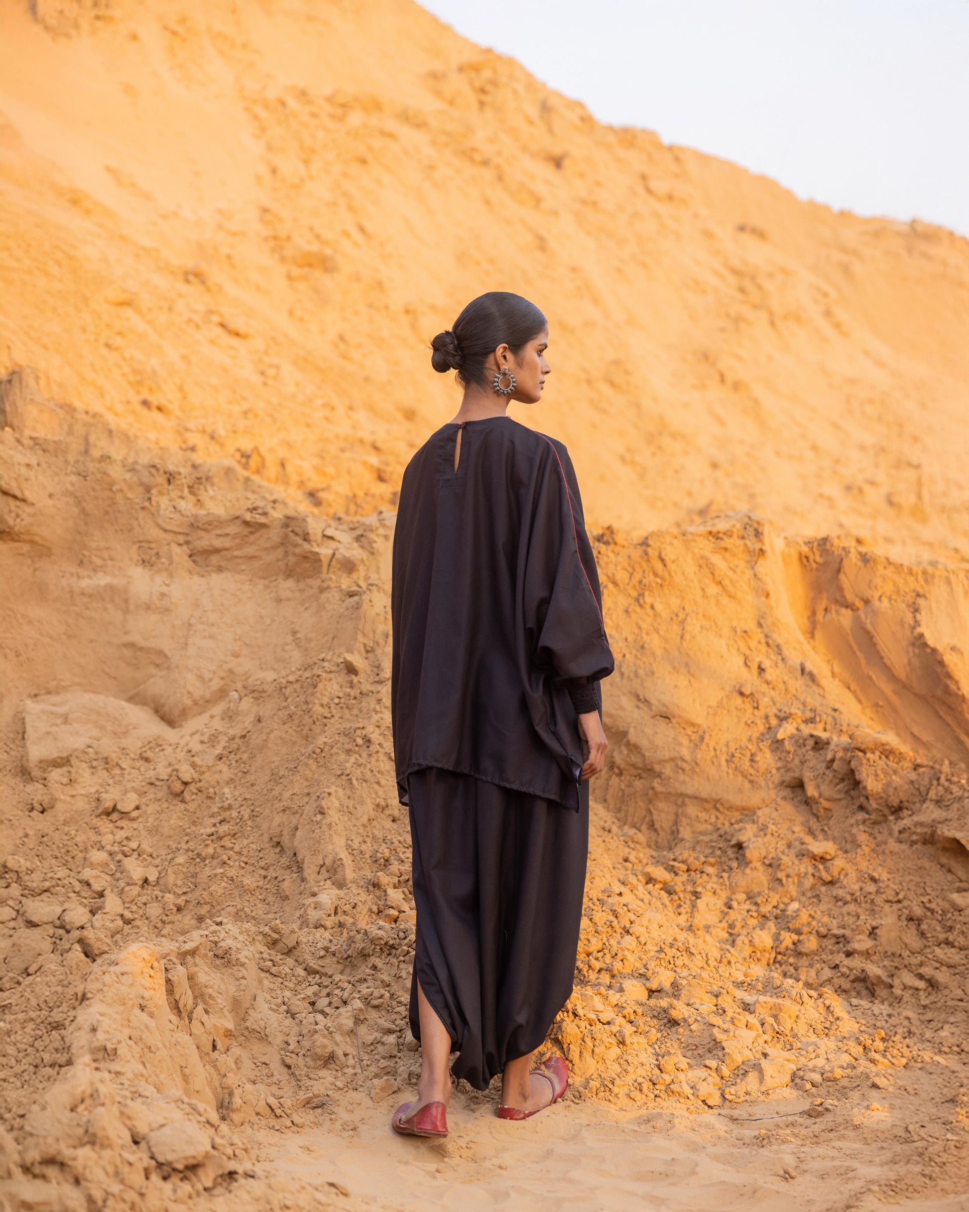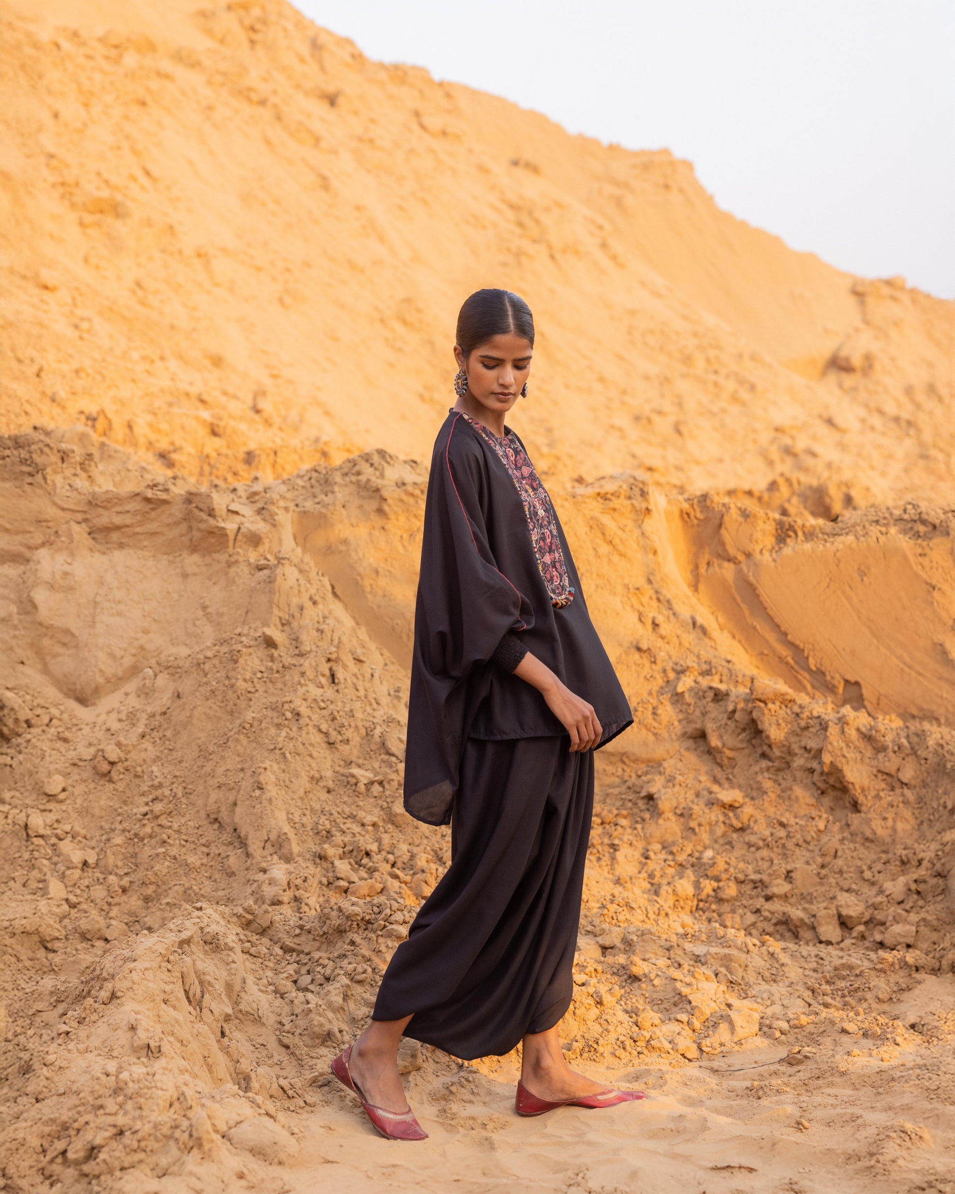 A contemporary reimagination of classic drapes, these black harem pants bring effortless movement and comfort to modern dressing. Crafted in soft, flowy fabric, the design features layered pleats and a tapered hem that create a fluid yet structured silhouette.