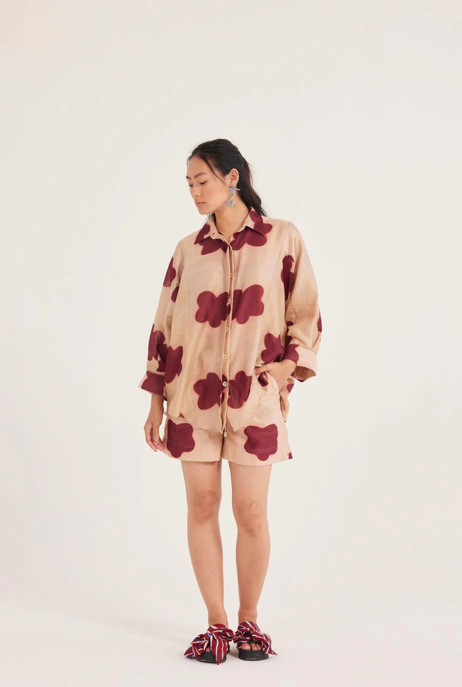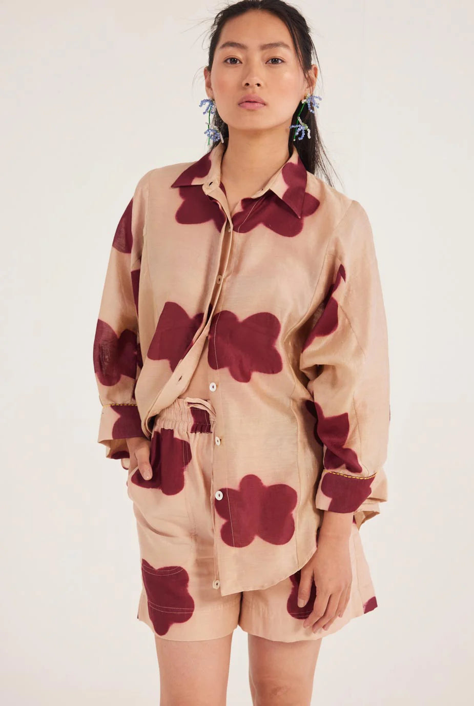The slouchy, slightly oversized fit of this clamp dyed muslin-silk-shirt feels effortlessly chic. Crafted in soft, flowy fabric that feels like second skin, it features an asymmetric hemline and an interesting back detail with a cute hand embroidery you can’t miss.