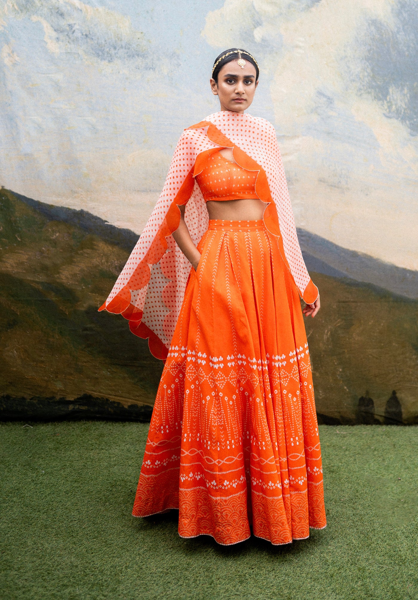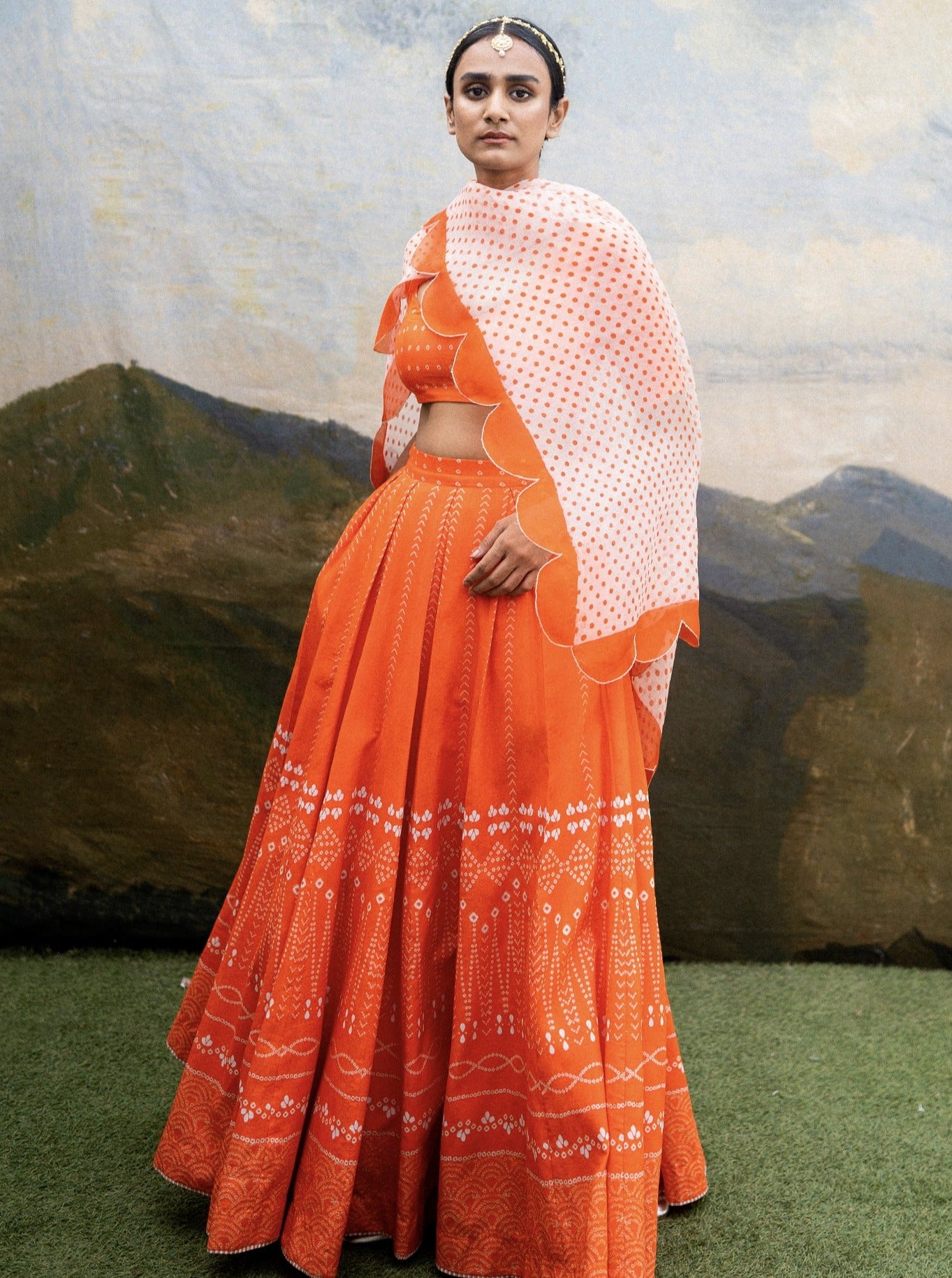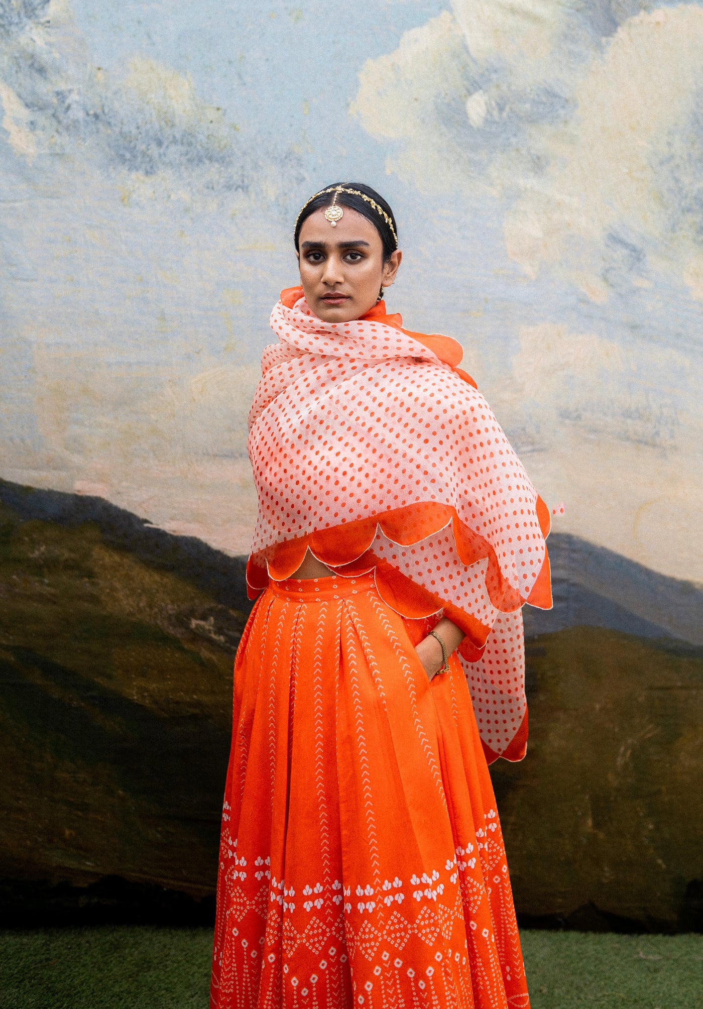 The  Naranghi Lehenga features the heritage classic bandhani. and is paired with an all over bandhani blouse and handblock printed  scalloped polka dot dupatta. The dupatta is finished with a zari scalloping.