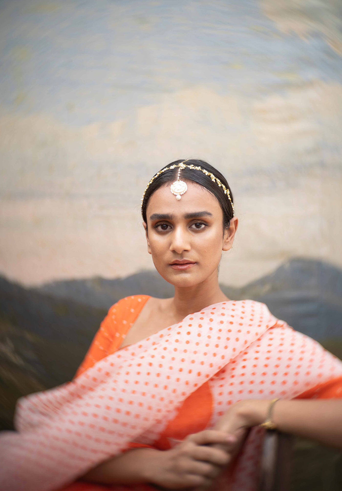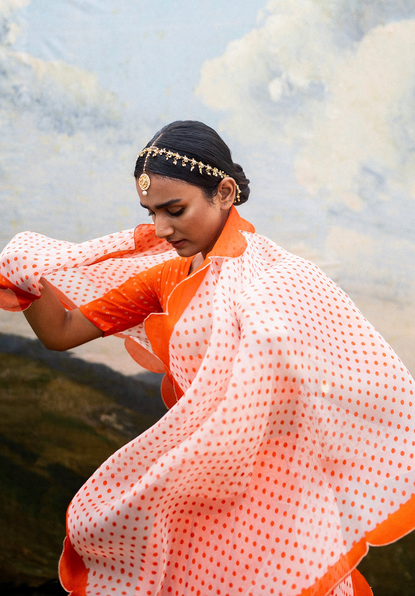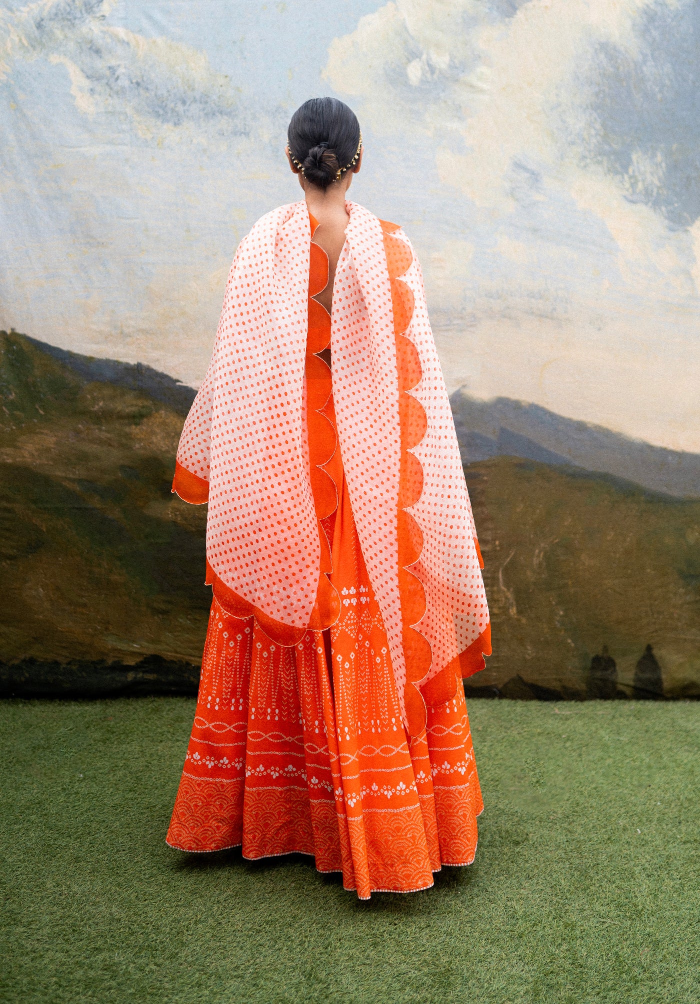 The  Naranghi Lehenga features the heritage classic bandhani. and is paired with an all over bandhani blouse and handblock printed  scalloped polka dot dupatta. The dupatta is finished with a zari scalloping.