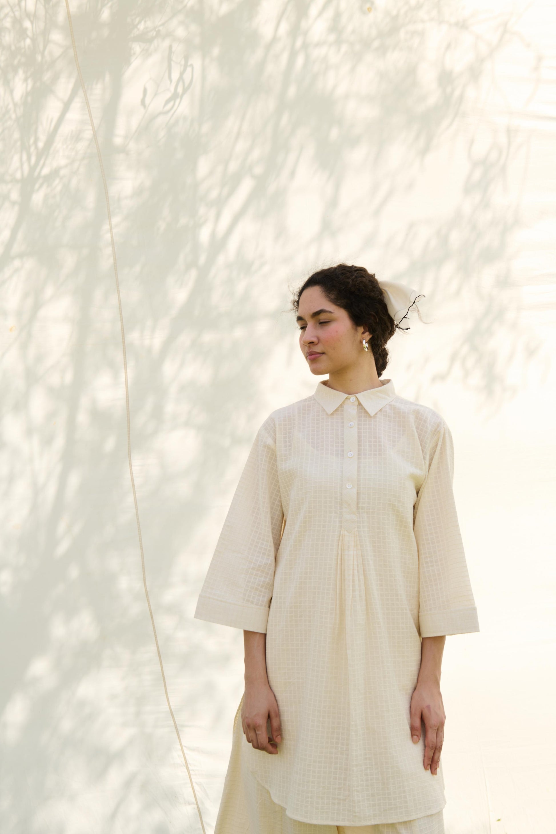 The Nargis coord set is crafted from our linen cotton high low tunic in our checkered cotton fabric with our balloon panelled pants.