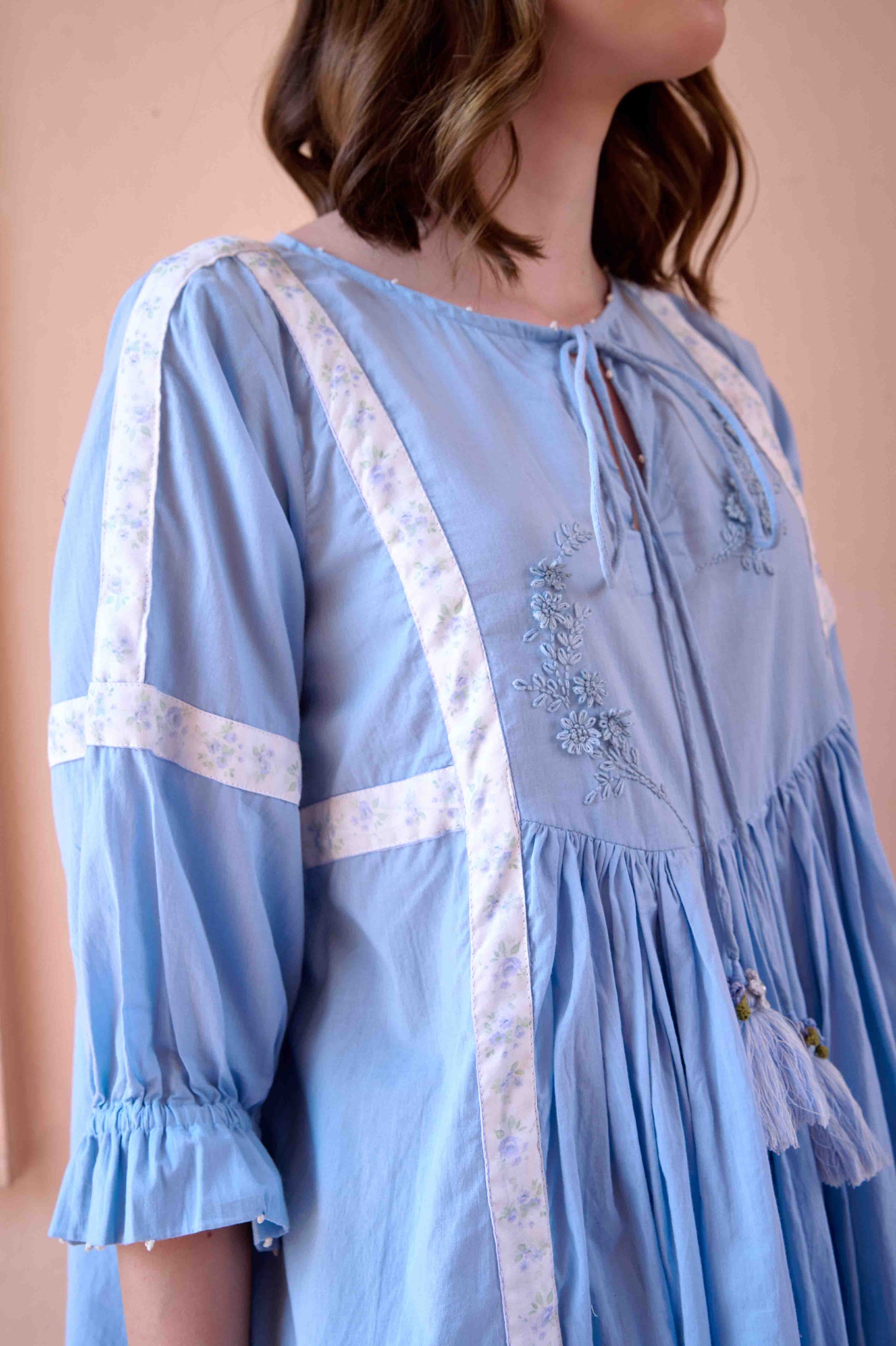 Introducing our Mini Dress, a captivating blend of charm and elegance that effortlessly captivates. This dress is adorned with intricate lace and contrast border details, enhancing its silhouette with a touch of sophistication. The embroidery detail on the yoke and puffed sleeves accentuates its feminine allure, while knots on the neckline and sleeves add a playful and stylish accent. A standout feature is the addition of tassels with crochet flower details, creating a whimsical and intricate focal point.