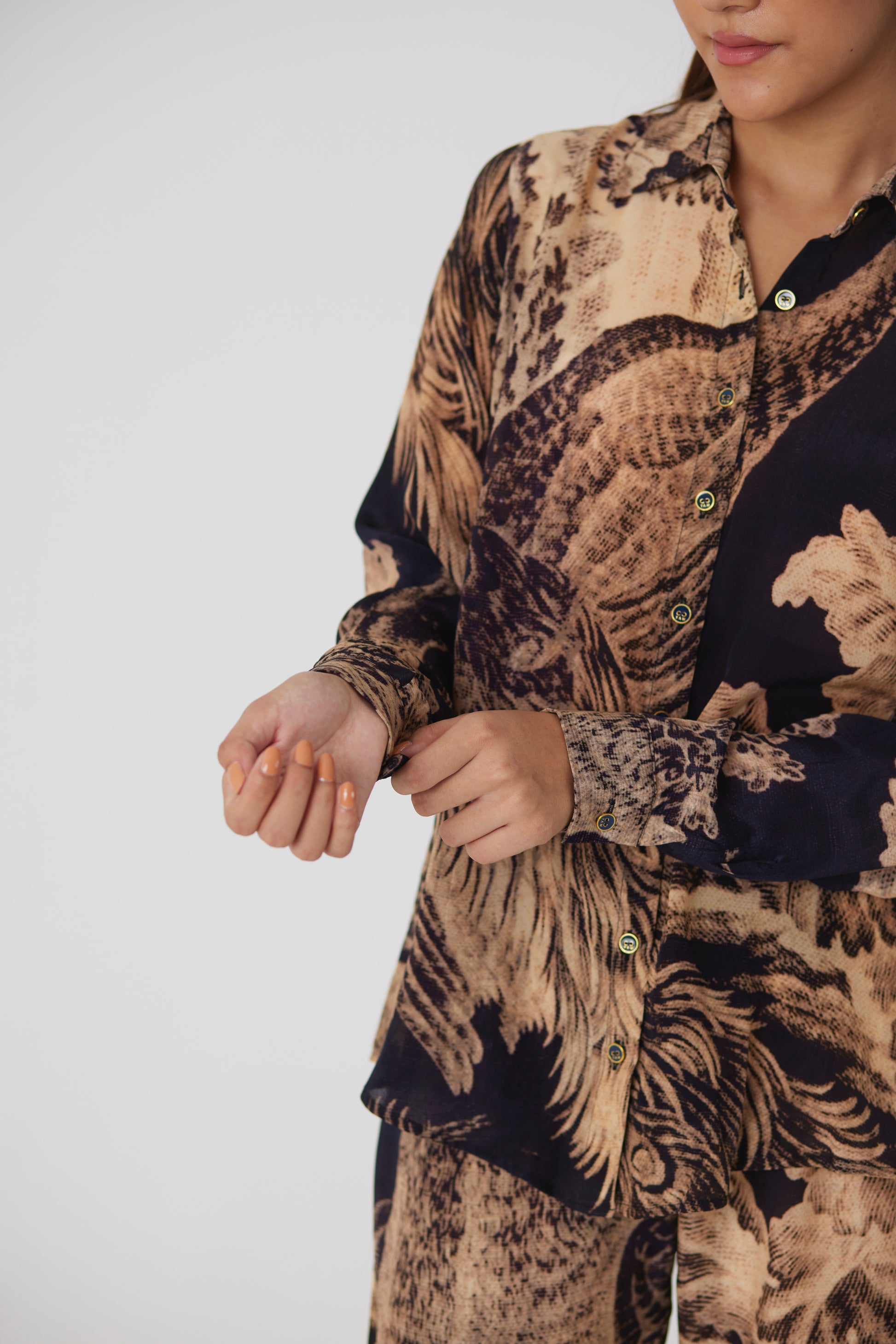 This print features a MOR(peacock) with intricate details and bold lines in the navy colour. This set is made of Morni prints carefully printed on crepe. The set includes a button down shirt with straight pants.