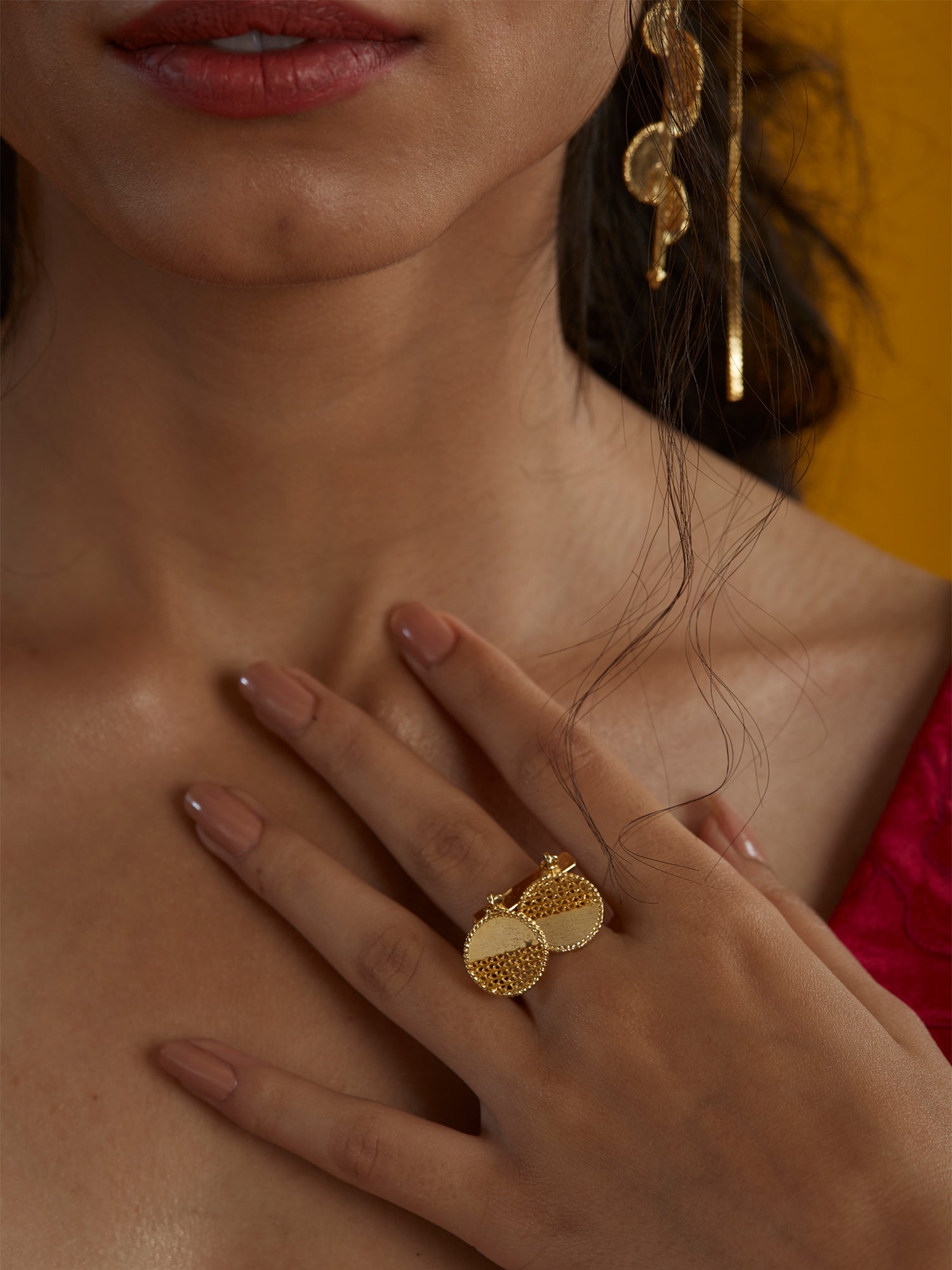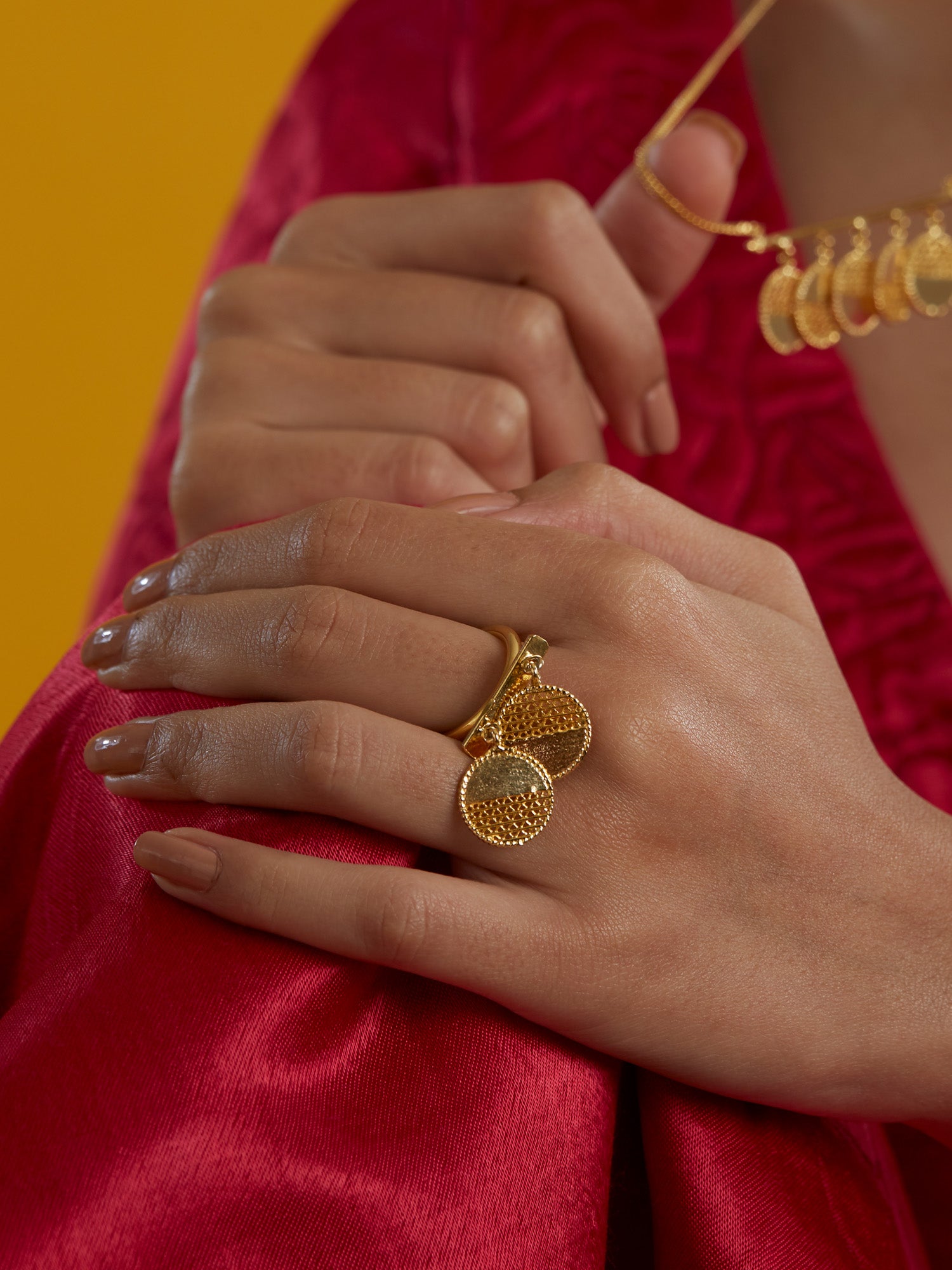Inspired by the south-Indian 'Kasumala' (Literally - Coin necklace), the Nebula ring is a playful piece with intricately handcrafted, moving units. Adjustable sizing.