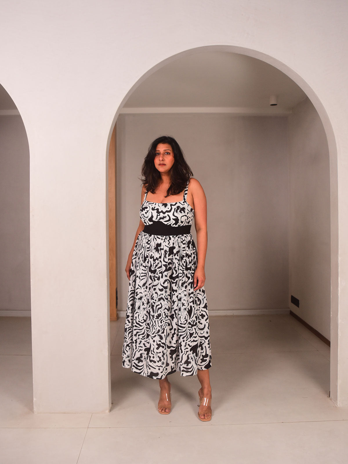 Blank a statement that moves with you. This dress is cut in our exclusive black and white hand-screen printed modal cotton. The dress features padded bodice , gathers and pockets below the yoke which makes the dress not only stylish but also ensures maximum comfort and flexibility . Pair it up with some gold bracelete and necklace stack to elevate the look .blank