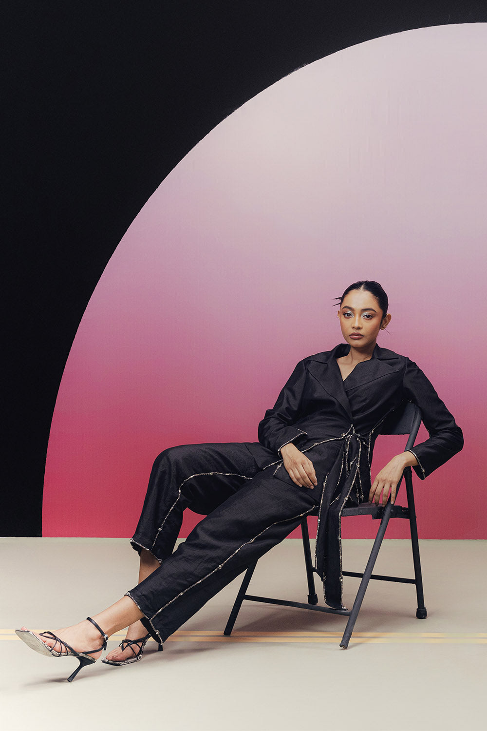 Handwoven silk blazer set with bead and stonework, embroidery on the seams and a belted detail on the side.