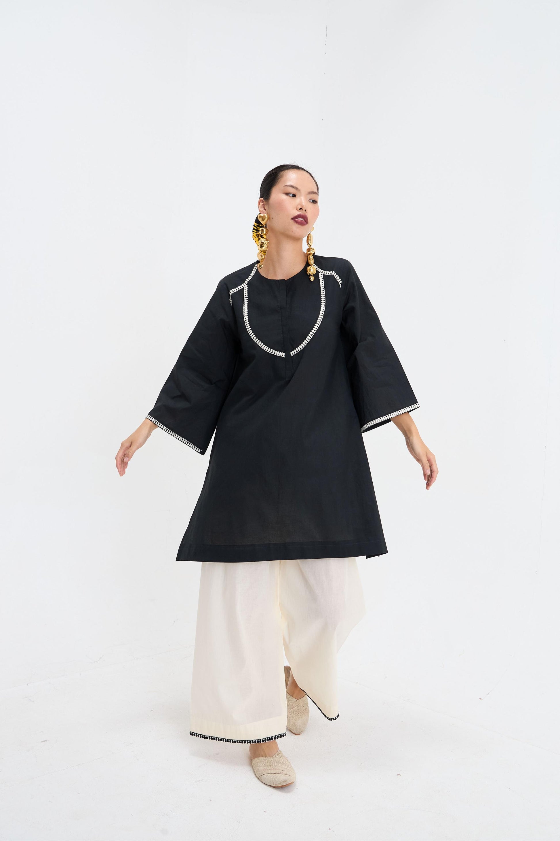 Channel timeless elegance with this retro-inspired cotton cambric set. Featuring a short black kurta with intricate hand embroidery reminiscent of vintage designs and paired with wide, relaxed off white pants, this ensemble combines nostalgic charm with modern comfort. Perfect for a statement look with effortless style.