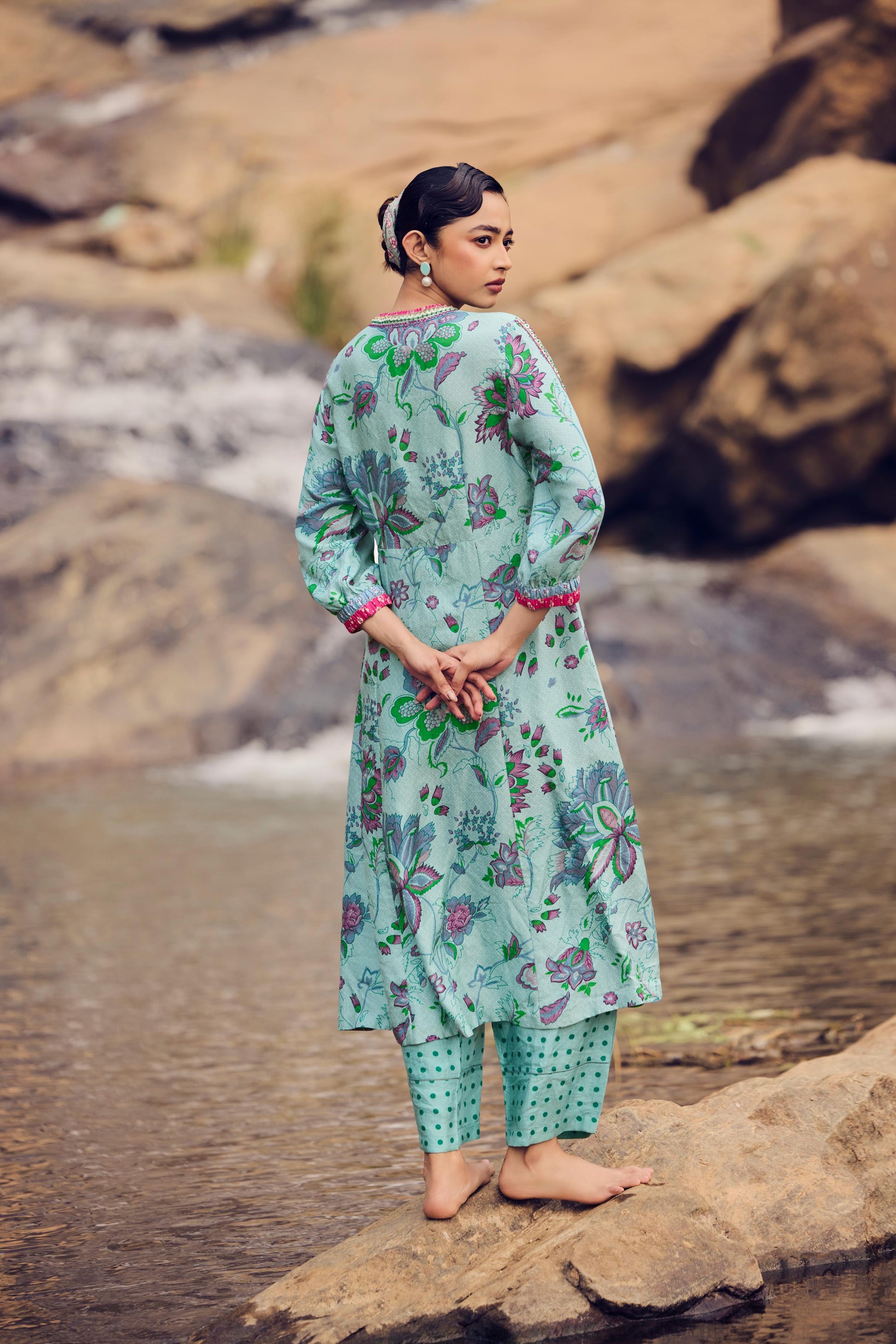 Pale blue hand woven, hand printed mulberry silk yoke cut kurta, embroidery detail on front, back and sleeves paired with pants.