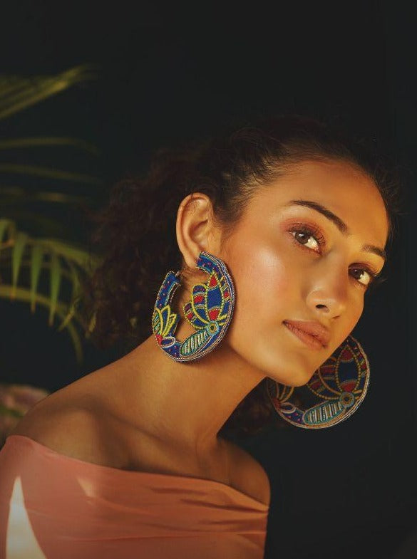Handmade and hand embroidered hoop earrings with madhubani inspired lotus design. Intricately embroidered with silk threads and beads. Earrings are embroidered on both sides. Light weight and easy to carry.