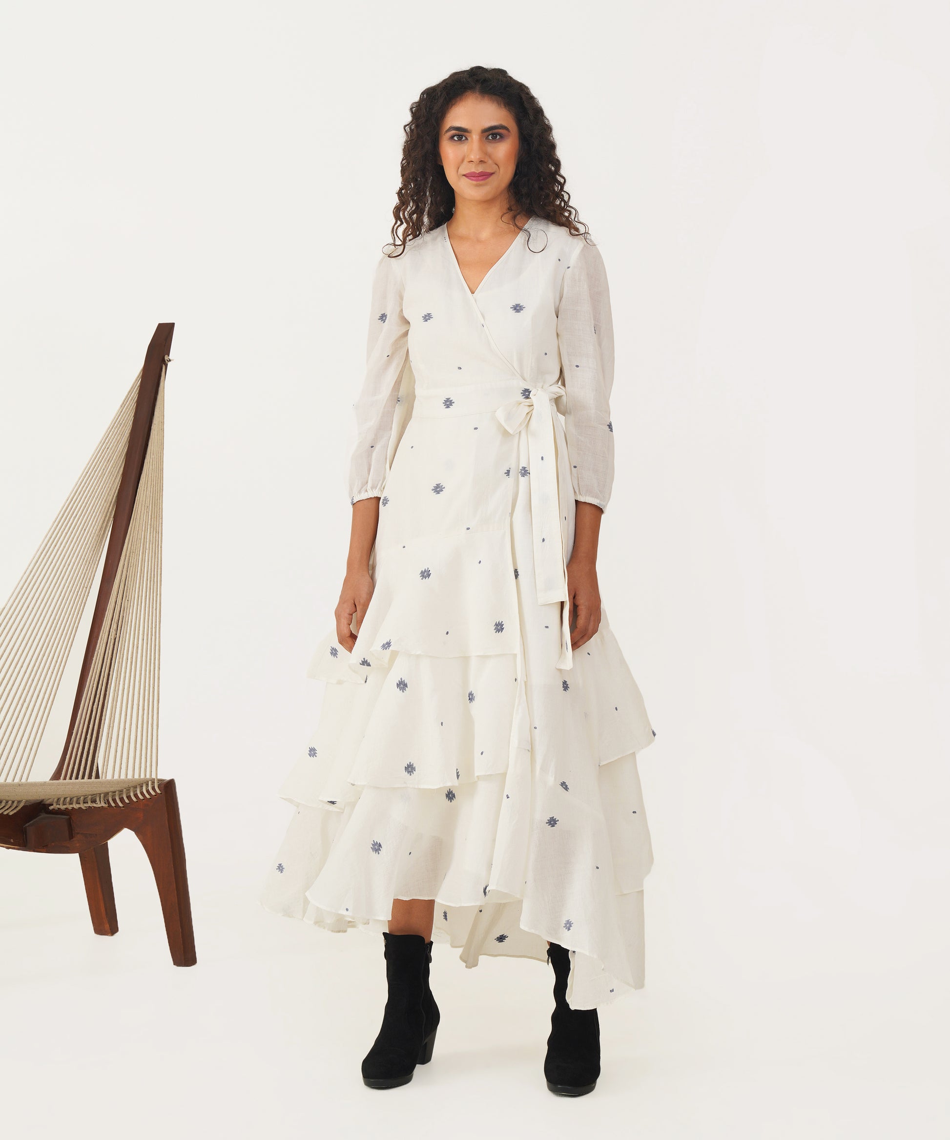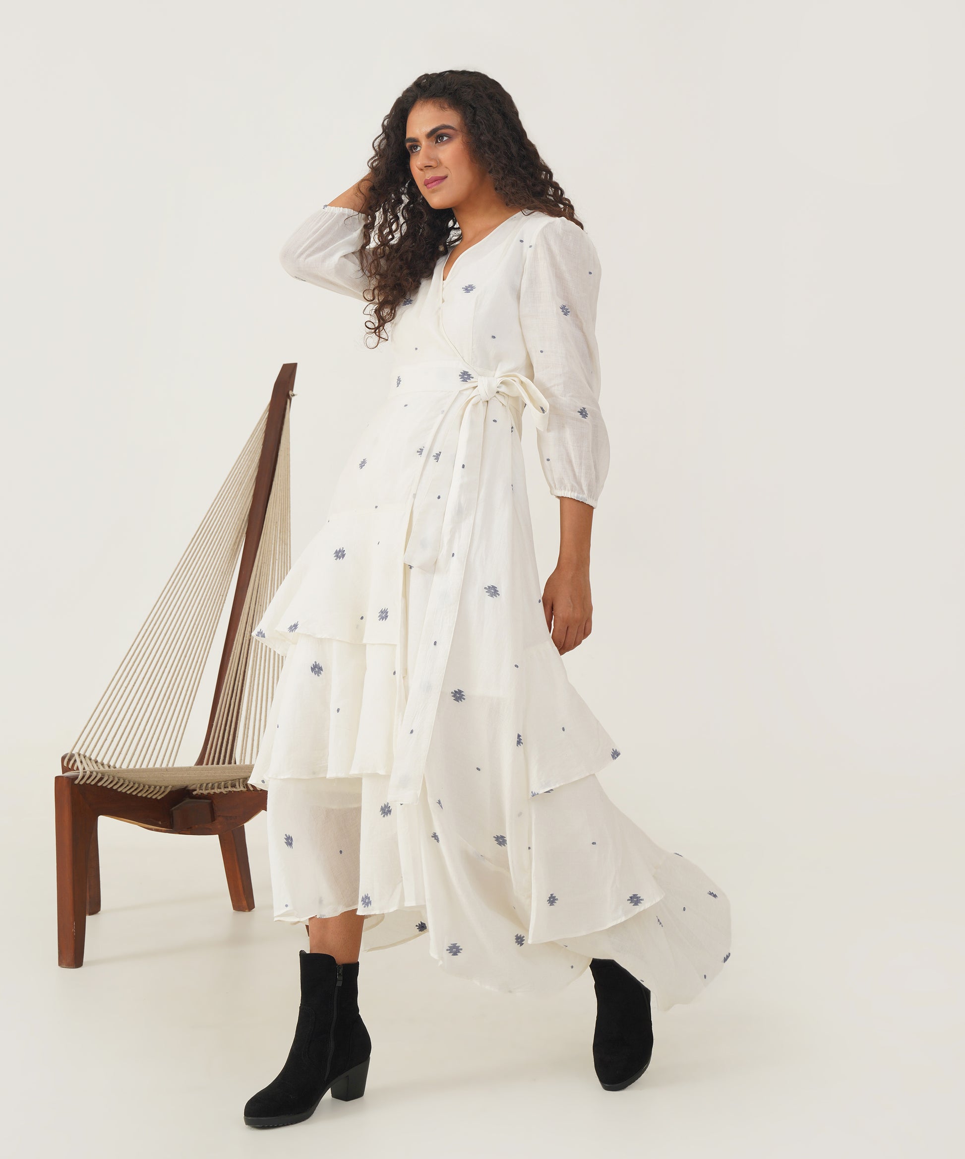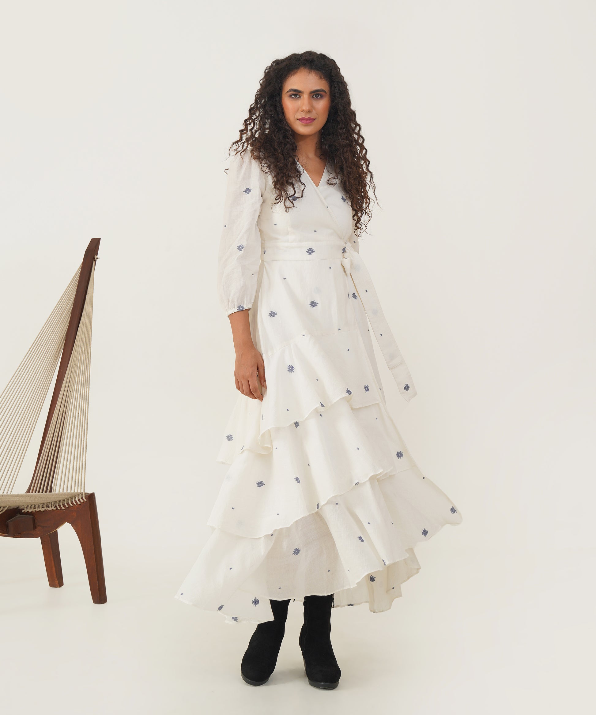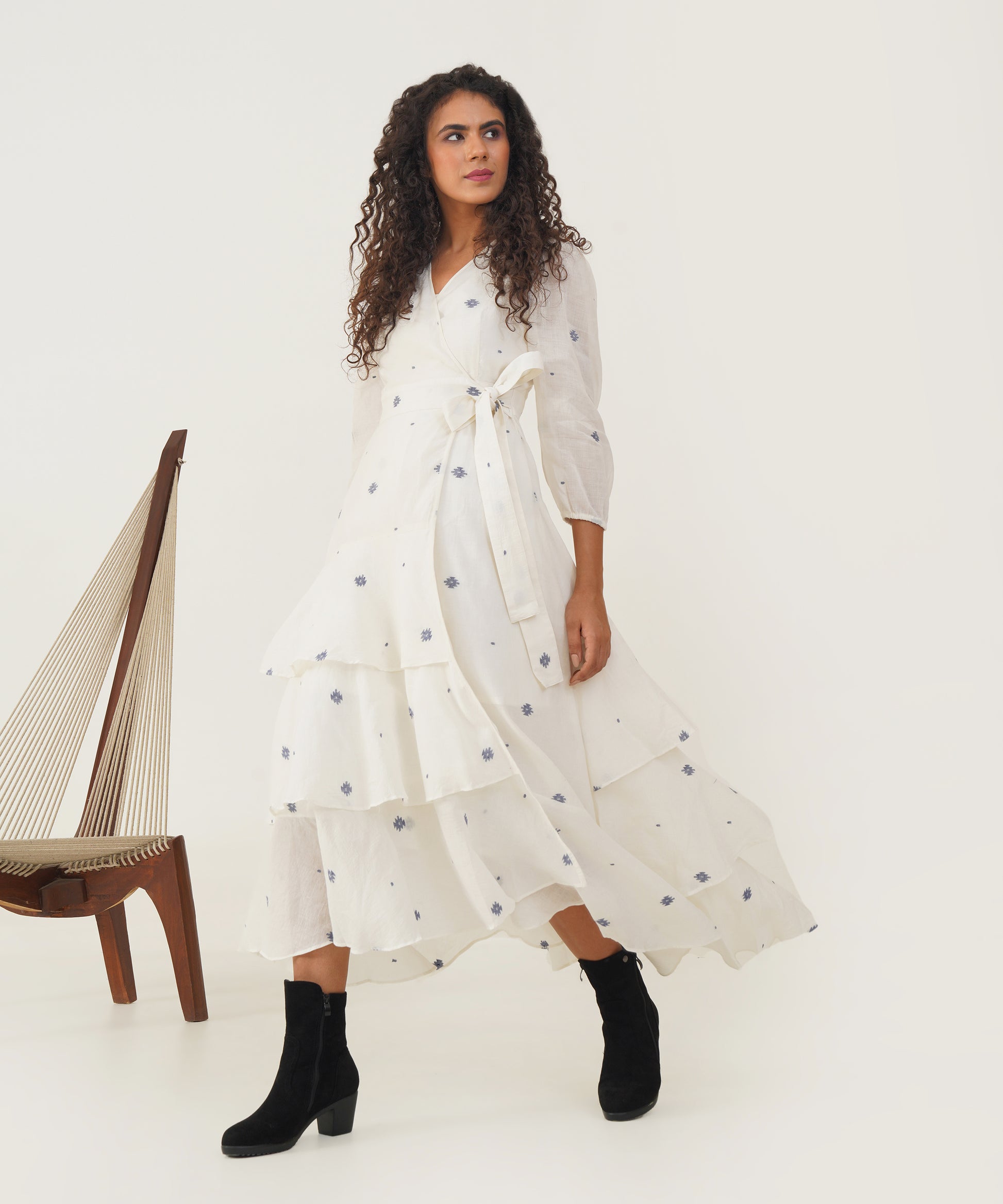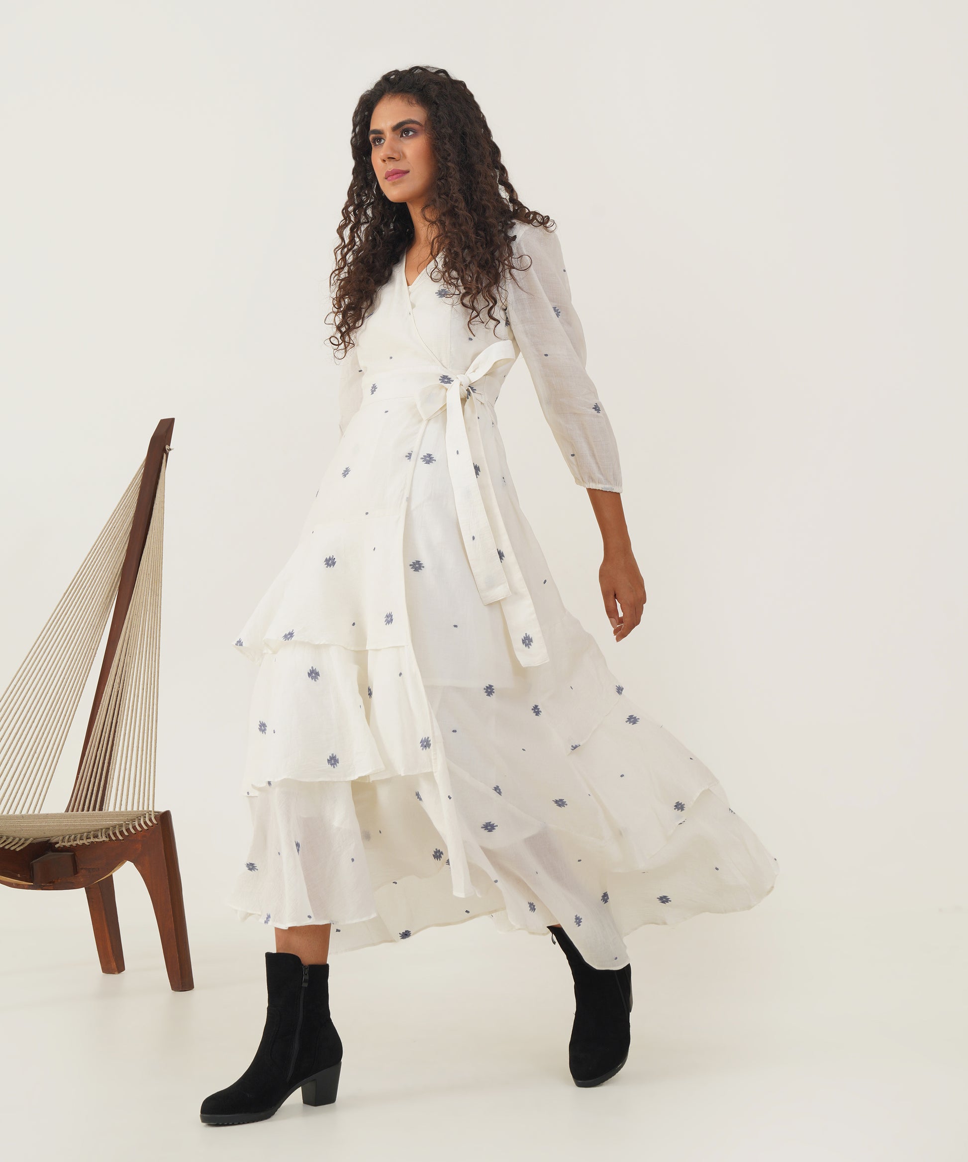 Experience timeless elegance with our classic wrap dress, designed to capture attention with its tiered silhouette and flowing movement. The long sleeves with elastic cuffs provide a sophisticated touch, while the waist tie allows for a custom, flattering fit. The asymmetric ruffled hem adds a dynamic, graceful flair that dances with every step. For enhanced versatility and comfort, this dress is thoughtfully paired with an additional slip.