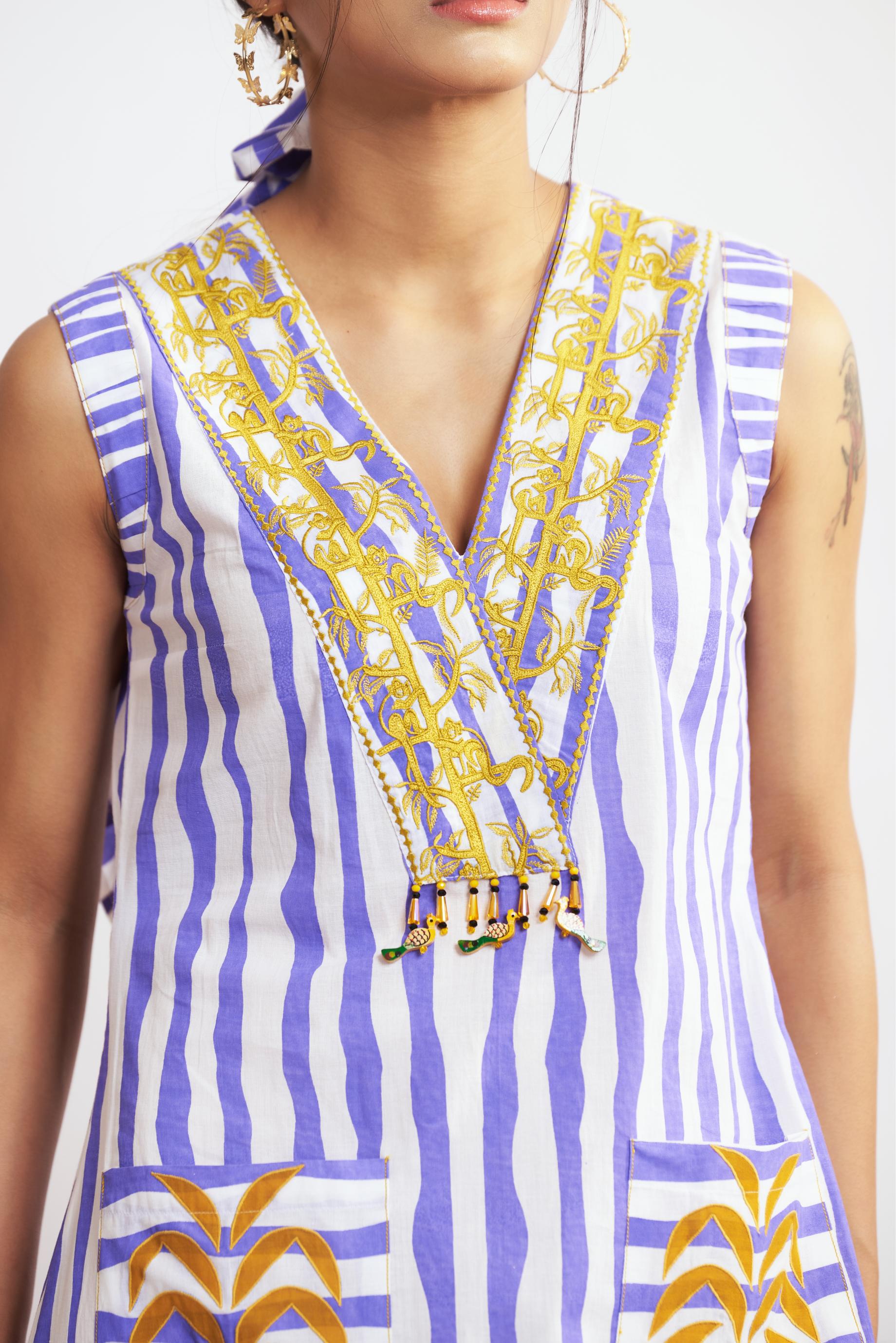 The long straight summer dress with strip print featured with embroidered V neck and patch pocket. The dress boasts a straight silhouette, flowing elegantly down to the ankle featured with fringes details, crafted from lightweight and breathable 100% cotton which can be styled with sandals or wedges for a casual daytime look.