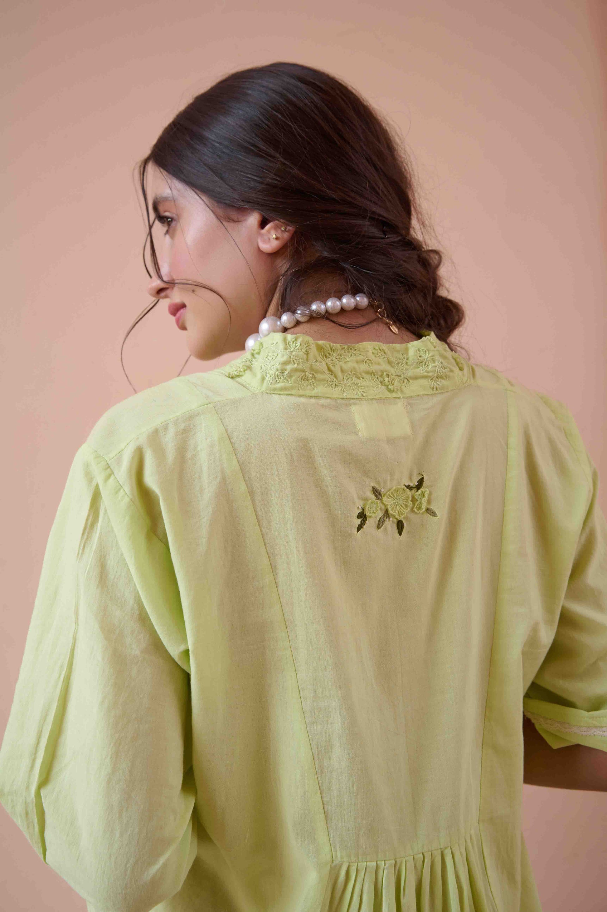 Embrace effortless elegance with our designed to captivate with every detail. Featuring a flattering V neckline adorned with tone-on-tone embroidery, this dress exudes understated sophistication. Organza flower details delicately enhance the neckline, adding a touch of texture and charm. The sleeves are adorned with intricate lace detail, further enhancing its feminine allure.