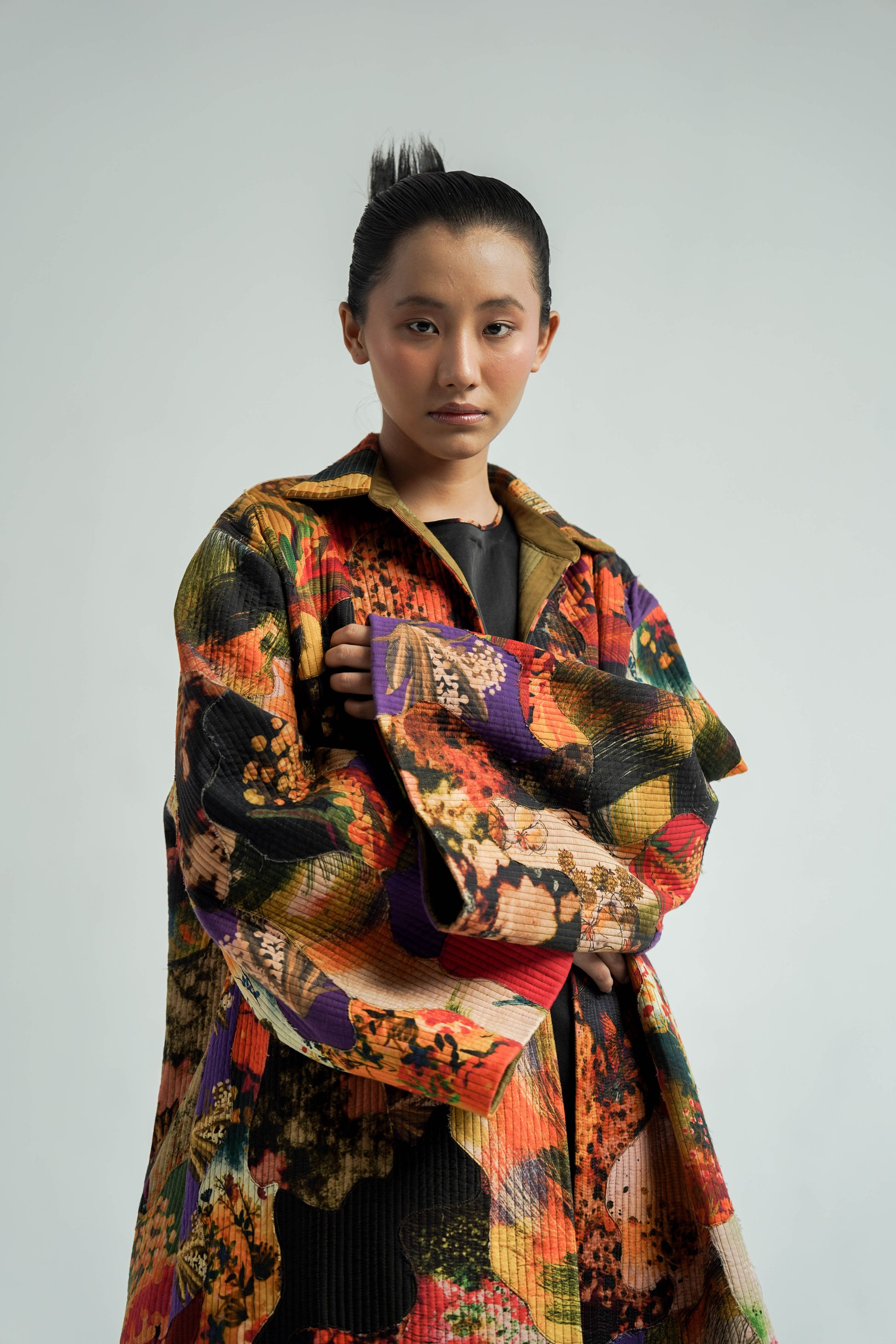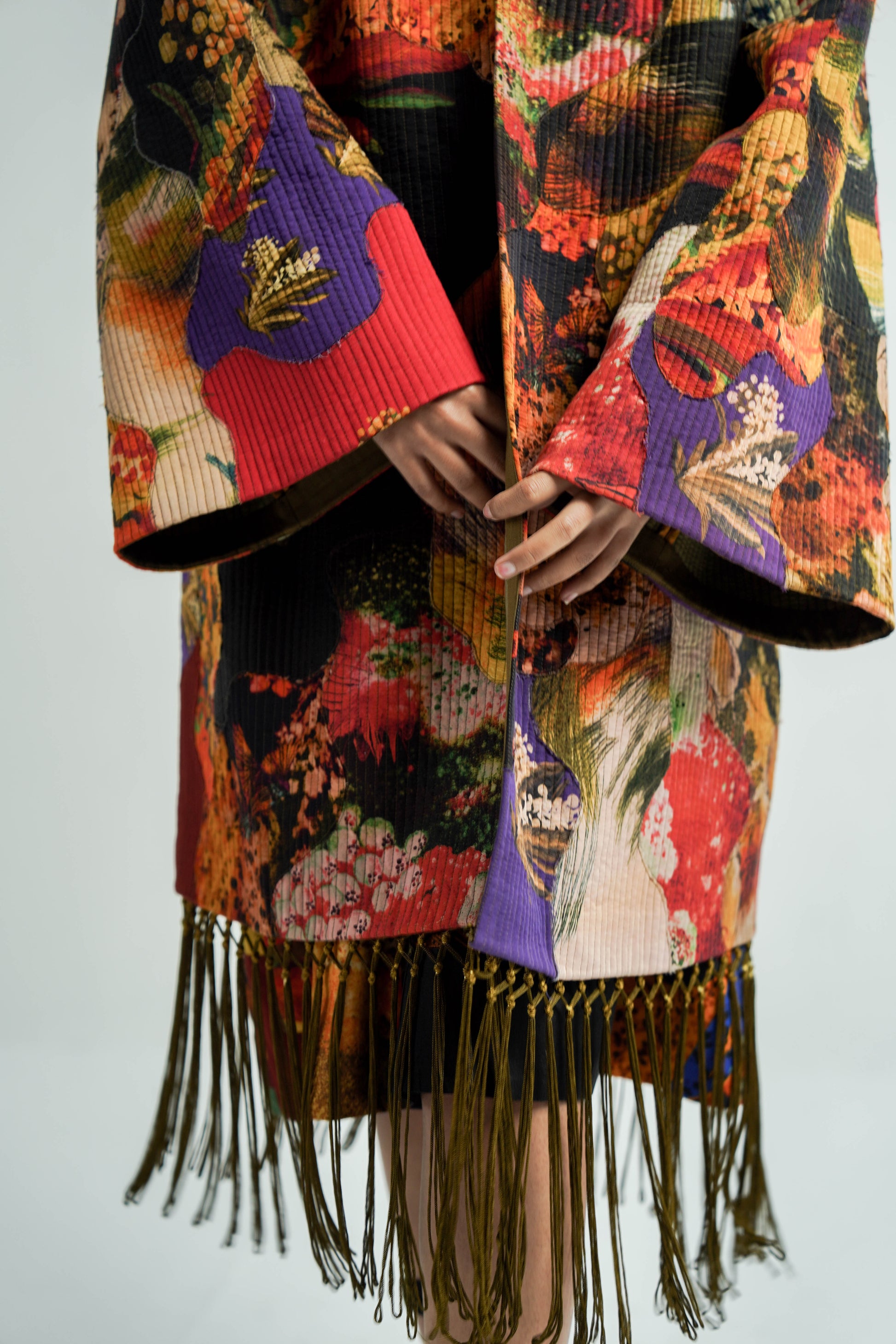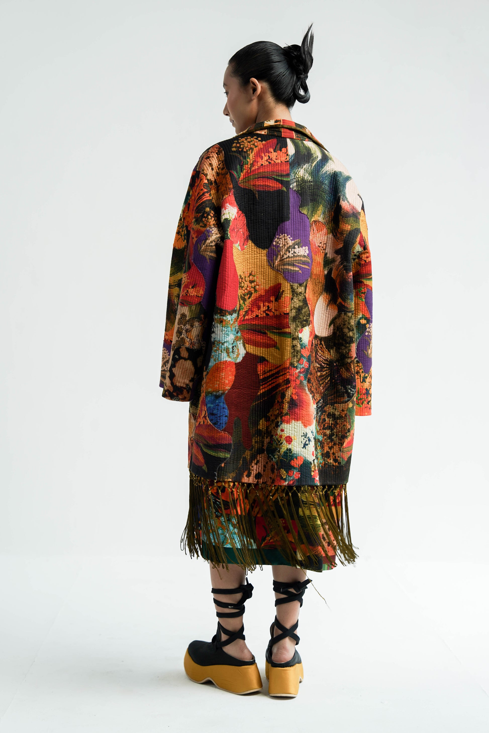 This patchwork oversized jacket is made with the leftover fabric peices joined in an abstract shape creating a texture. it is finished with contrast detail alongwith a fringe detail at the hem.