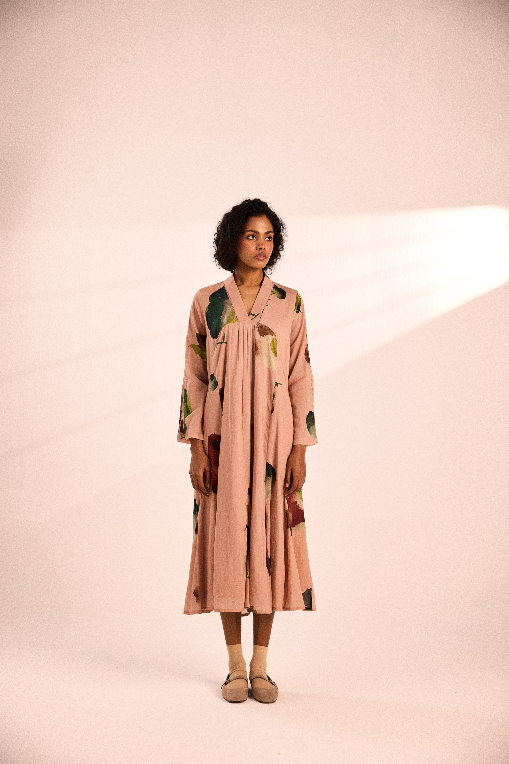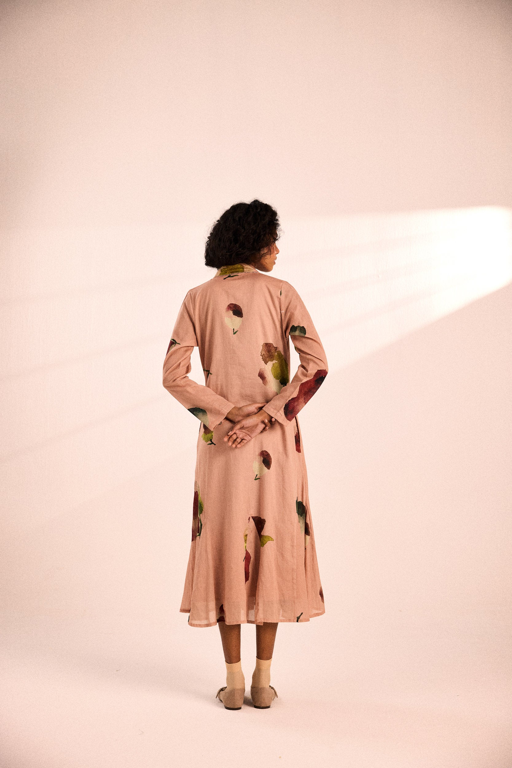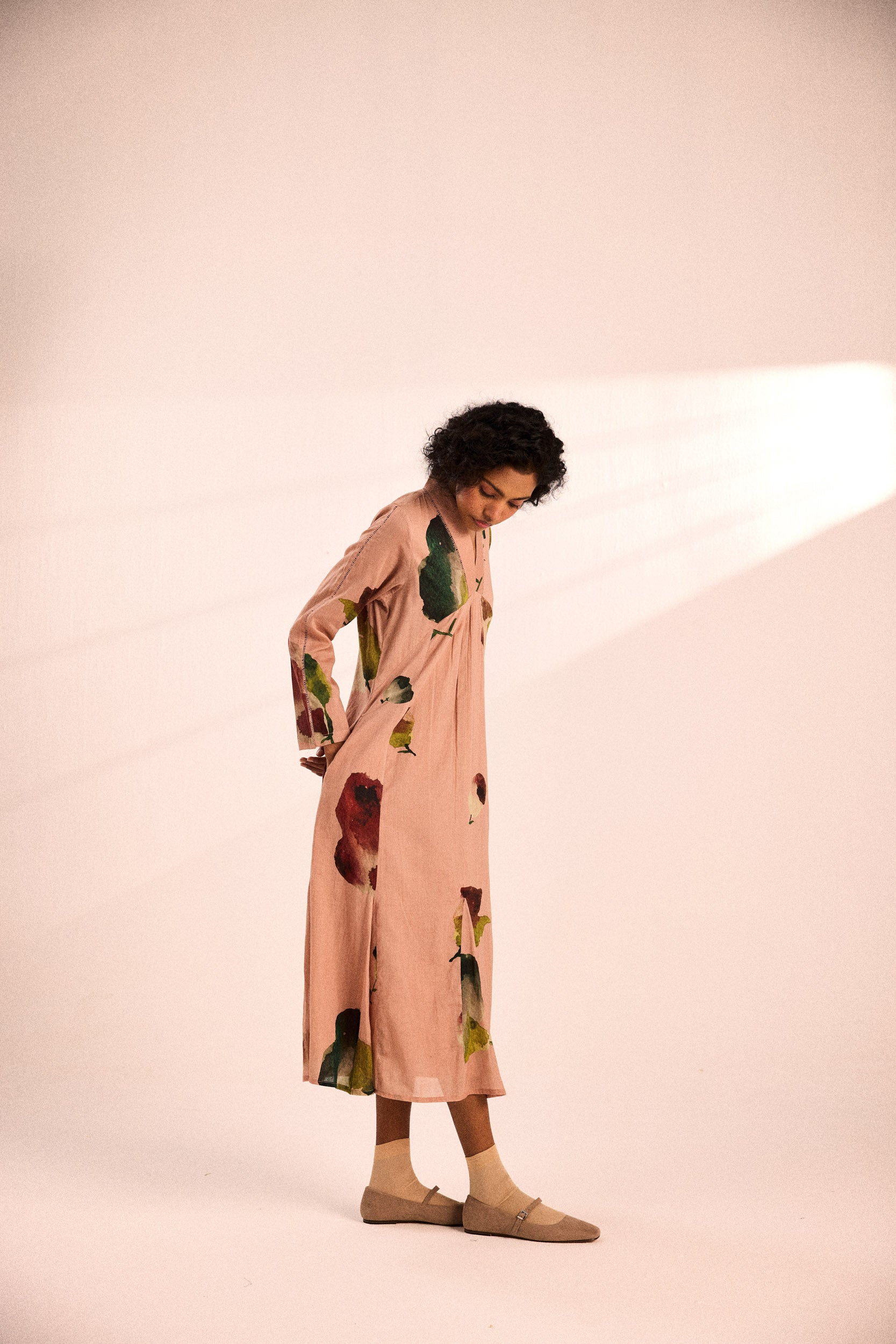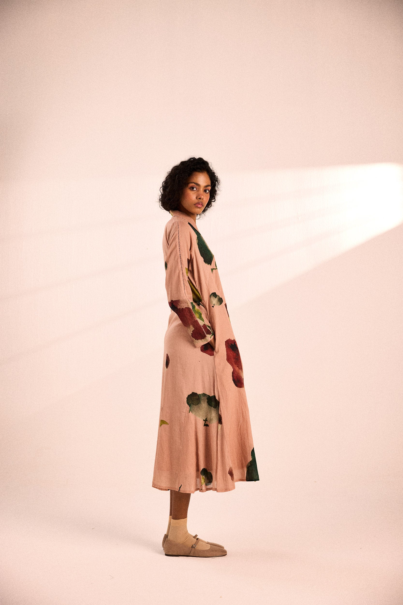 A midi dress in a blush hue, featuring a V-neckline, ladder lace detailing along the neckline and sleeves, and abstract watercolor-inspired prints.
