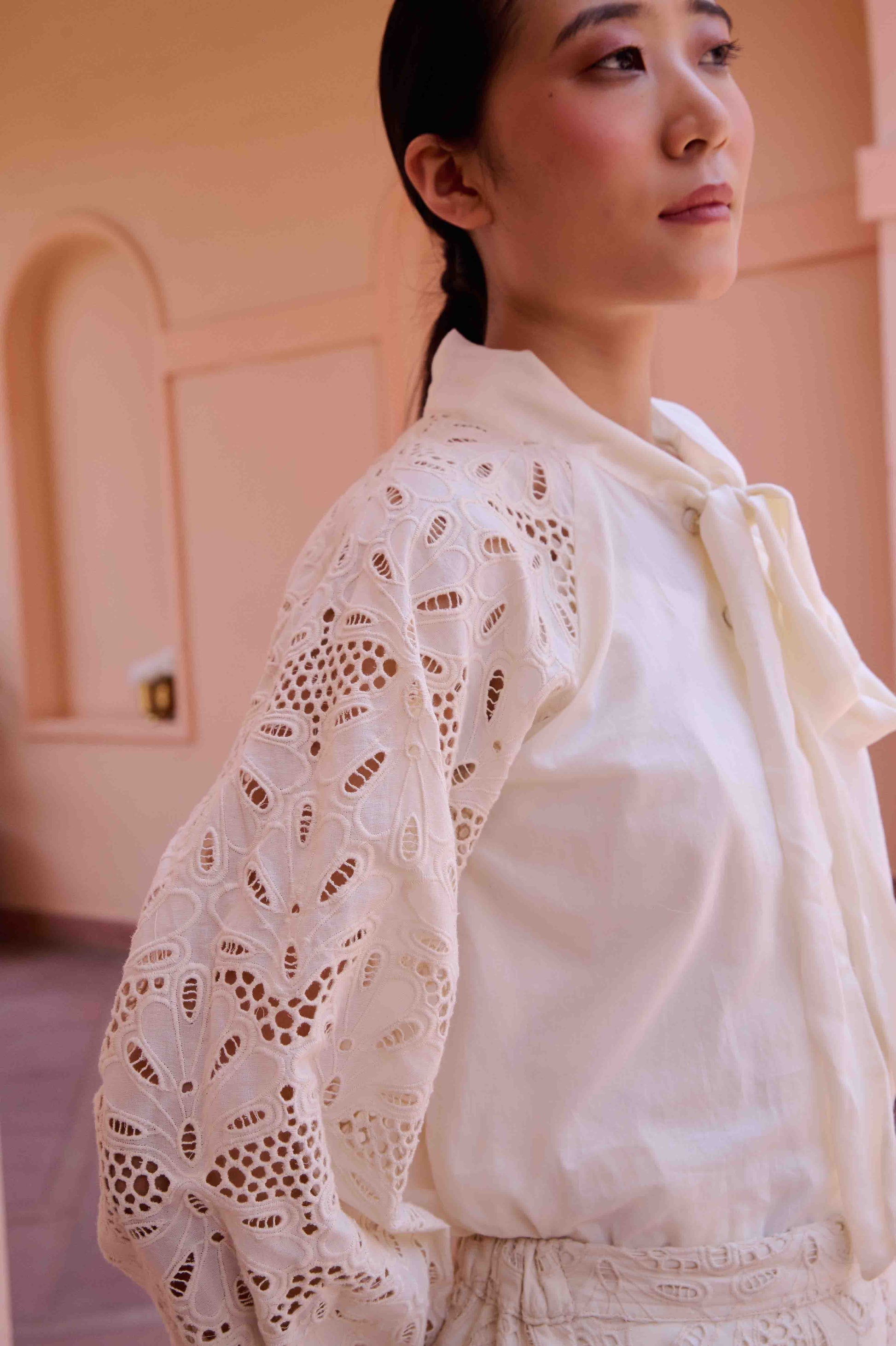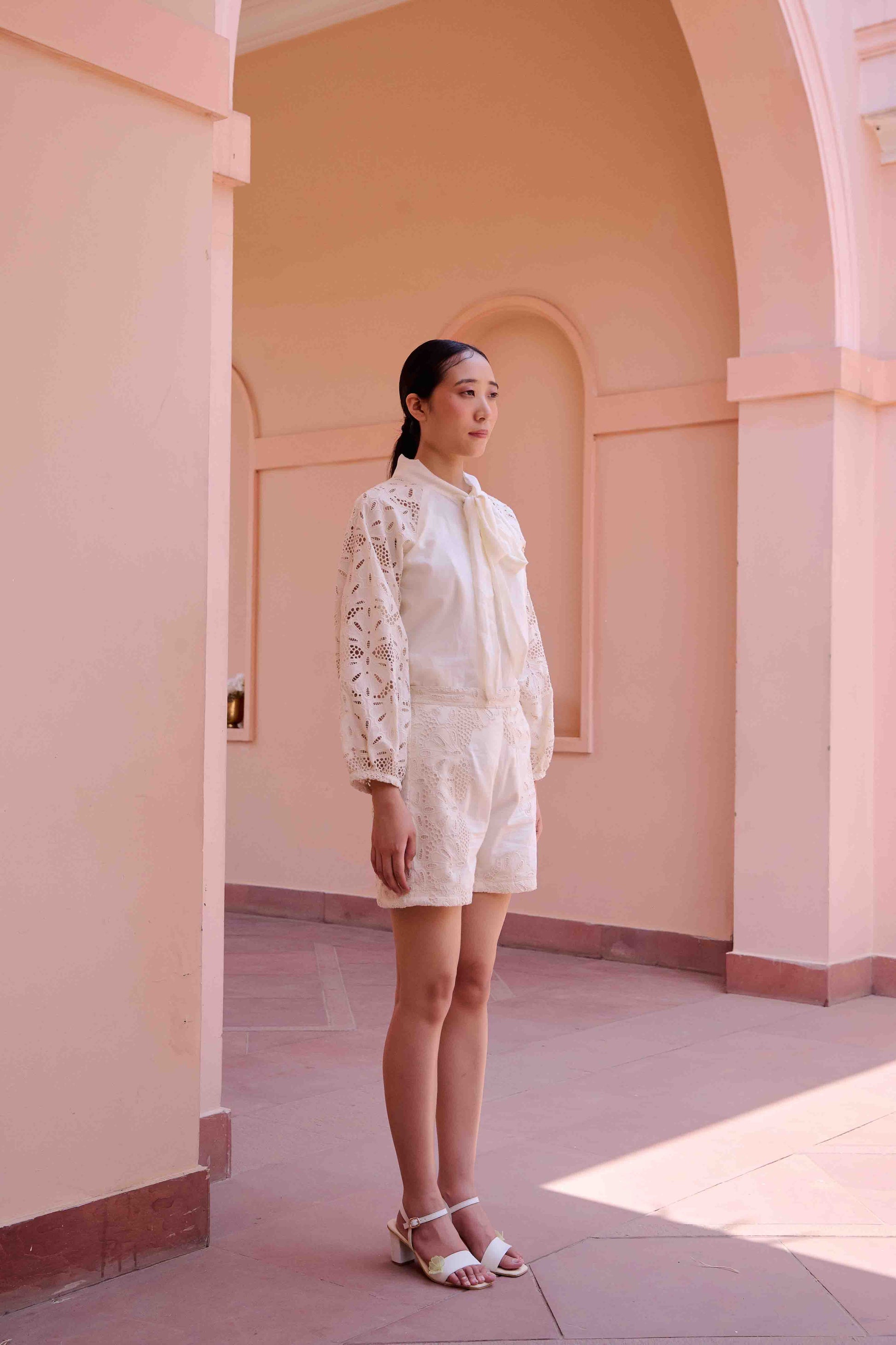 Introducing our Cutwork Set, combining chic style with intricate craftsmanship for a polished ensemble. The shirt features cutwork sleeves and a bow collar, exuding sophistication and charm. Applique buttons complete the look, adding a touch of elegance and refinement. The shorts complement the shirt with cutwork details, offering a contemporary and cohesive aesthetic.