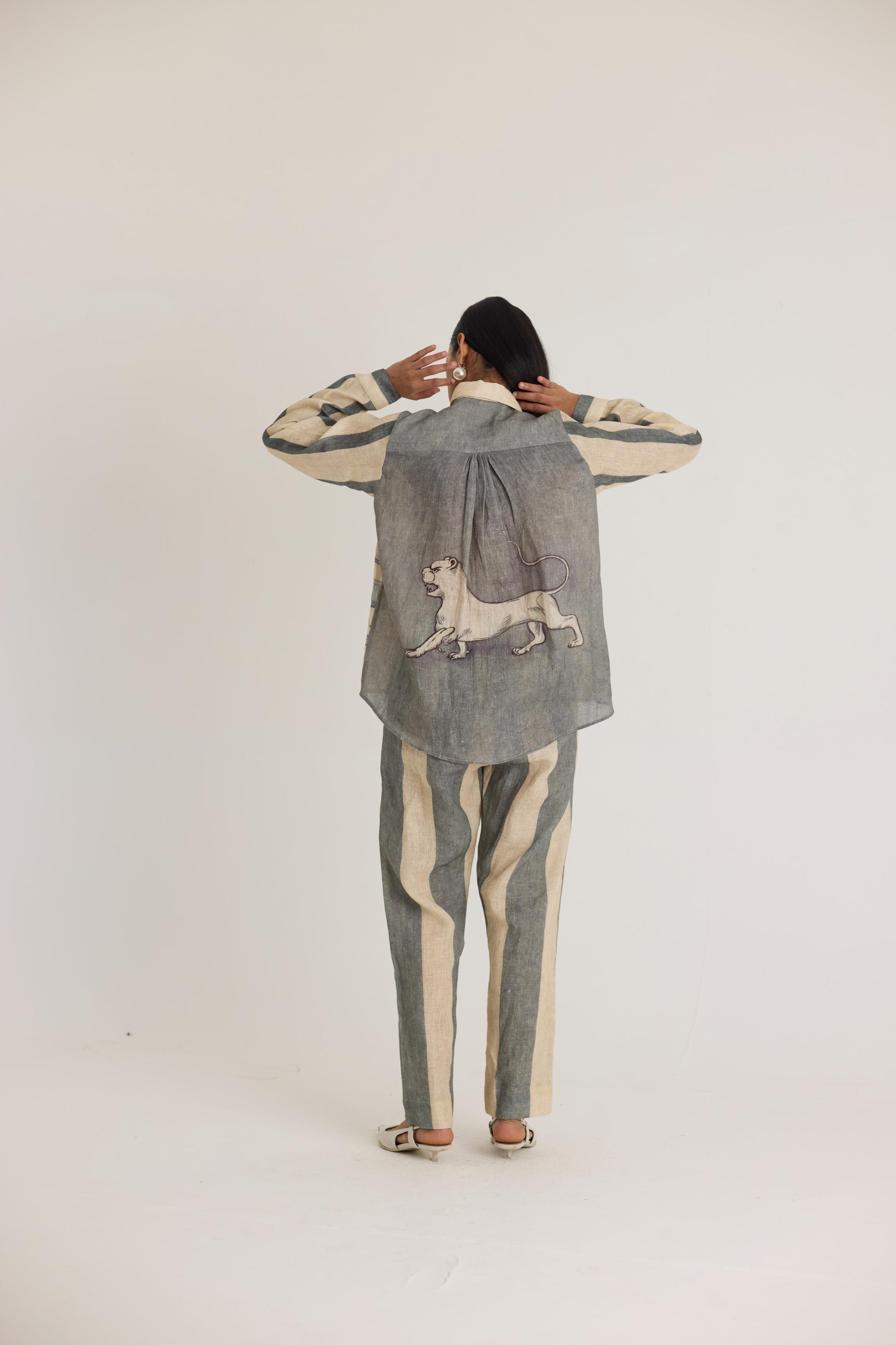 This ensemble features a striking mythical lion motif on the shirt, symbolizing strength and heritage. The hand-drawn artwork is reminiscent of traditional folk art, lending a regal yet contemporary aesthetic. Complementing the detailed print, the trousers showcase bold vertical stripes in earthy tones, adding a structured and elongated silhouette.
