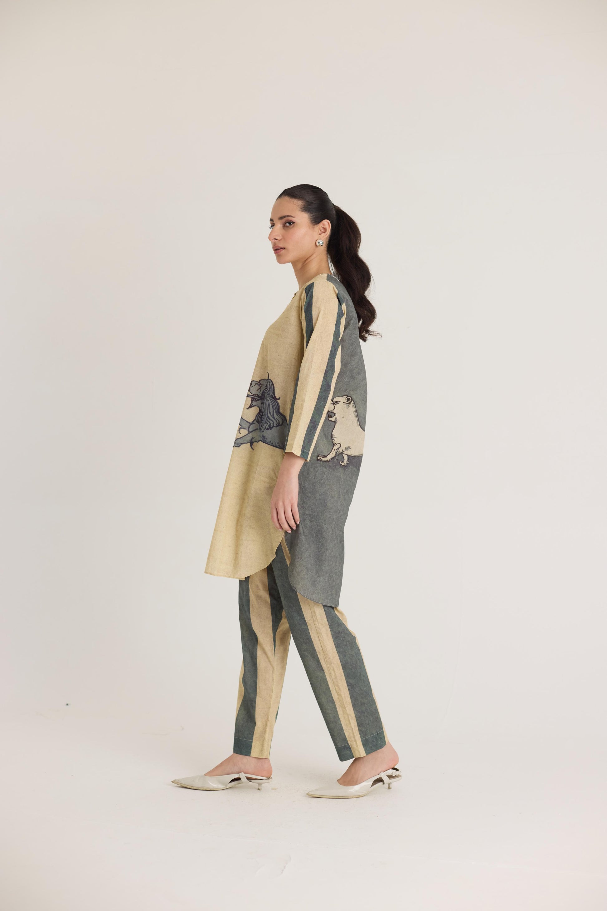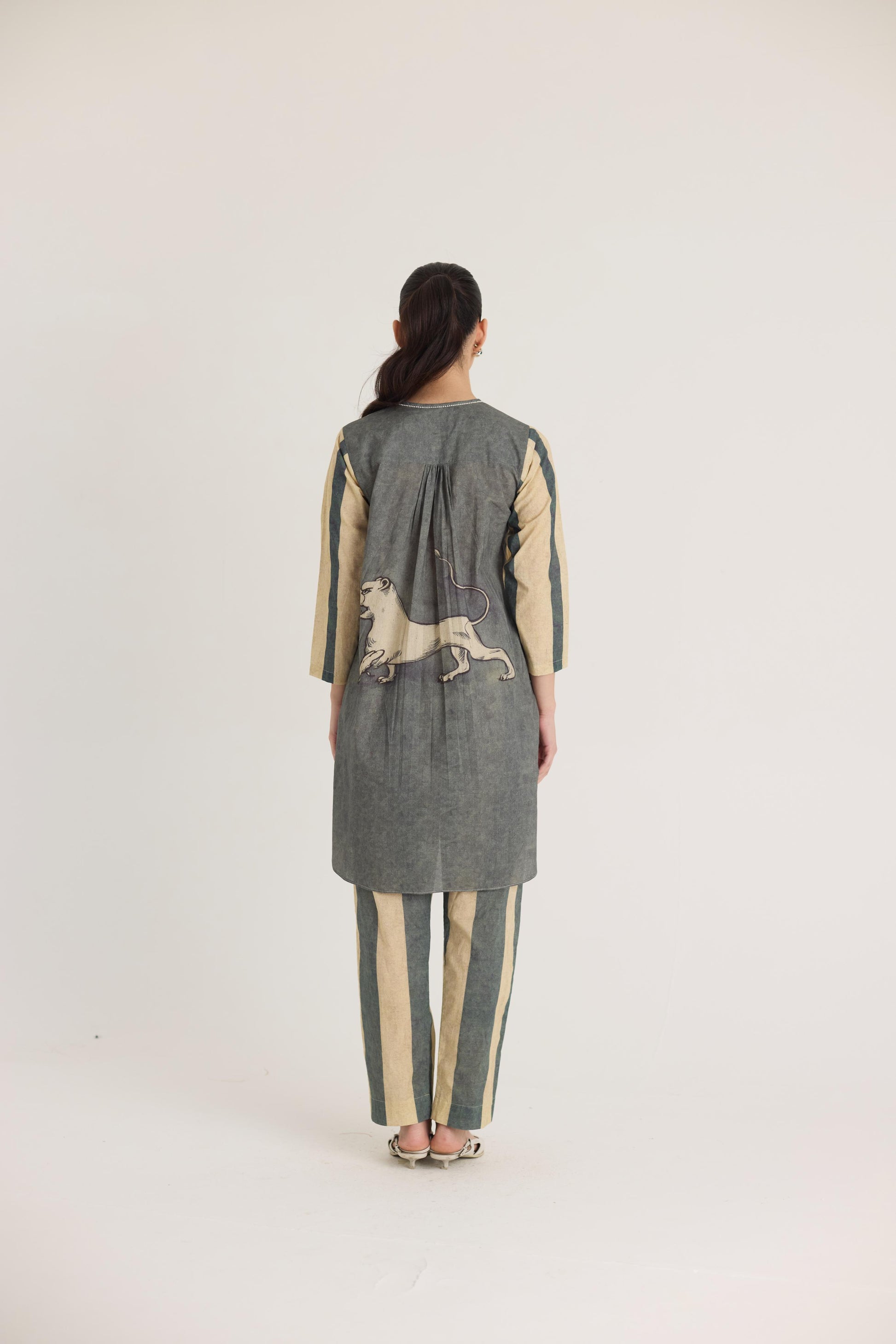 This ensemble features a striking mythical lion motif on the shirt, symbolizing strength and heritage. The hand-drawn artwork is reminiscent of traditional folk art, lending a regal yet contemporary aesthetic. Complementing the detailed print, the trousers showcase bold vertical stripes in earthy tones, adding a structured and elongated silhouette.
