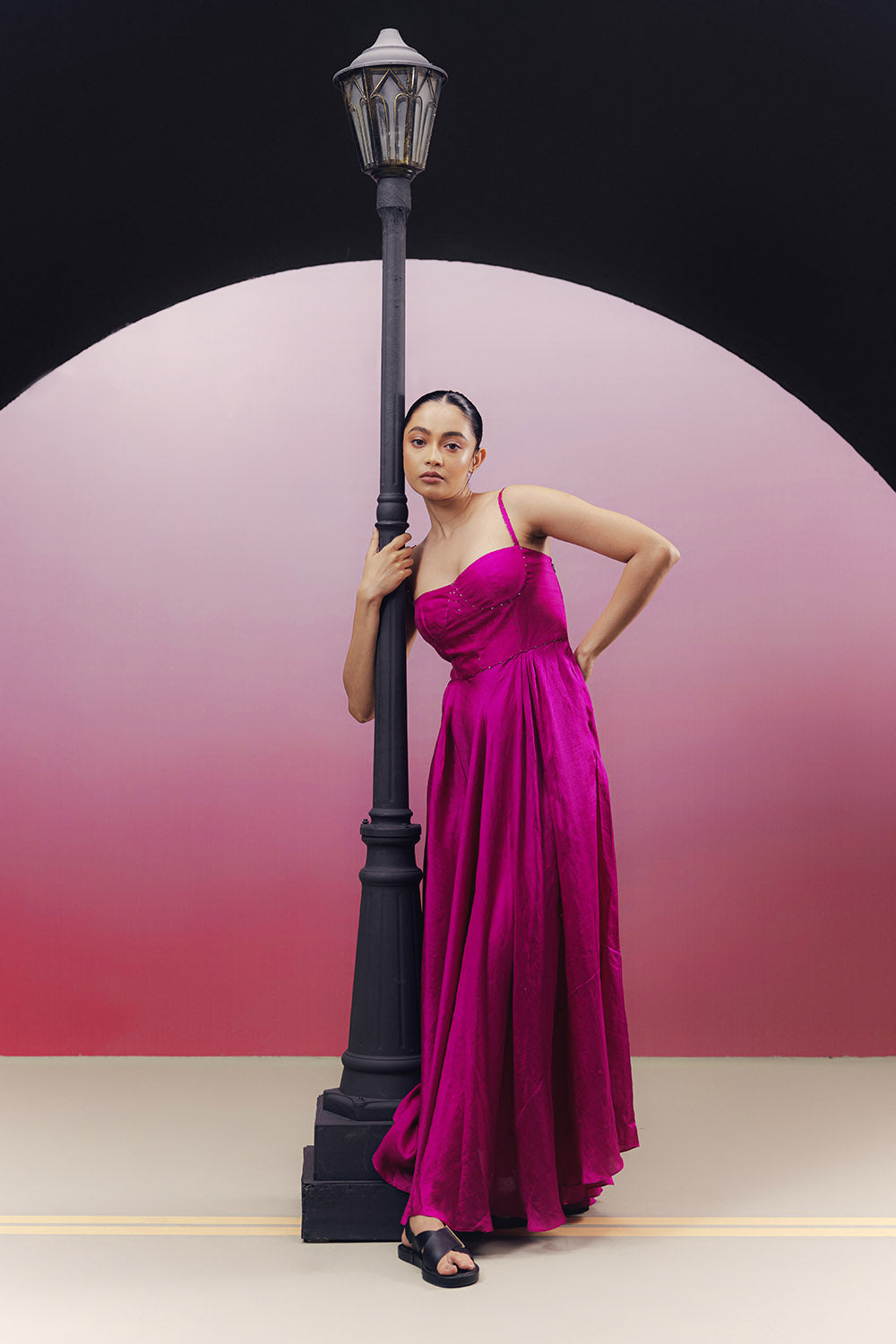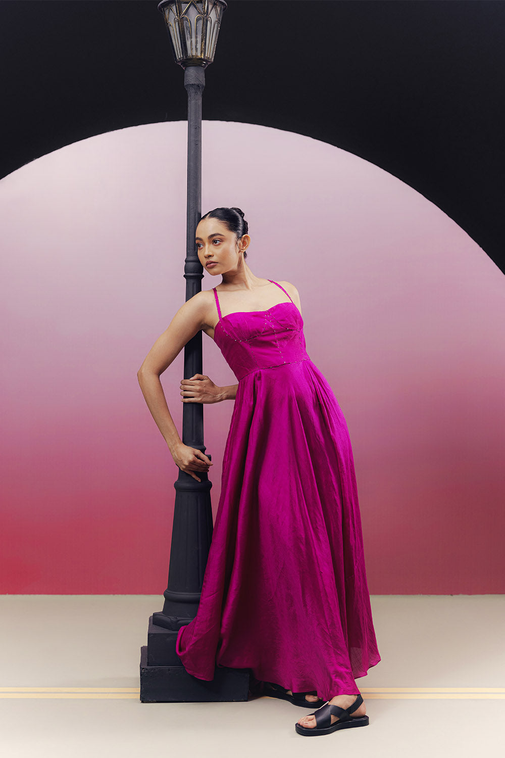 Handwoven silk corset style midi dress with beadwork edging along the bodice seams.