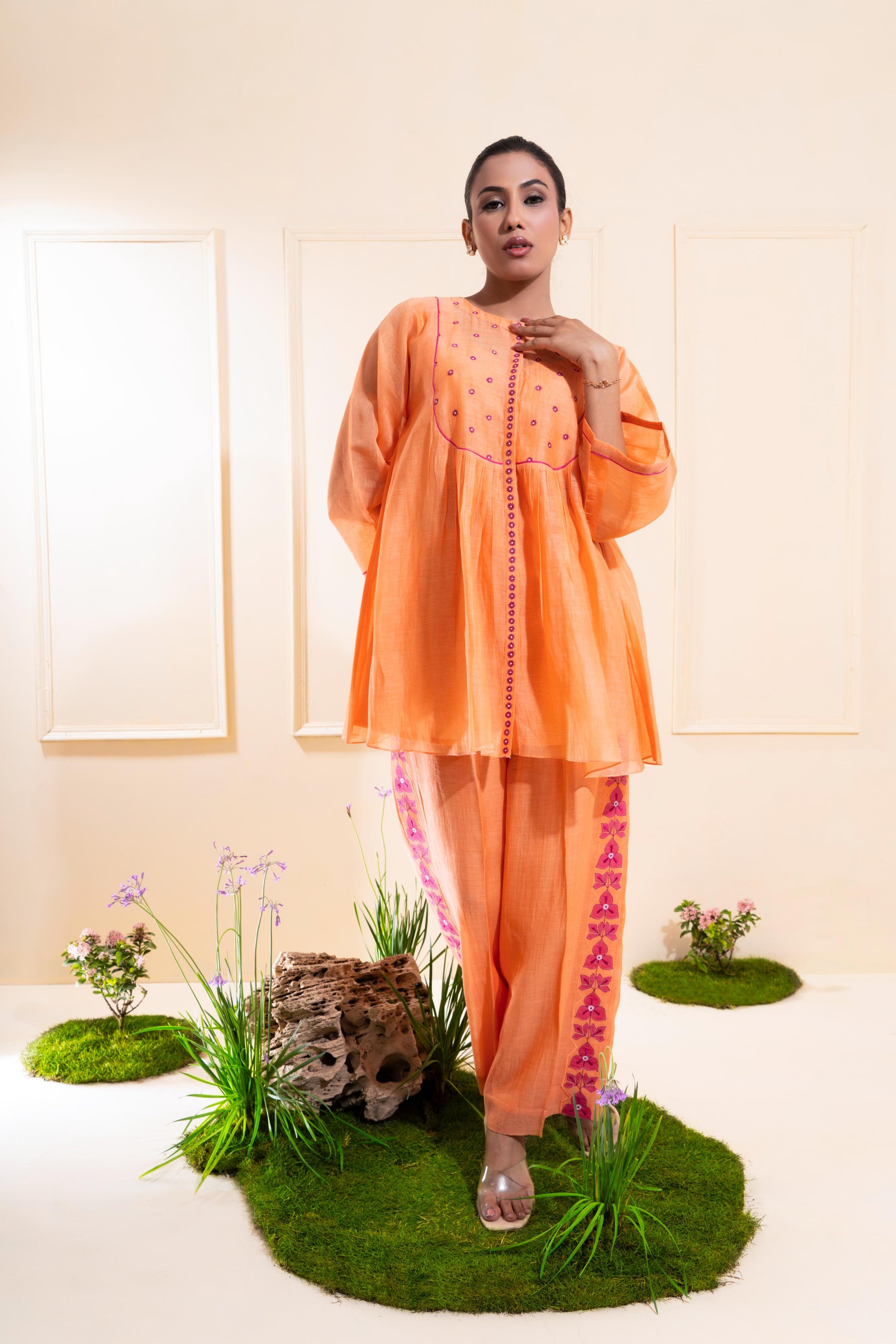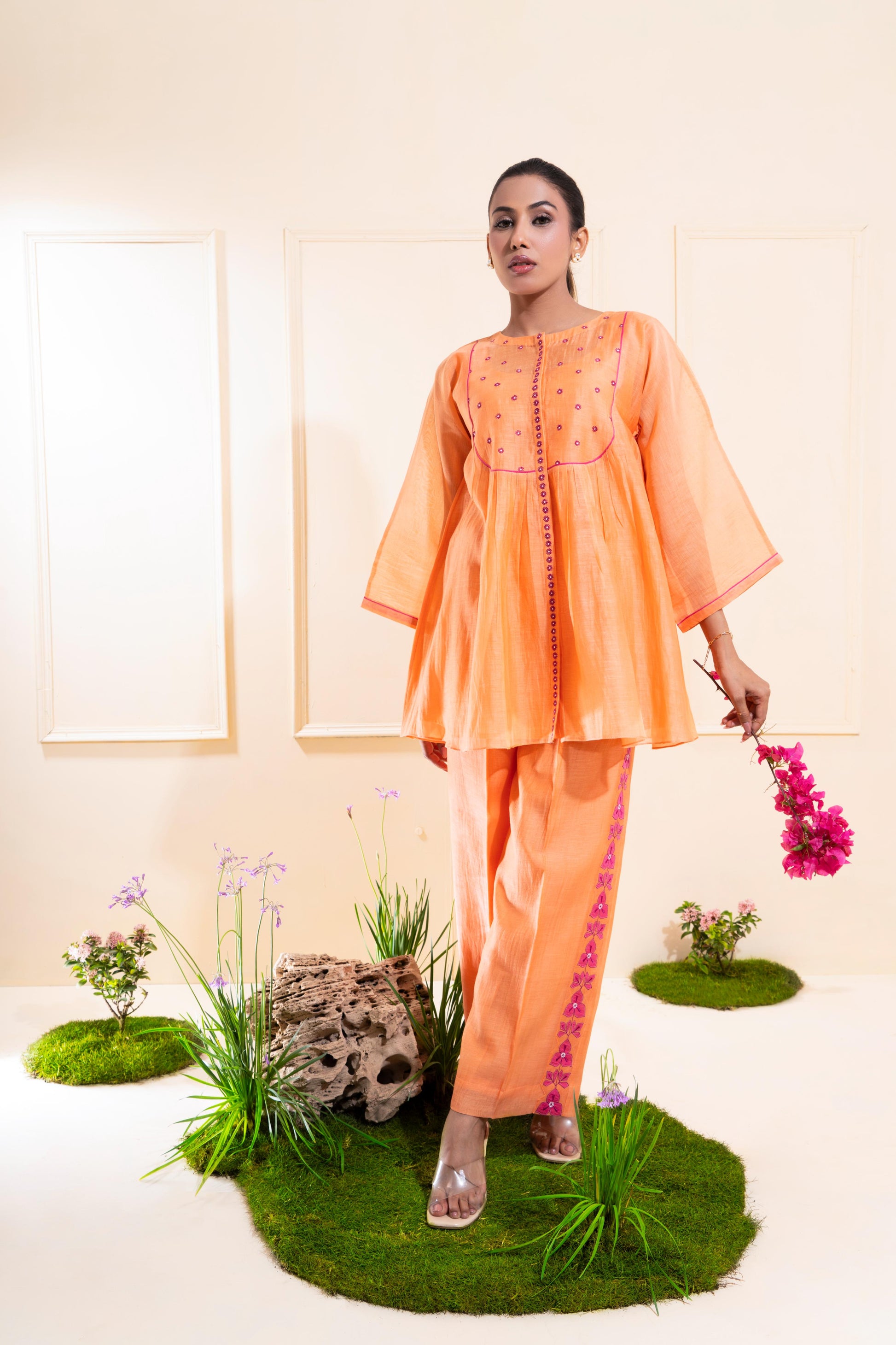 Paired with relaxed mul Chanderi trousers, lined with soft cotton for day-long comfort. An abstract appliqué border — inspired by the curling, organic form of the bougainvillea — runs along the pant sides, bringing movement and meaning to the design. The ensemble includes a soft mul cotton inner.