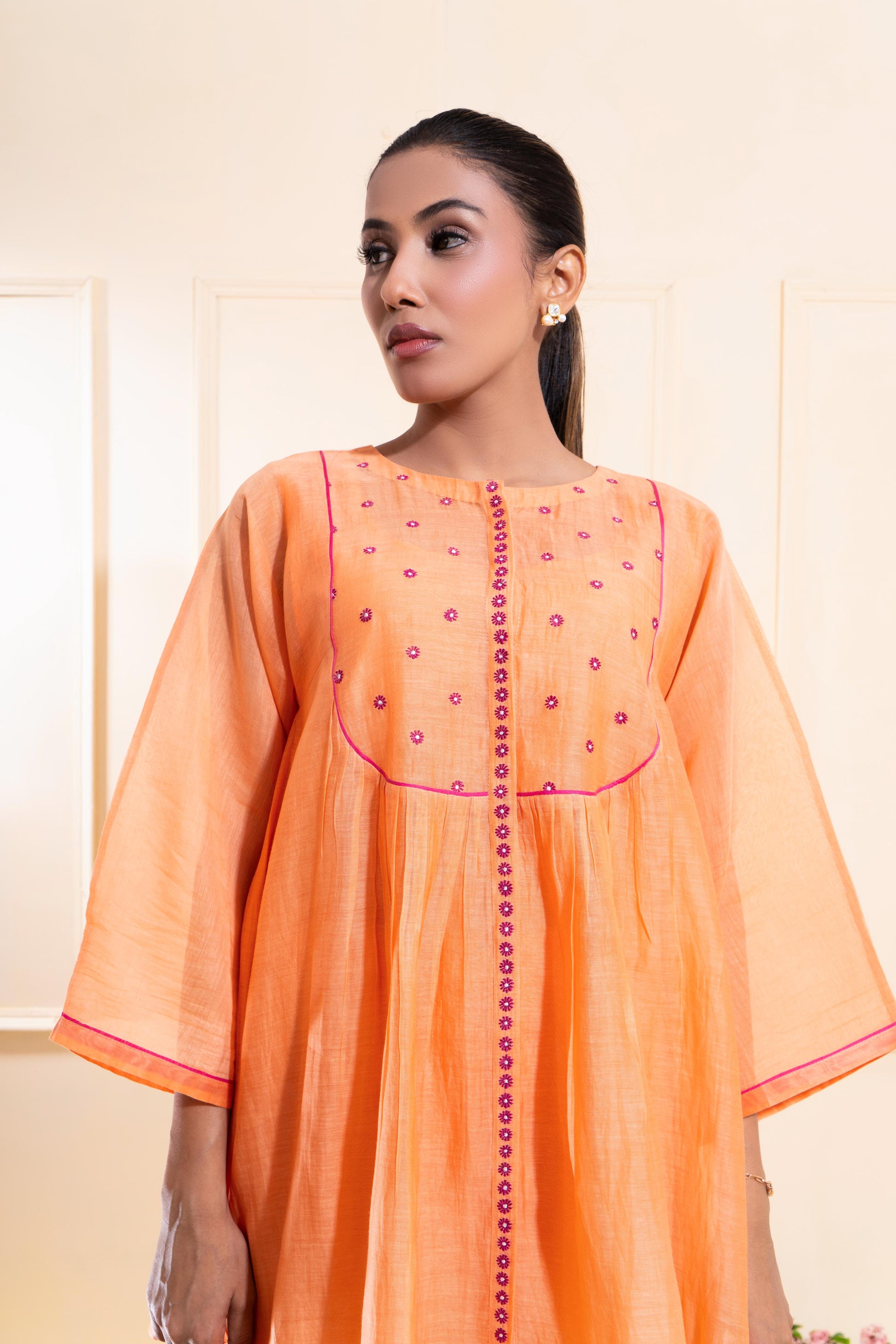 A soft peach top features a rounded yoke with gentle front gathers and scattered embroidered, dainty floral motifs. Bright pink piping adds a refreshing contrast, subtly defining the silhouette.