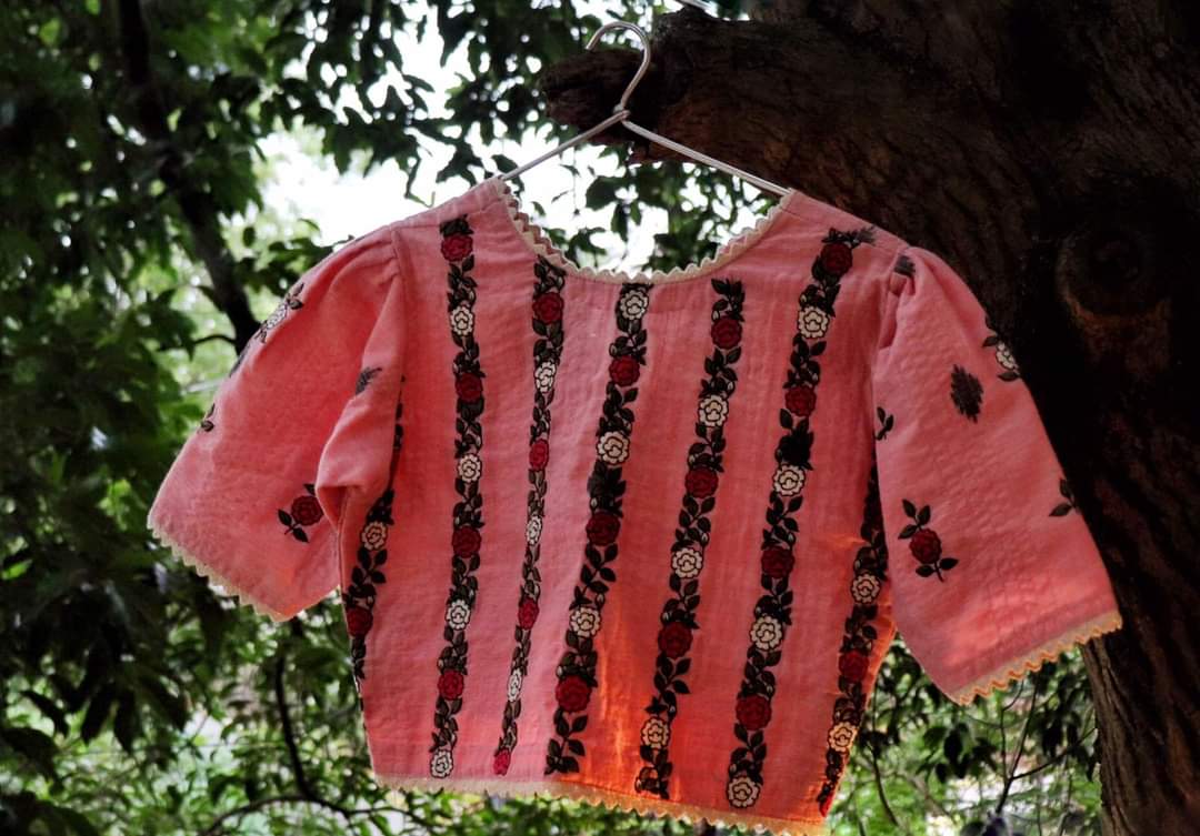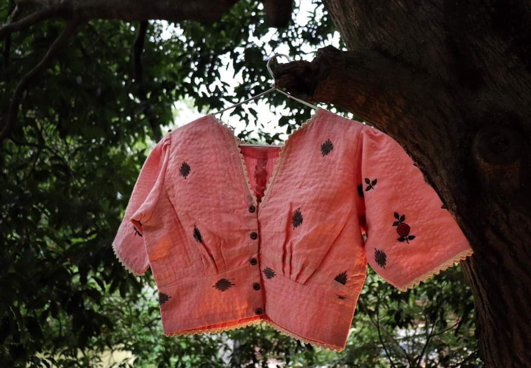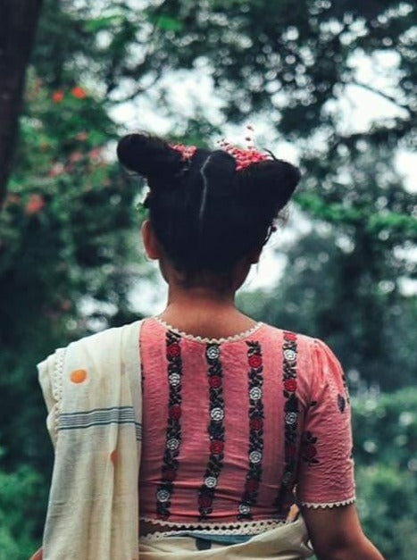 On peach handwoven Jamdani, wildroses are hand embroidered in rows. The blouses has an interesting neckline and delicate lace detailing.