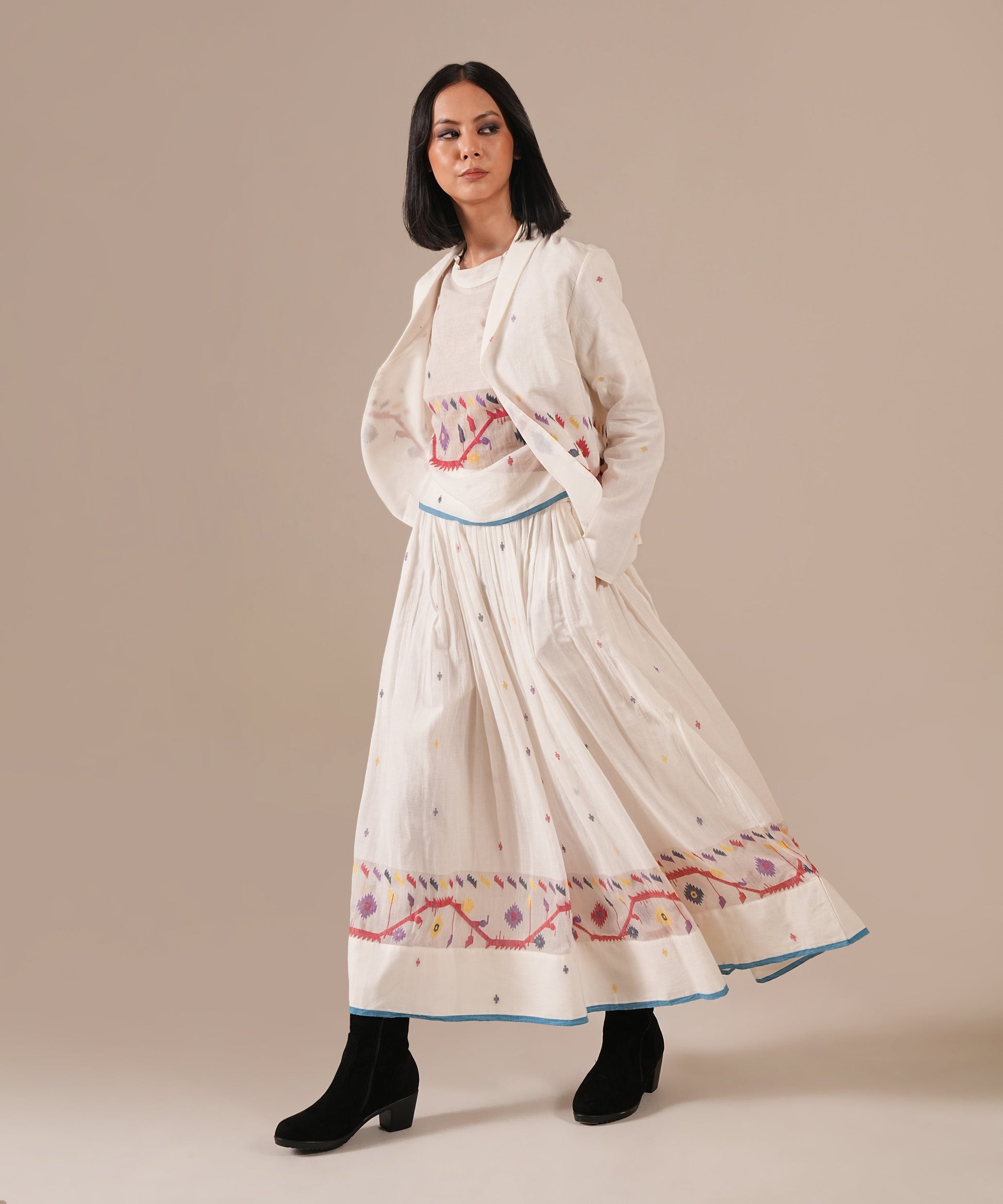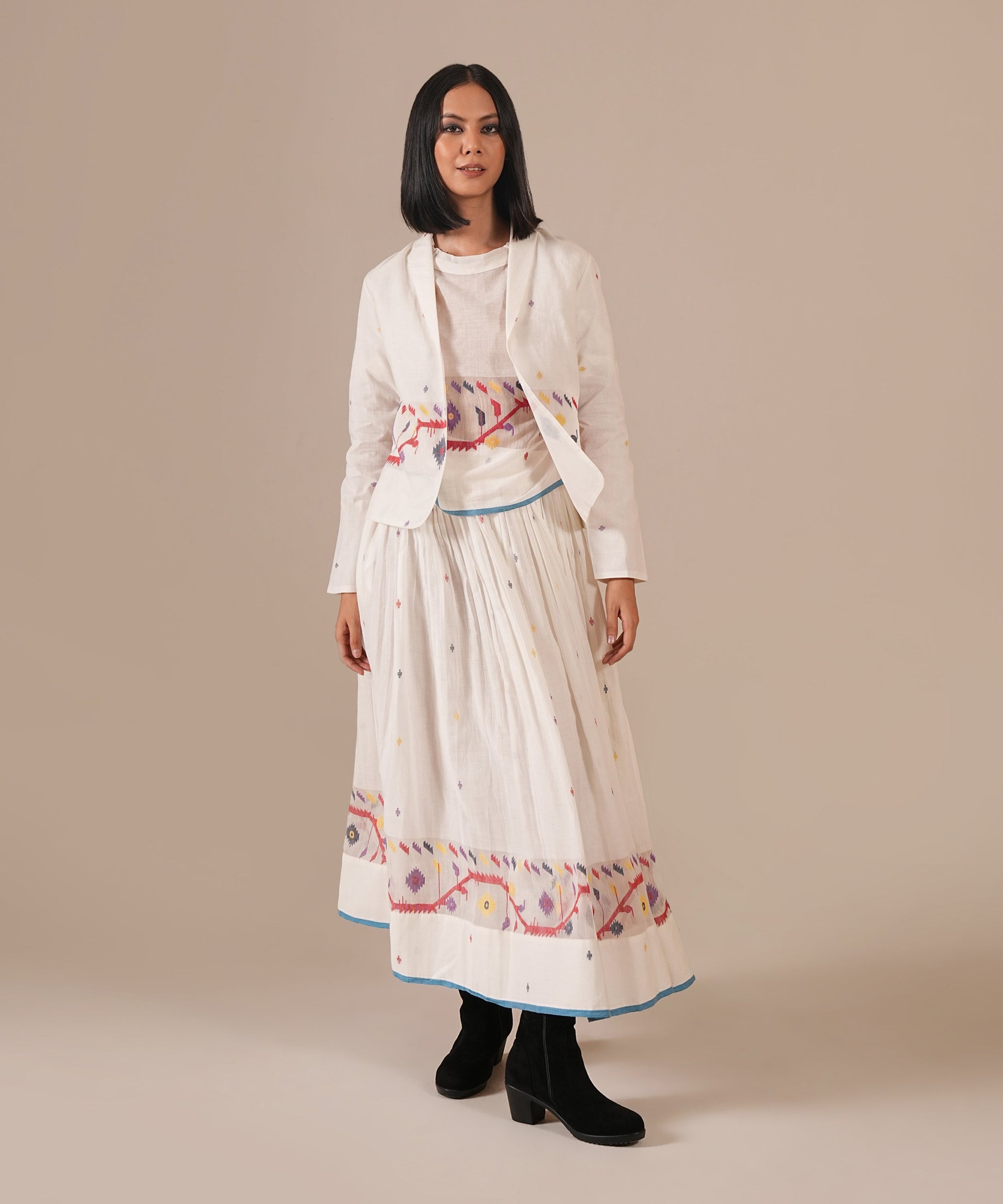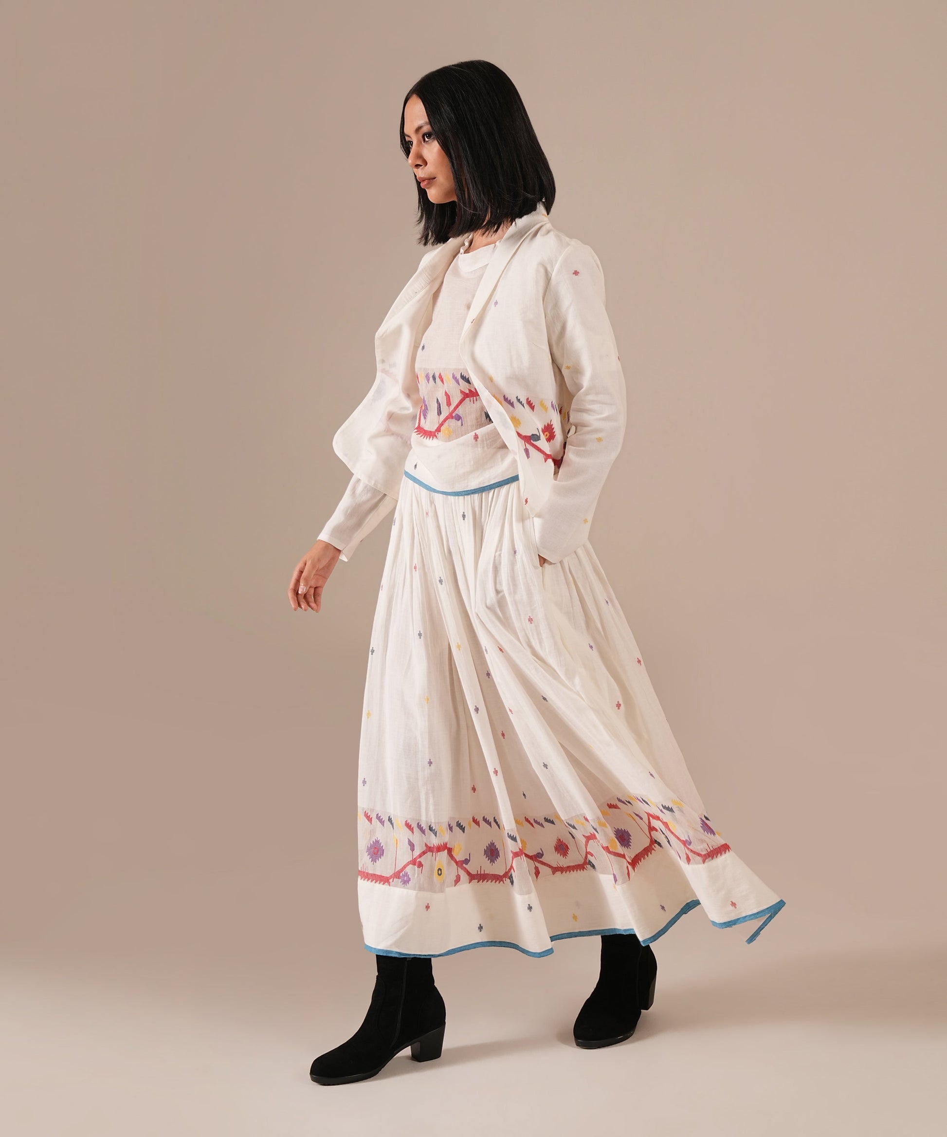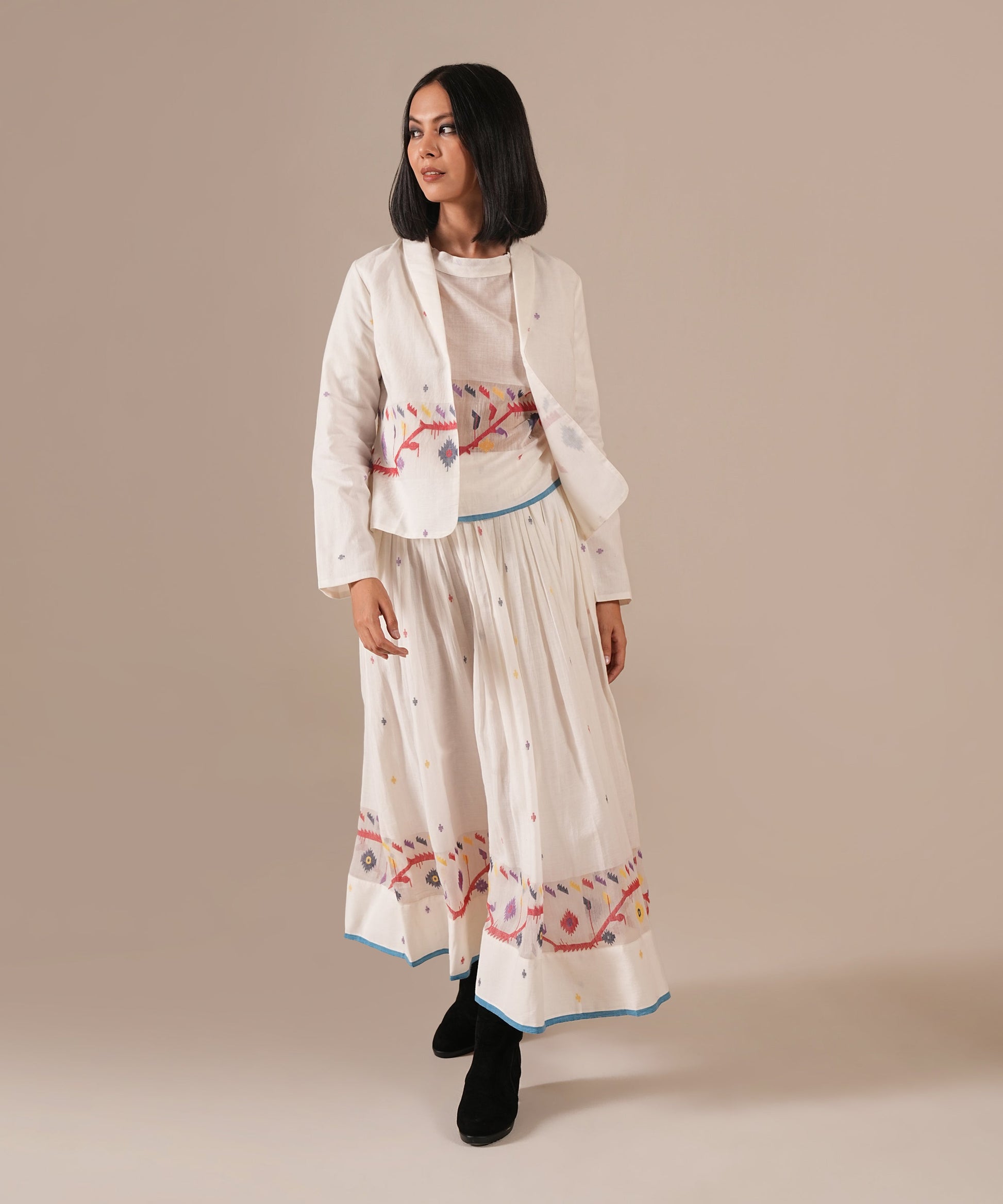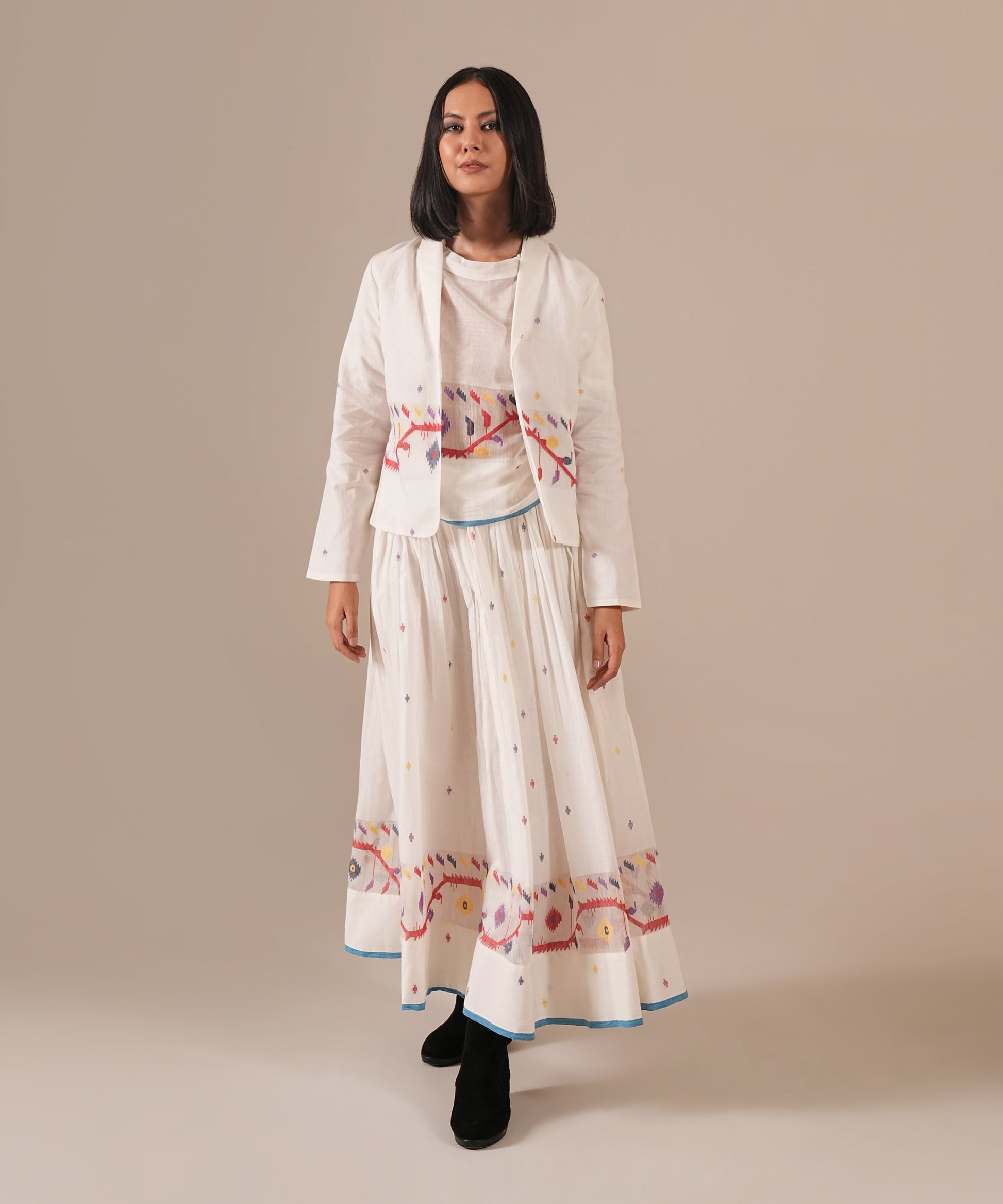 A classic Jamdani co-ord set featuring a boxy top, a gathered skirt, and a finely tailored jacket that can be styled in multiple ways.