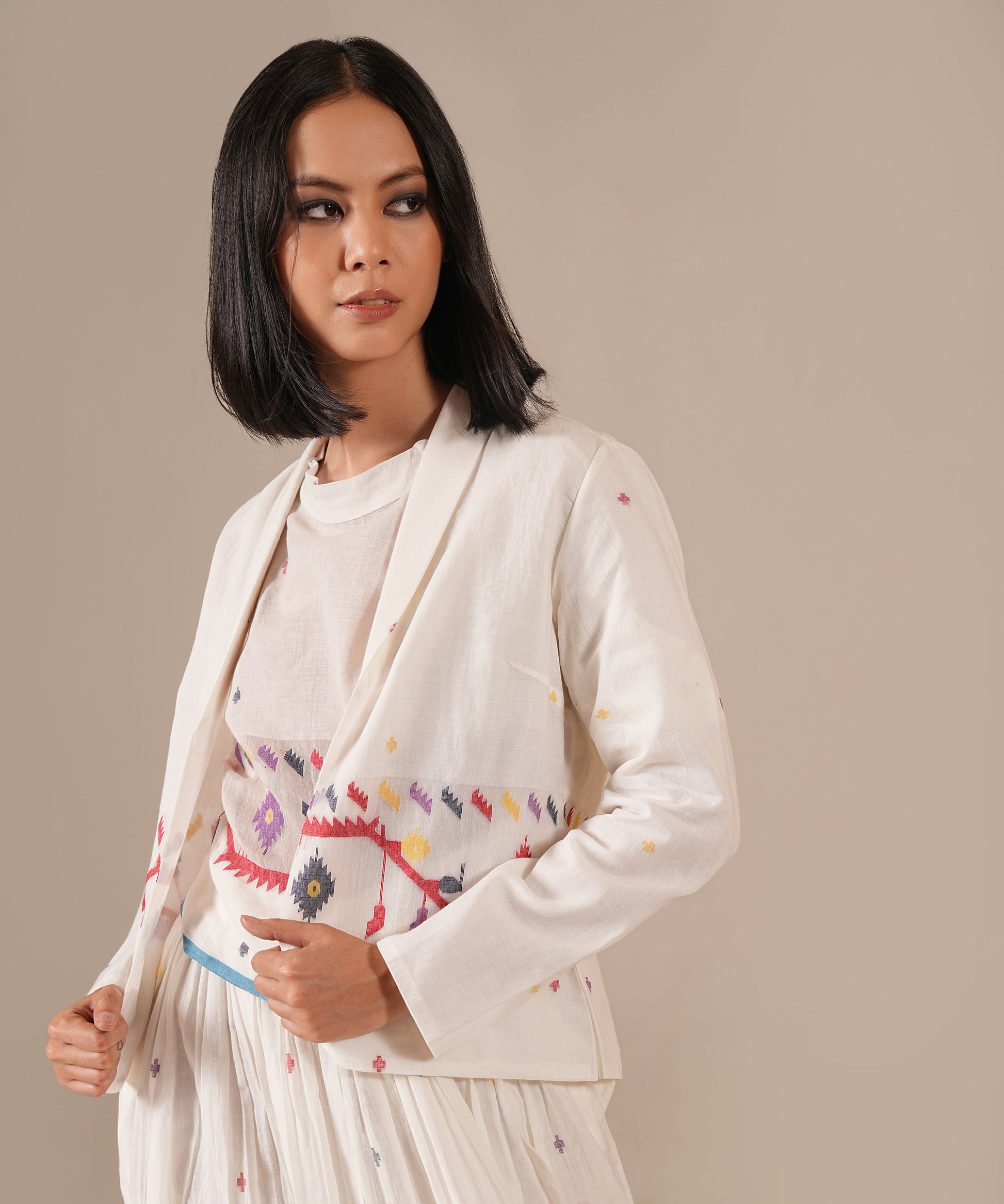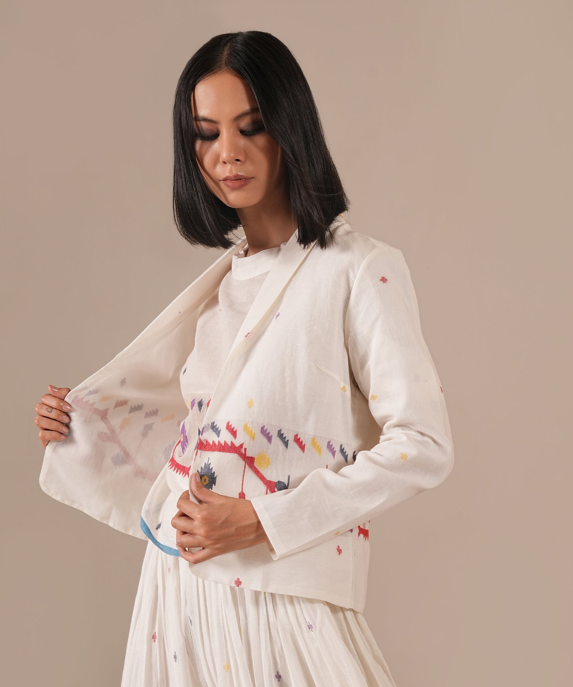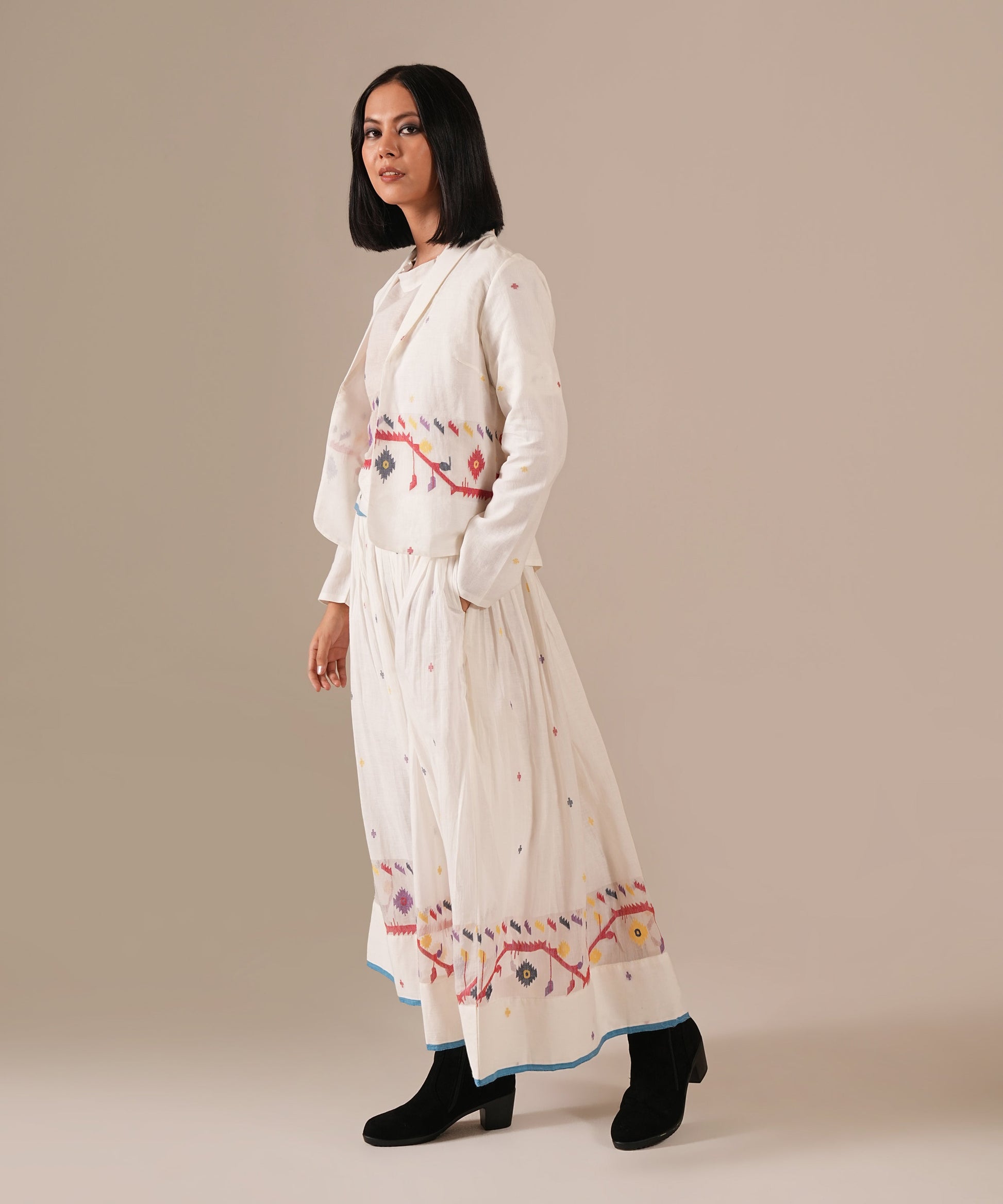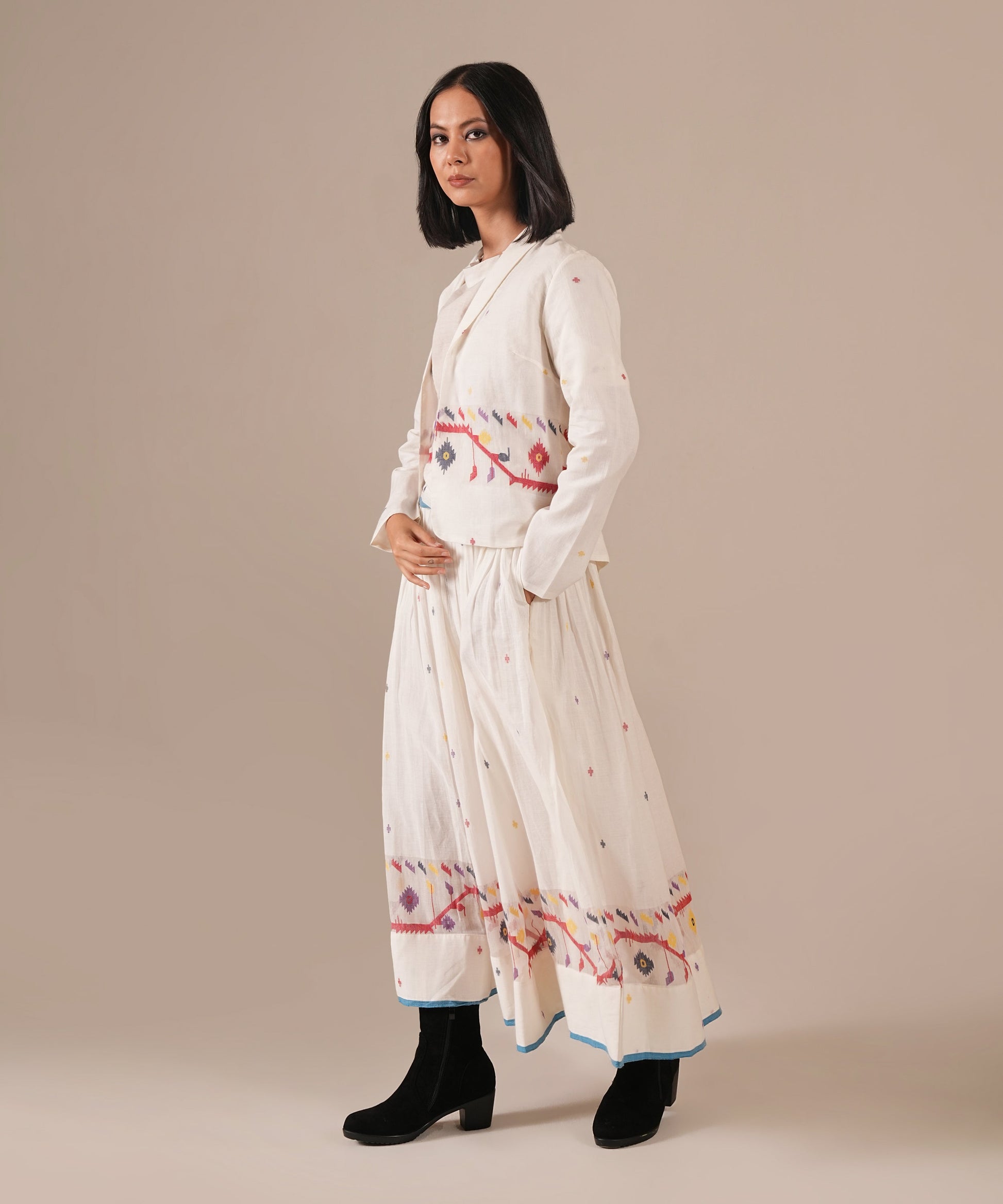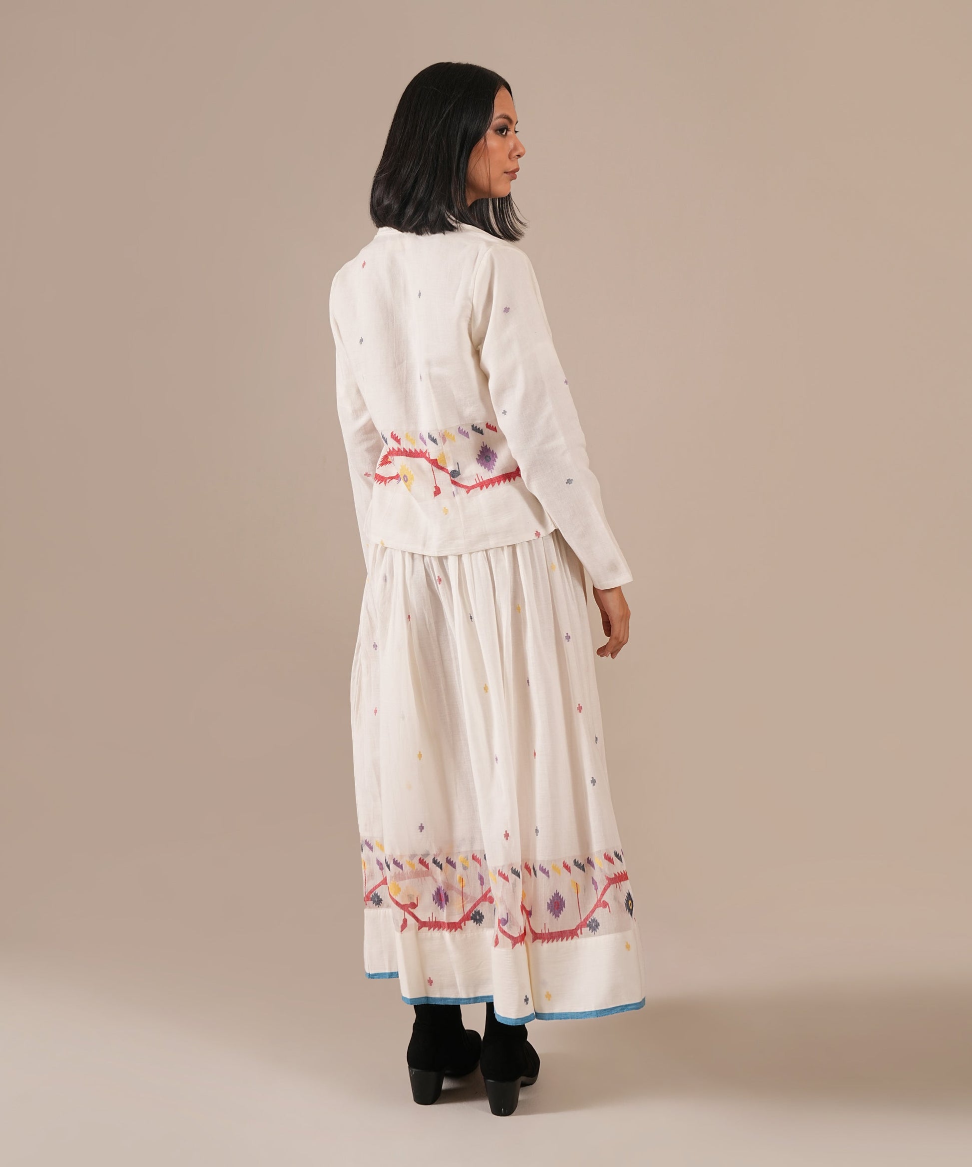 A classic Jamdani co-ord set featuring a boxy top, a gathered skirt, and a finely tailored jacket that can be styled in multiple ways.
