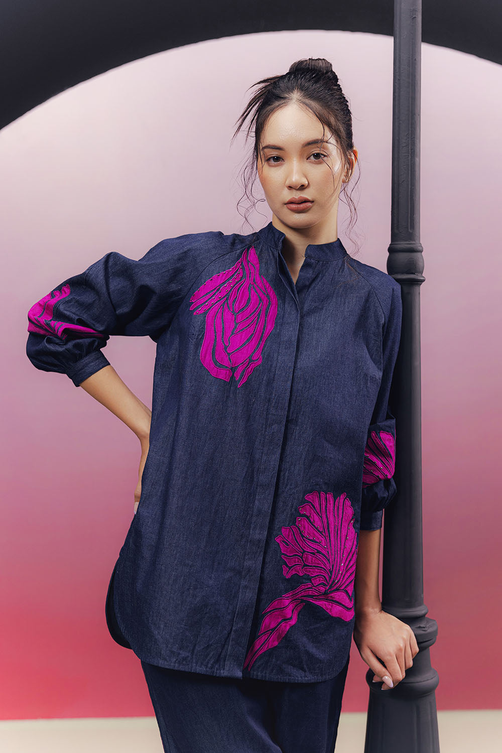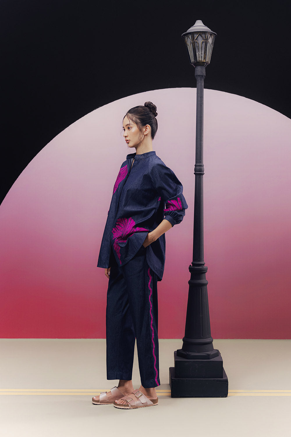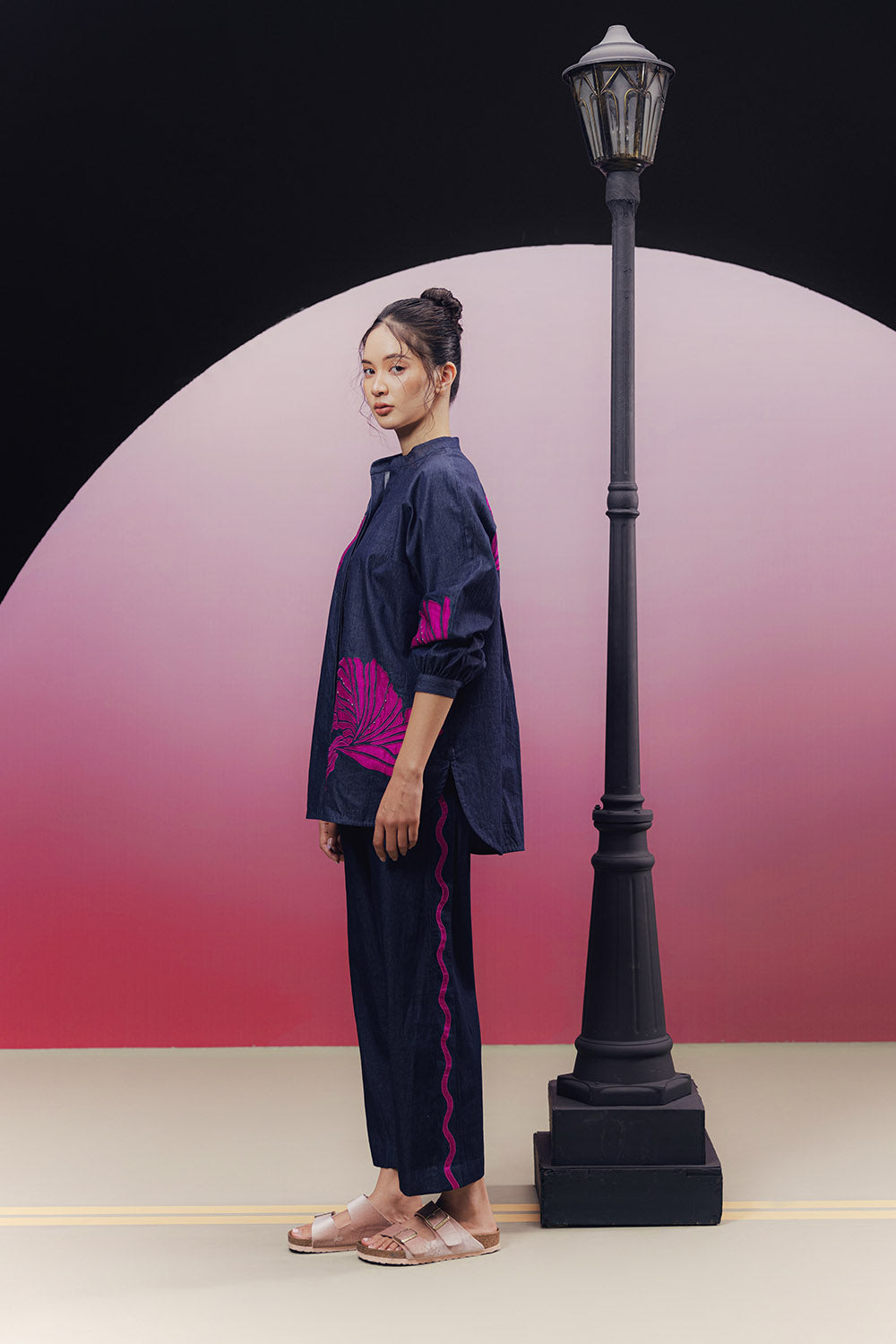 Raglan cut co-ord set with contrast silk appliqué on the shirt and pant borders. The applique is further highlighted with metallic bead work