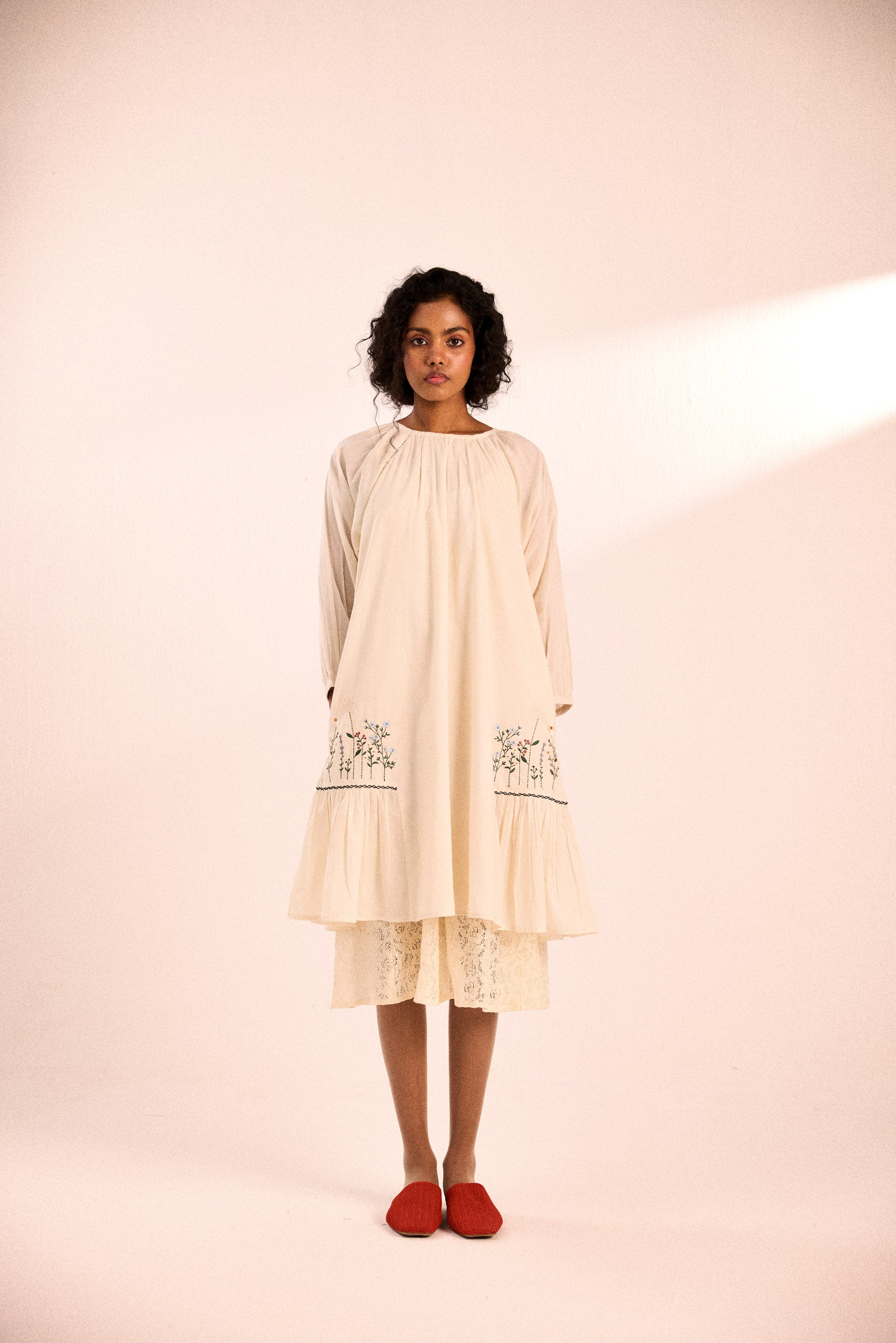 Crafted in cotton voile the dress features a delicate floral embroidery and hand-stitched details. Soft gathers at neckline and hem adds movement.