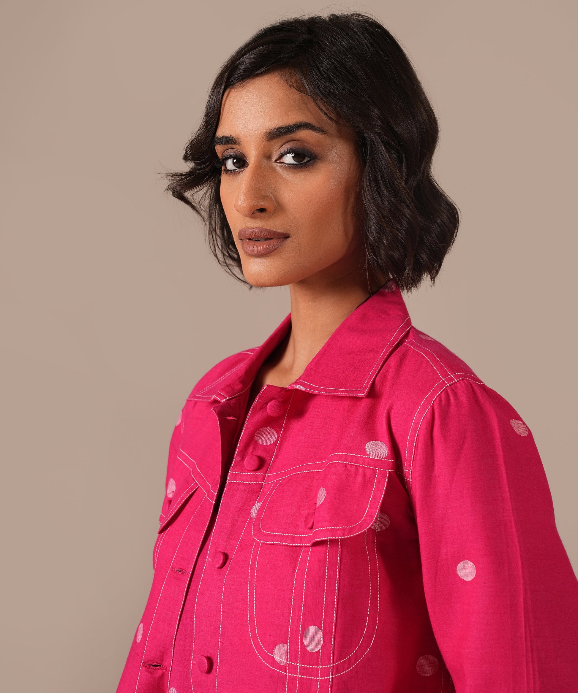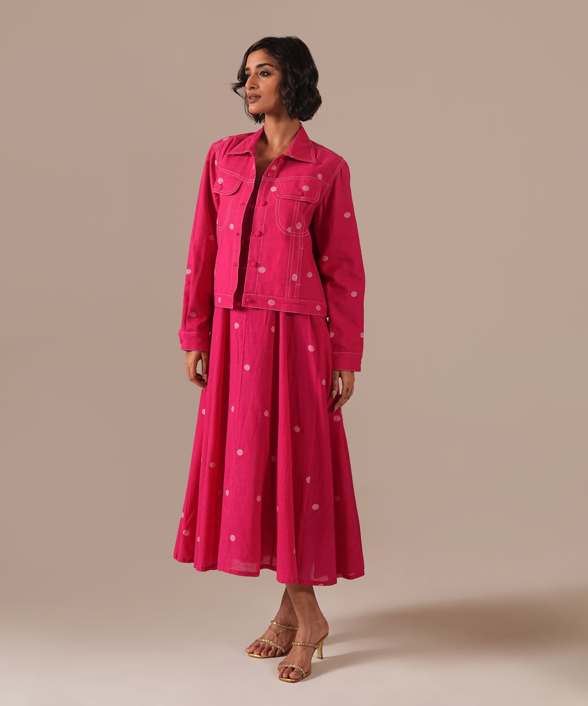 A Jamdani fit-and-flare ensemble featuring a deep square-neck dress with back zipper fastening, kali panel detailing, and functional side pockets. It is paired with a denim-inspired Jamdani co-ord jacket, reimagining the timeless weave with a modern denim aesthetic. Handwoven by Indian artisans, this set beautifully blends tradition with contemporary design.