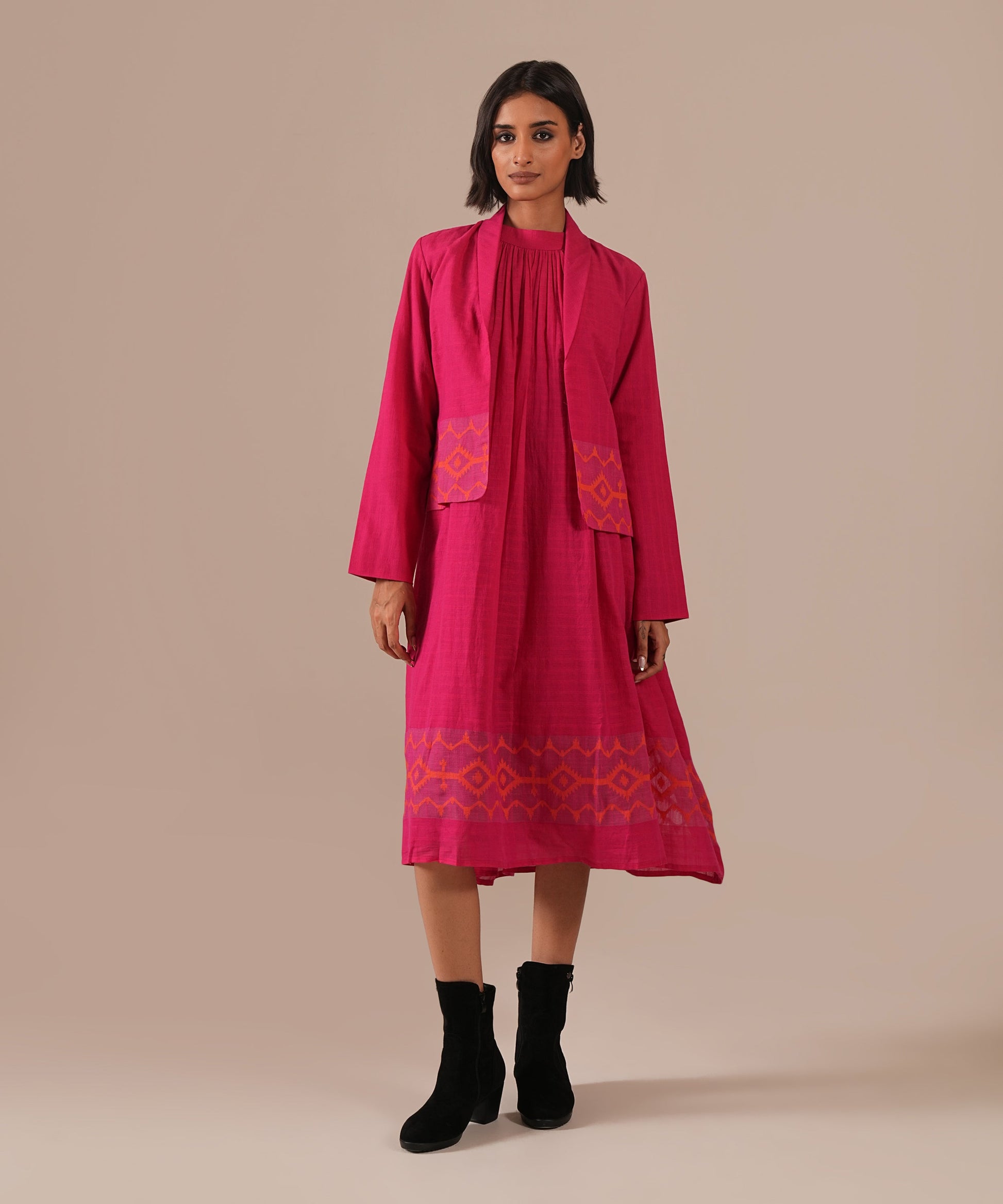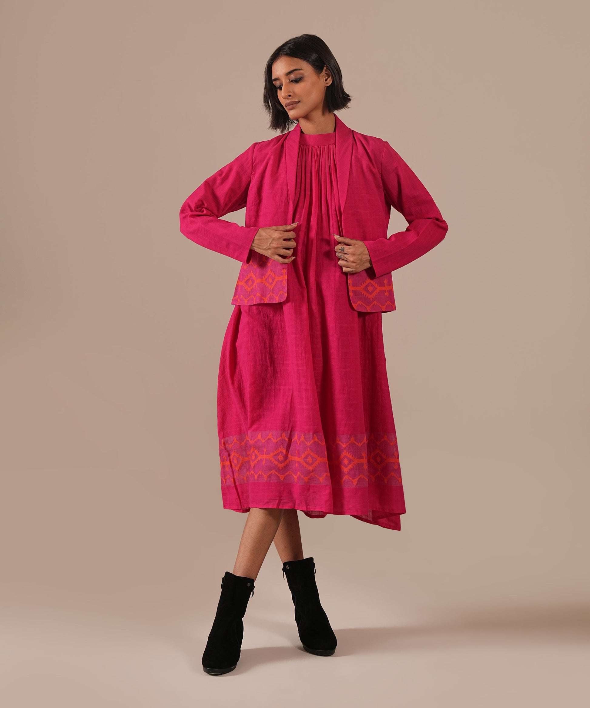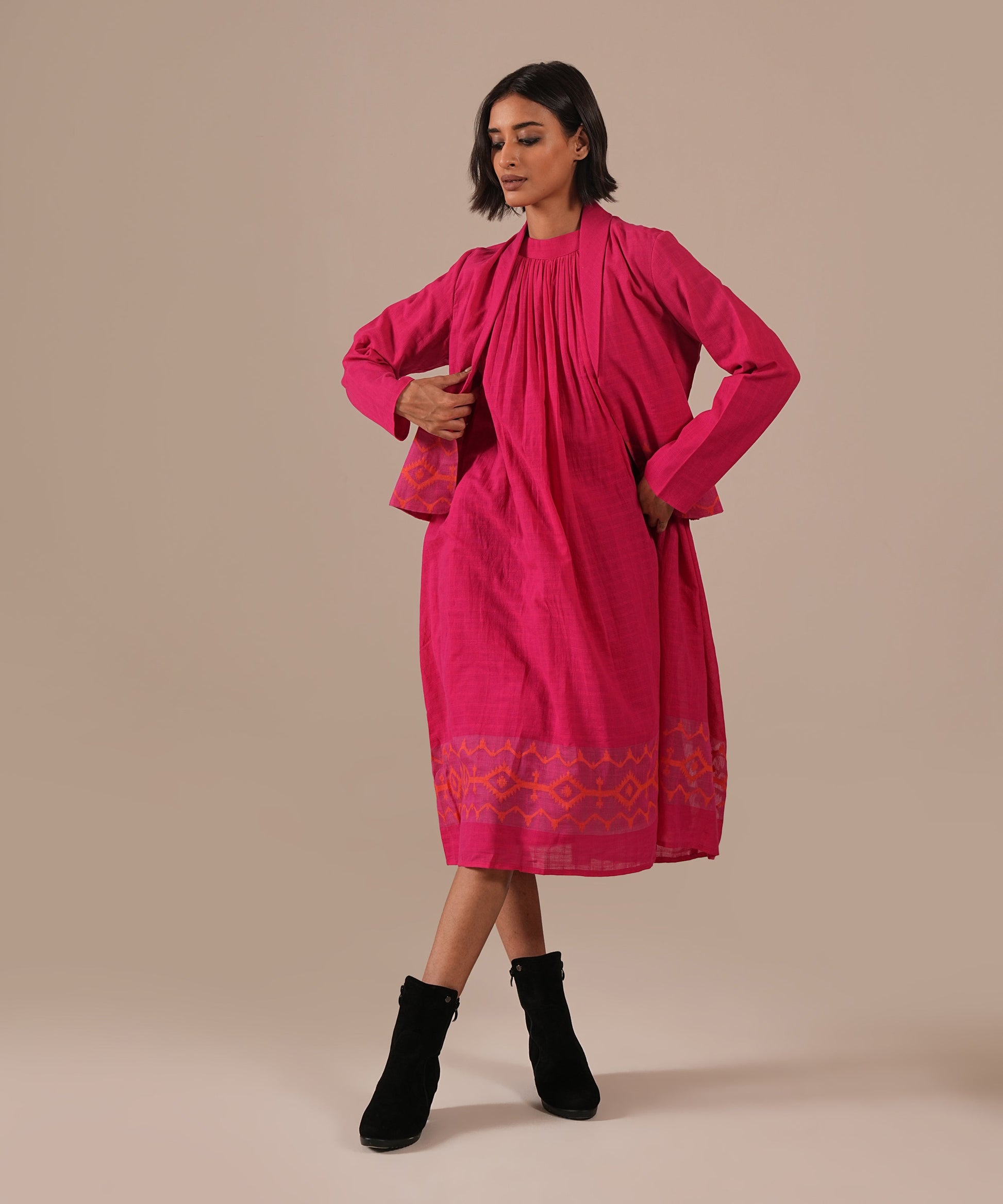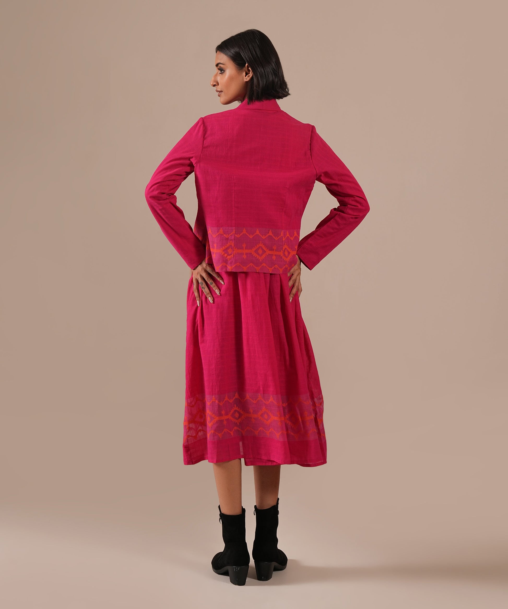 A classic Jamdani ensemble featuring a gathered dress with halter neck, delicate gathers, back zipper, and side pockets, paired with a co-ord jacket meticulously handwoven to blend artisanal heritage with contemporary luxury.