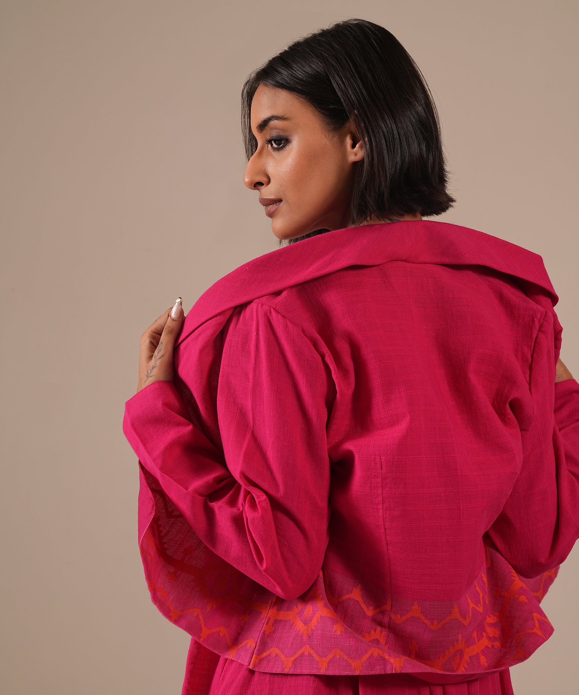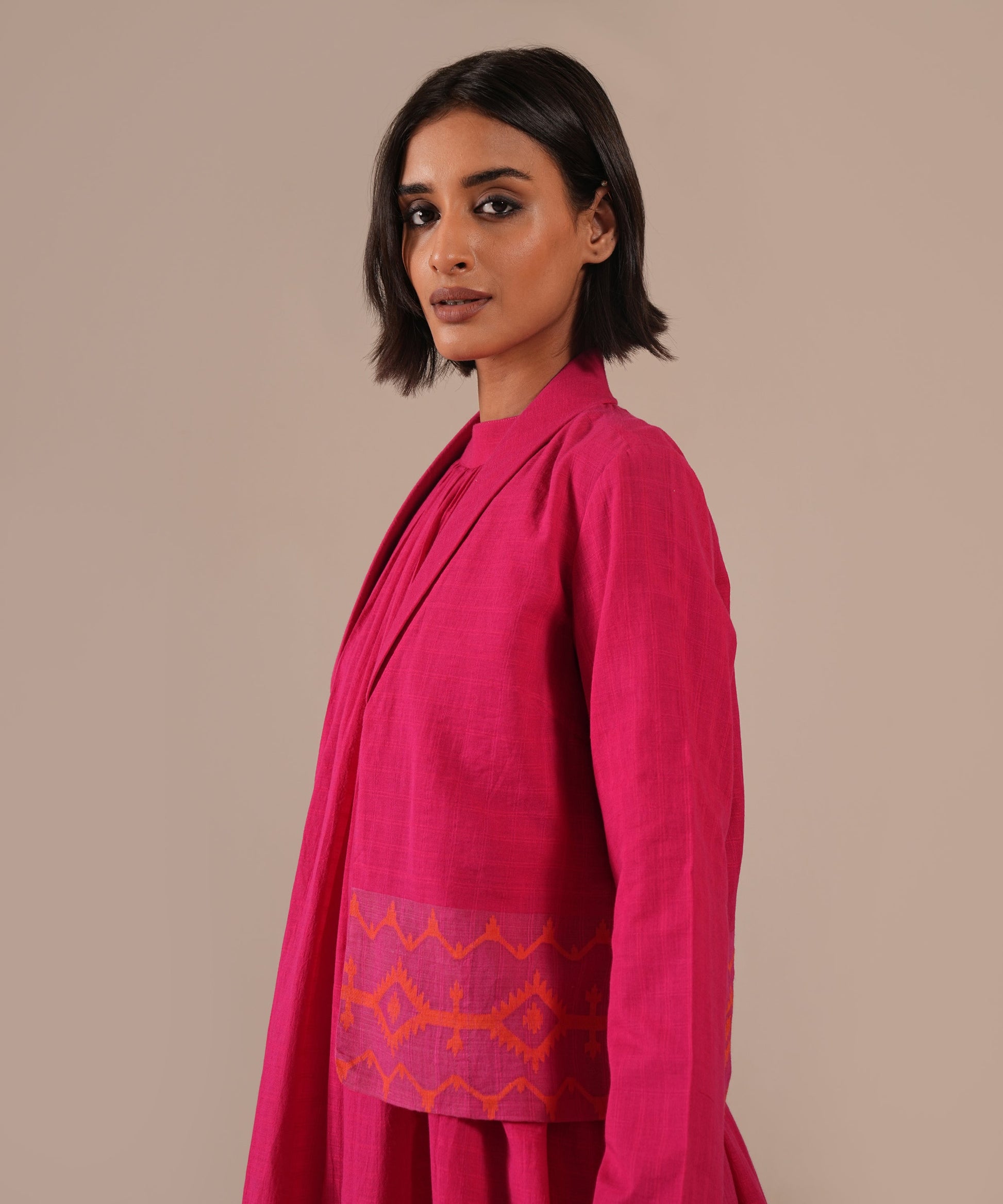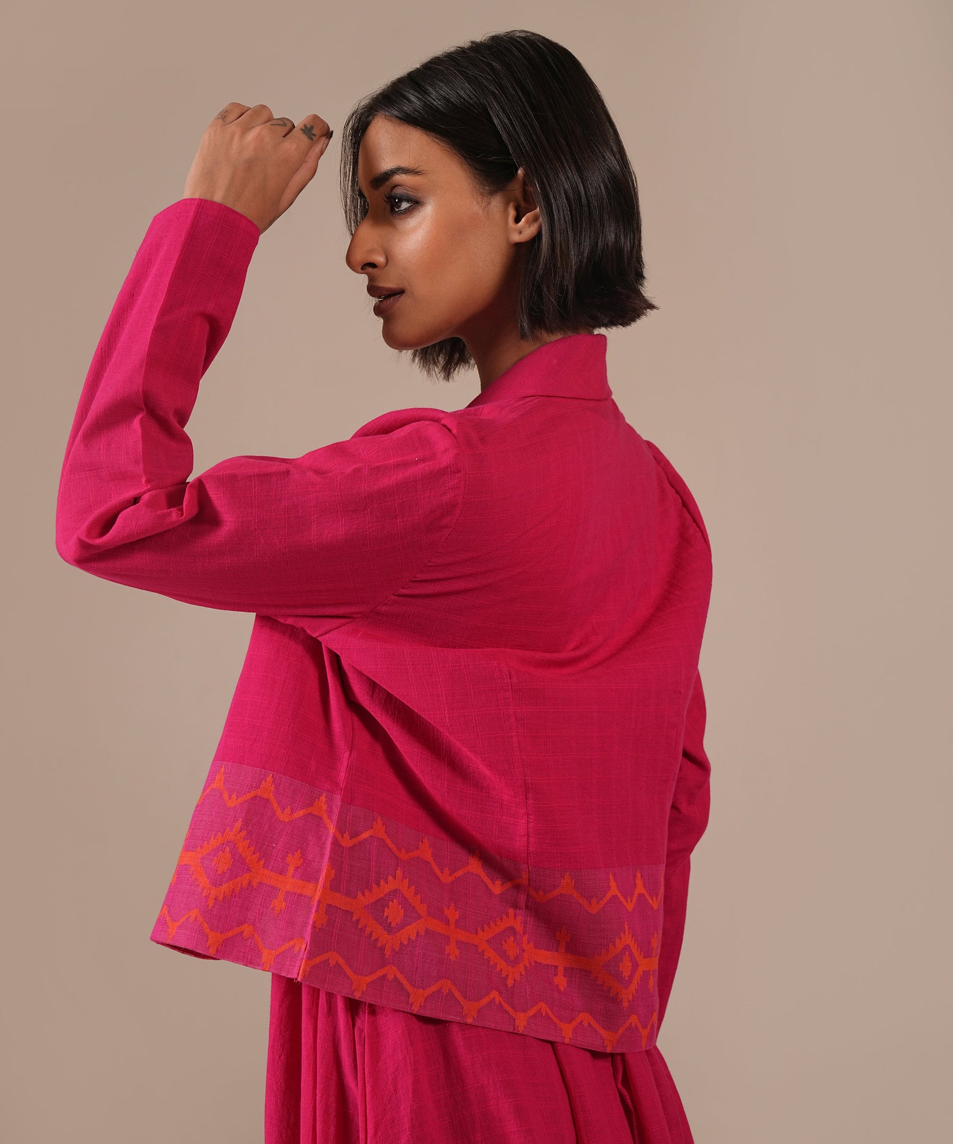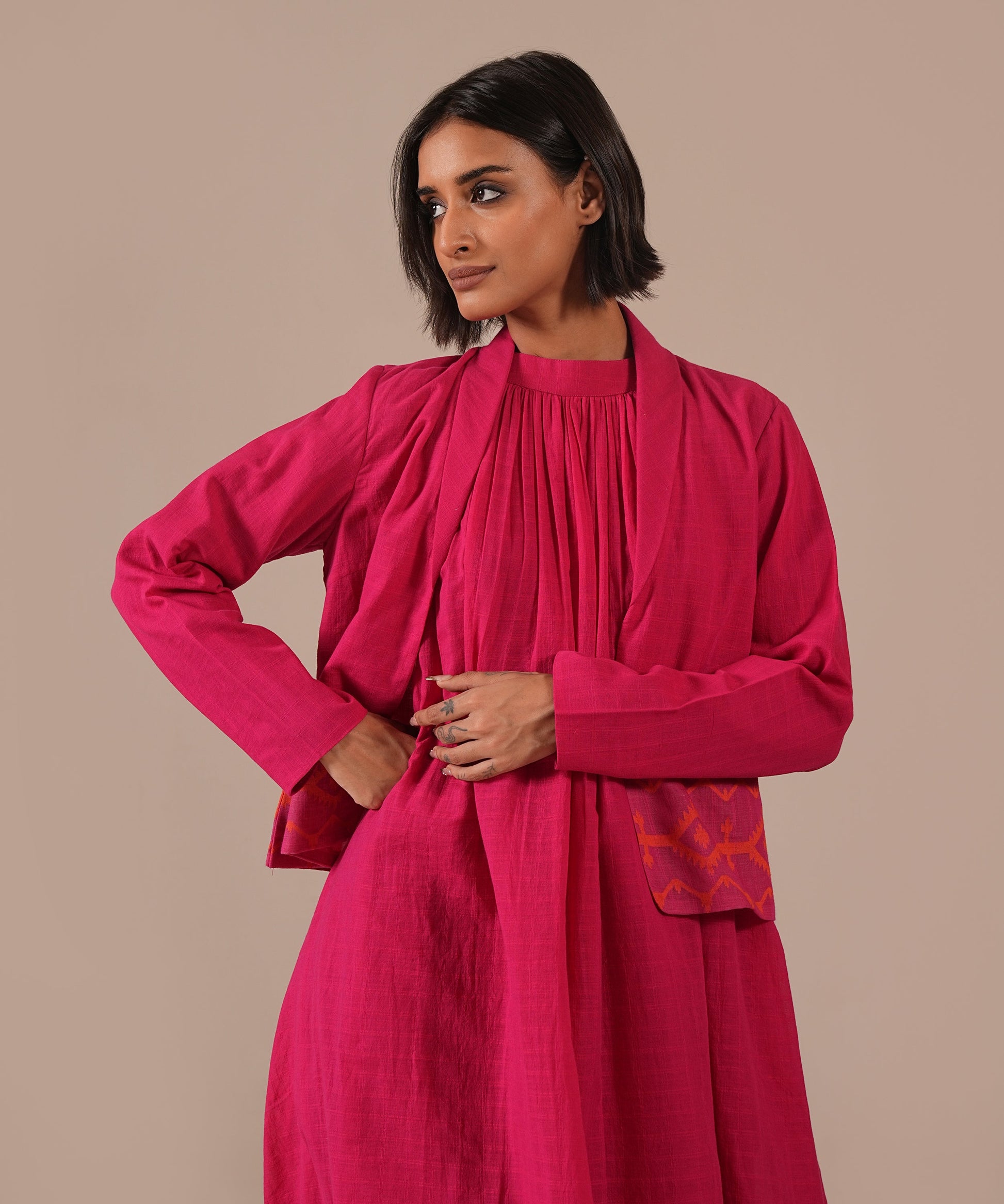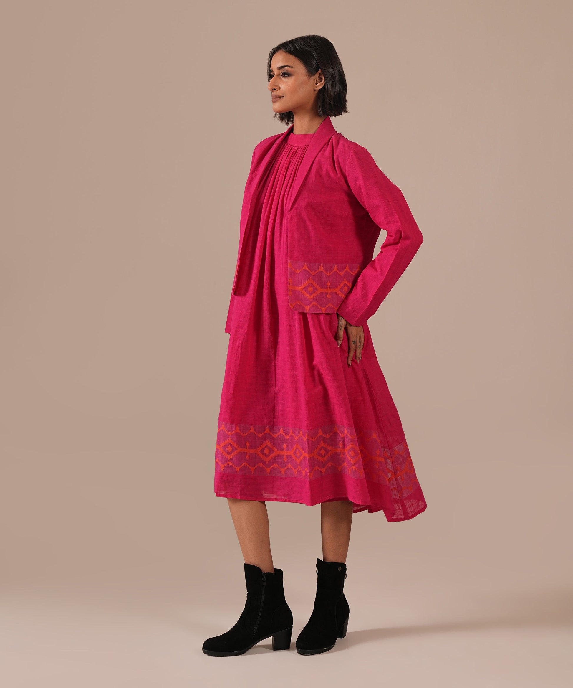 A classic Jamdani ensemble featuring a gathered dress with halter neck, delicate gathers, back zipper, and side pockets, paired with a co-ord jacket meticulously handwoven to blend artisanal heritage with contemporary luxury.