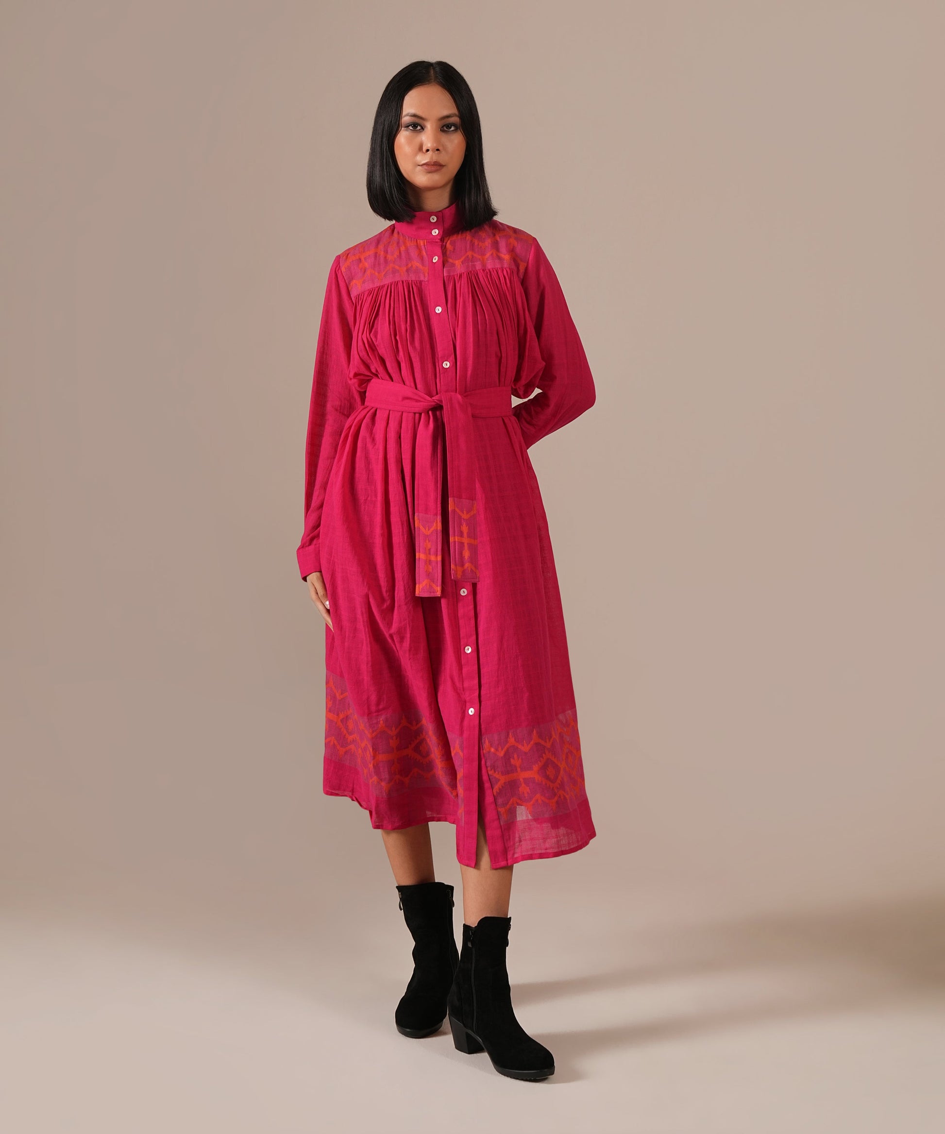 A minimalistic tiered shirt dress featuring high collar neck, front button fastening, full sleeves that comes with gentle pleats at the front and back which be styled in multiple ways. This dress also comes with a removable tie belt.