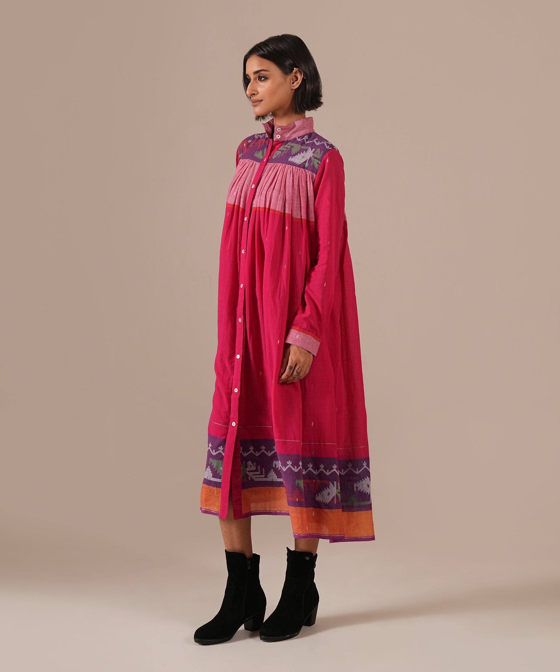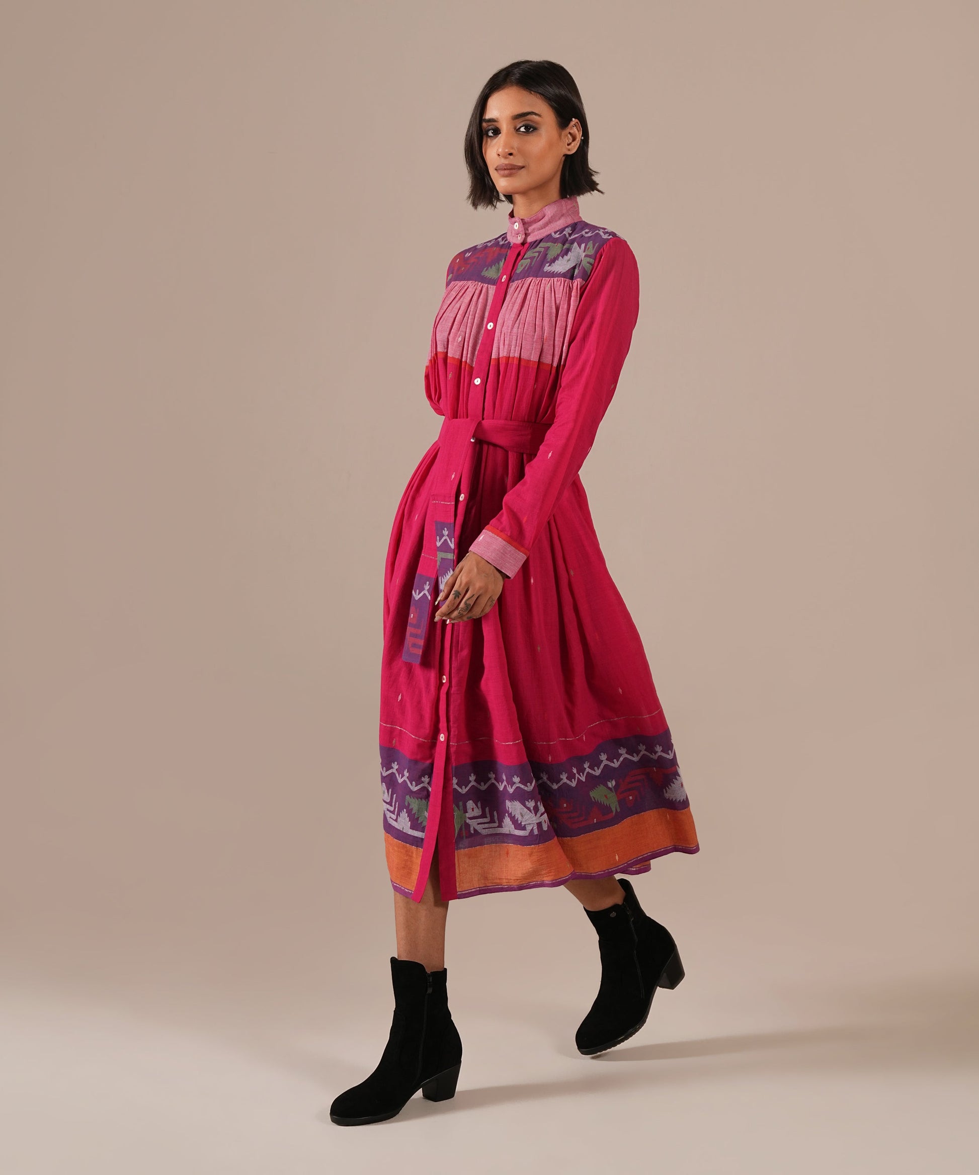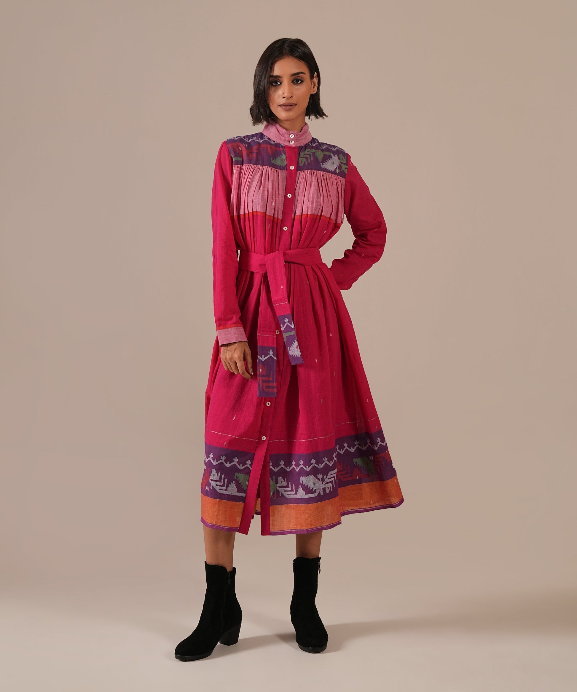 A minimalistic tiered shirt dress featuring high collar neck, front button fastening, full sleeves that comes with gentle pleats at the front and back which be styled in multiple ways. This dress also comes with a separate slip and a removable tie belt.