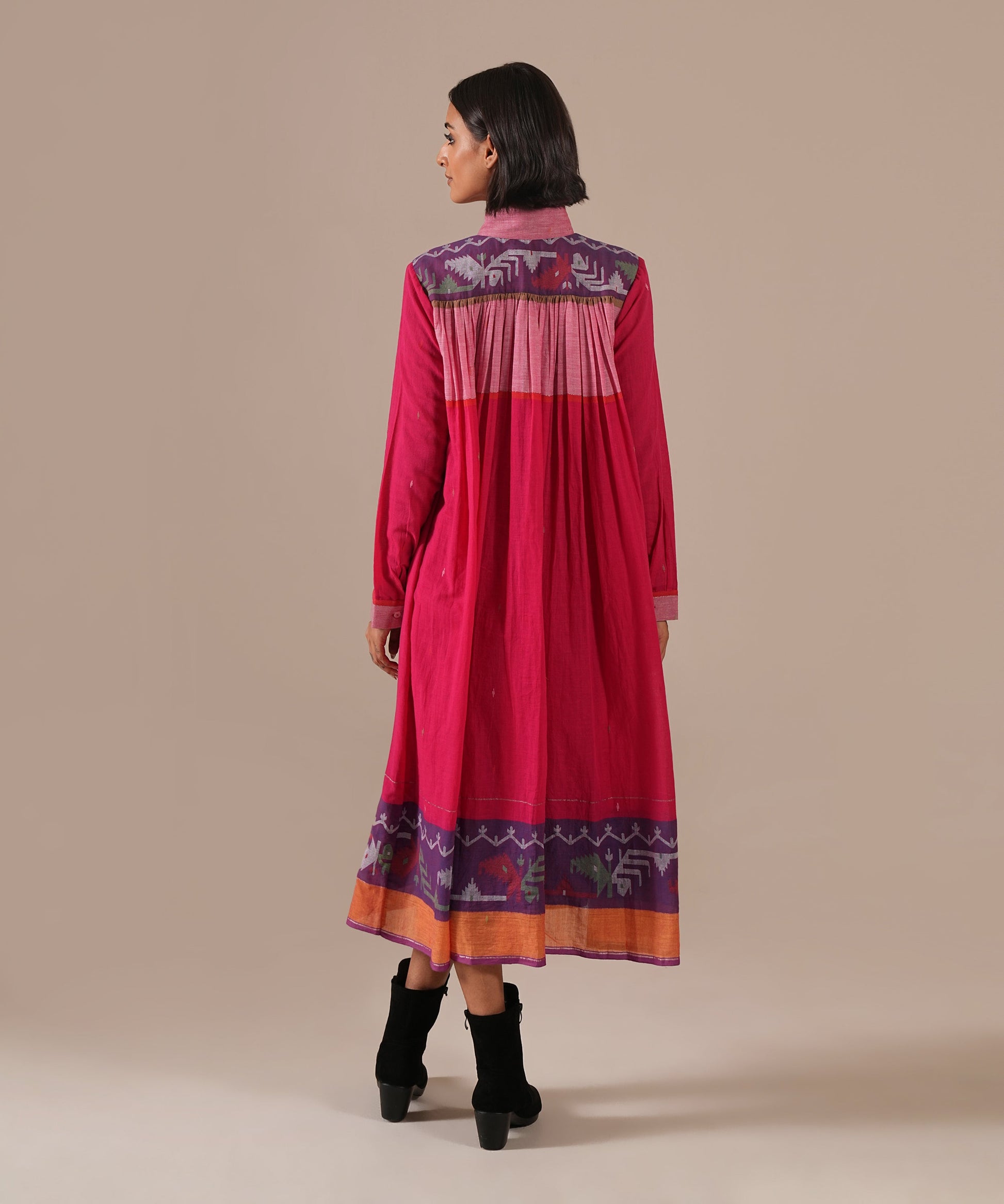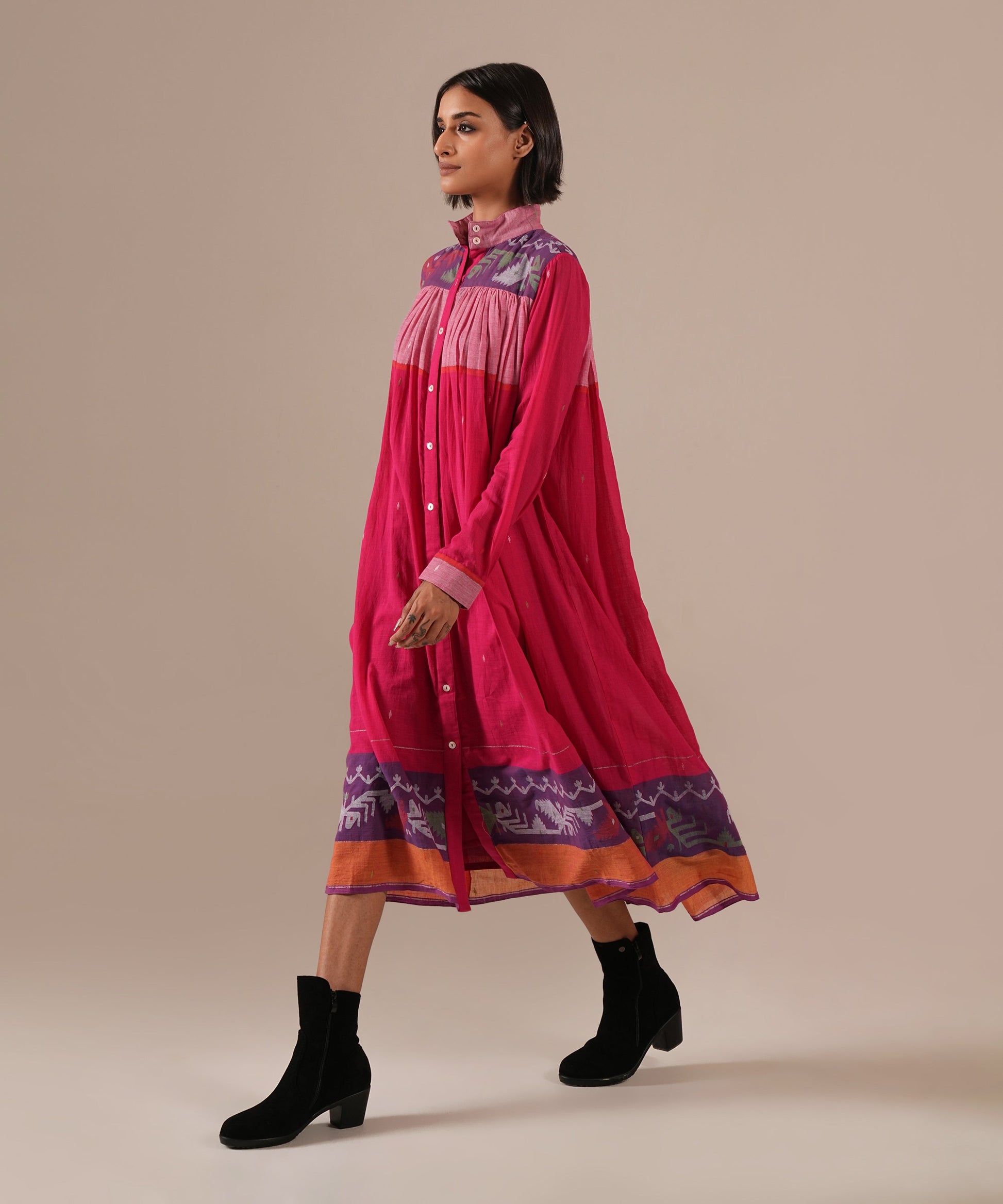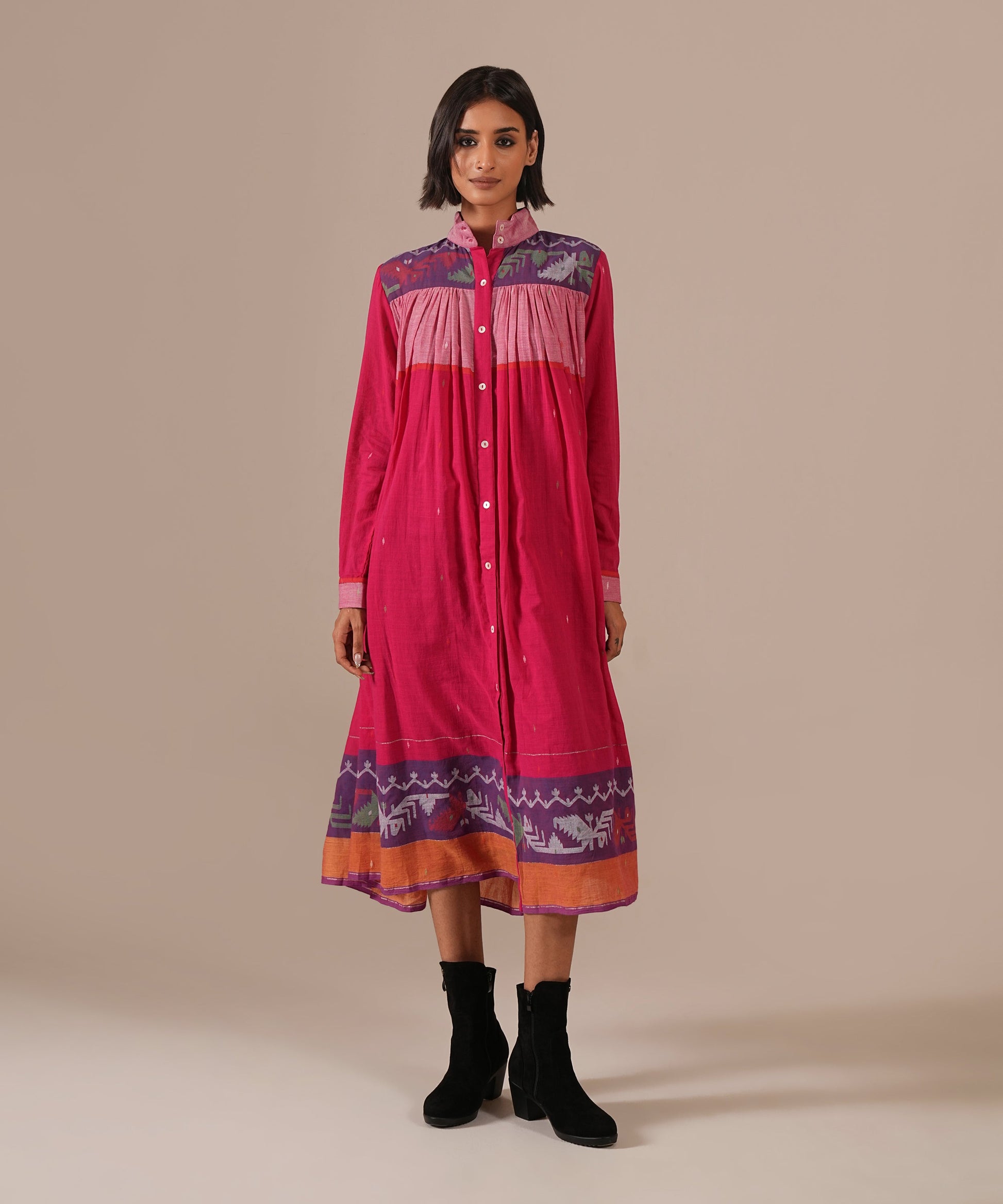 A minimalistic tiered shirt dress featuring high collar neck, front button fastening, full sleeves that comes with gentle pleats at the front and back which be styled in multiple ways. This dress also comes with a separate slip and a removable tie belt.