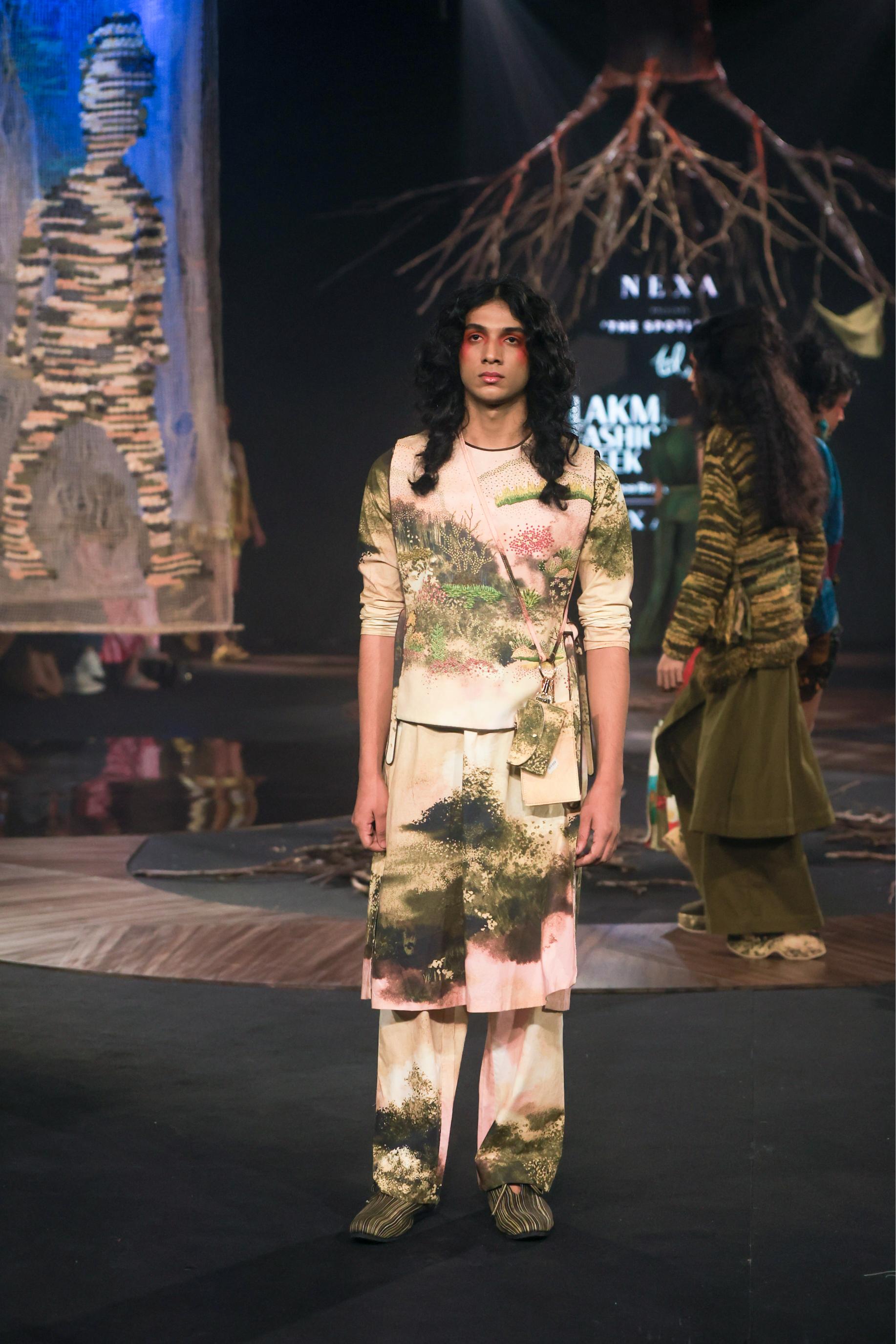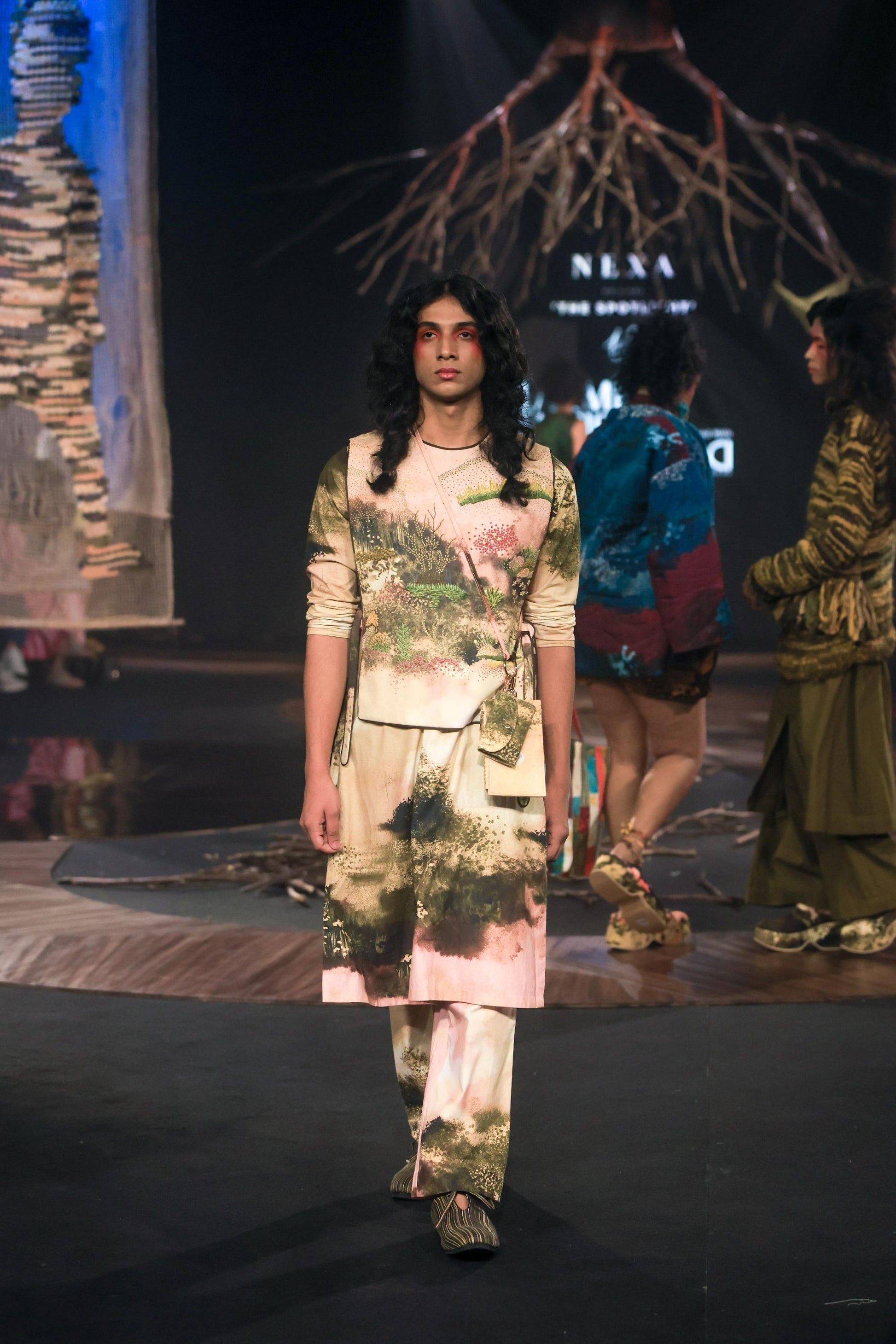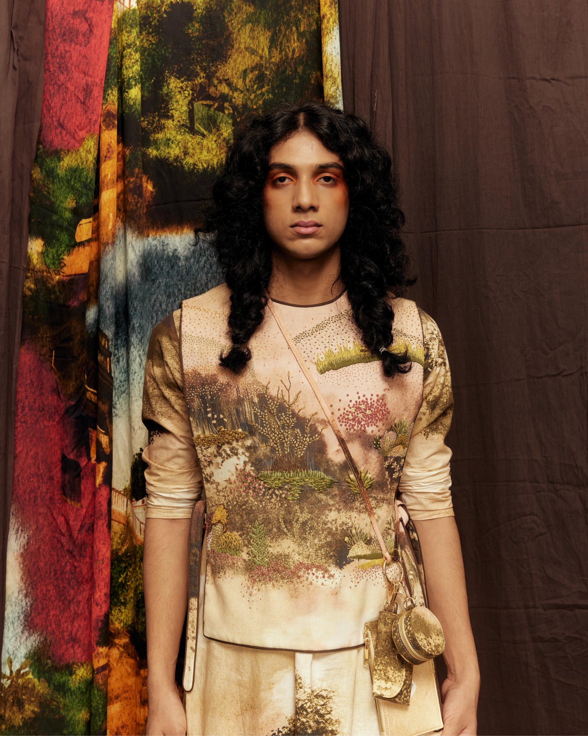 This embroidered Gilet is made in soft cotton featuring hand painted, digitally printed surreal landscape and embellished with all threadwork embroidery creating a mesmerising textures. It has side tie ups to enhance your whole look.