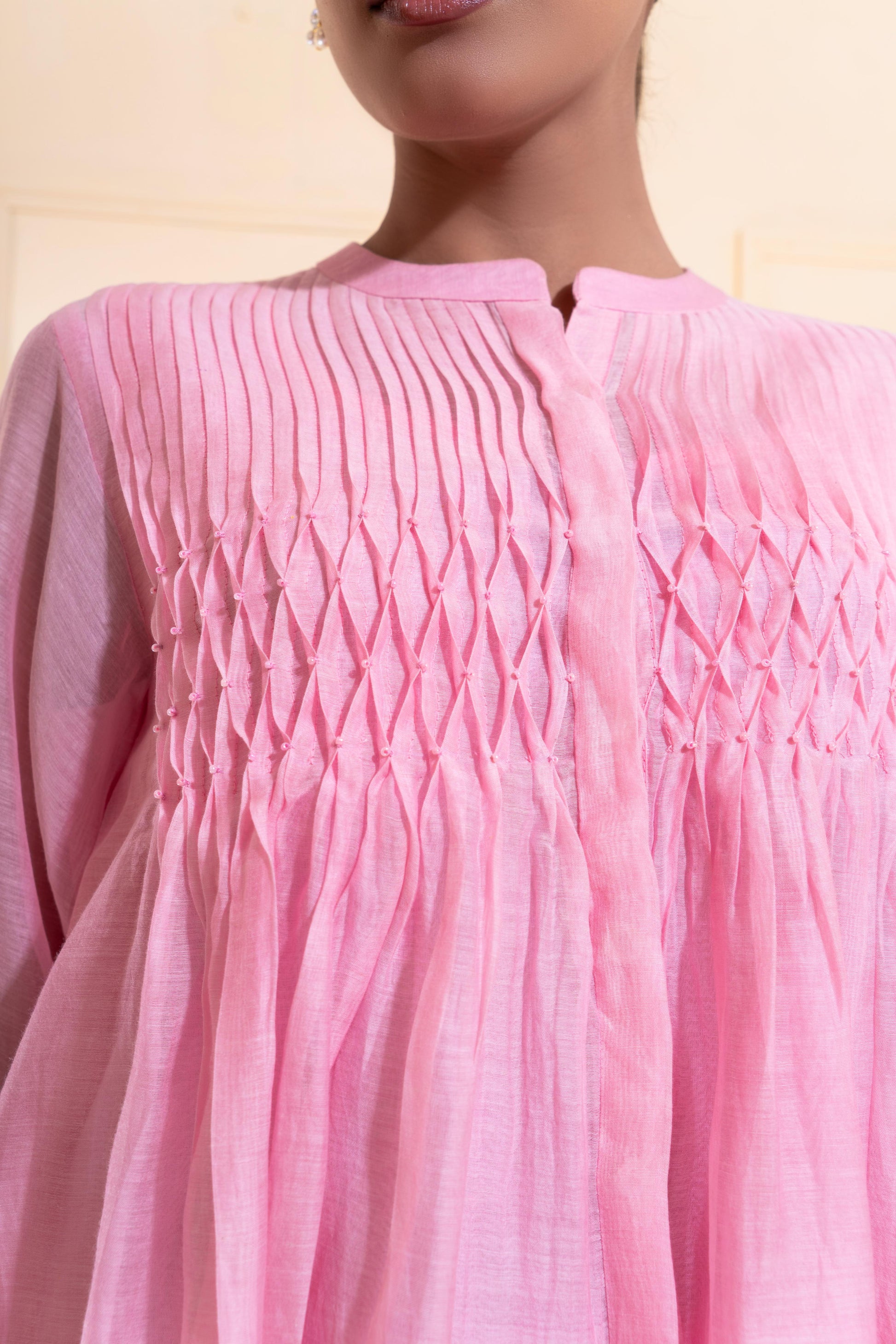 With its delicate smocking, soft gathers, and floral appliqué in a whispering pink palette, this co-ord is both graceful and grounded. The hand-smocked yoke and Mandarin collar lend timeless structure, while monotone floral appliqué on the sleeves brings subtle artistry.