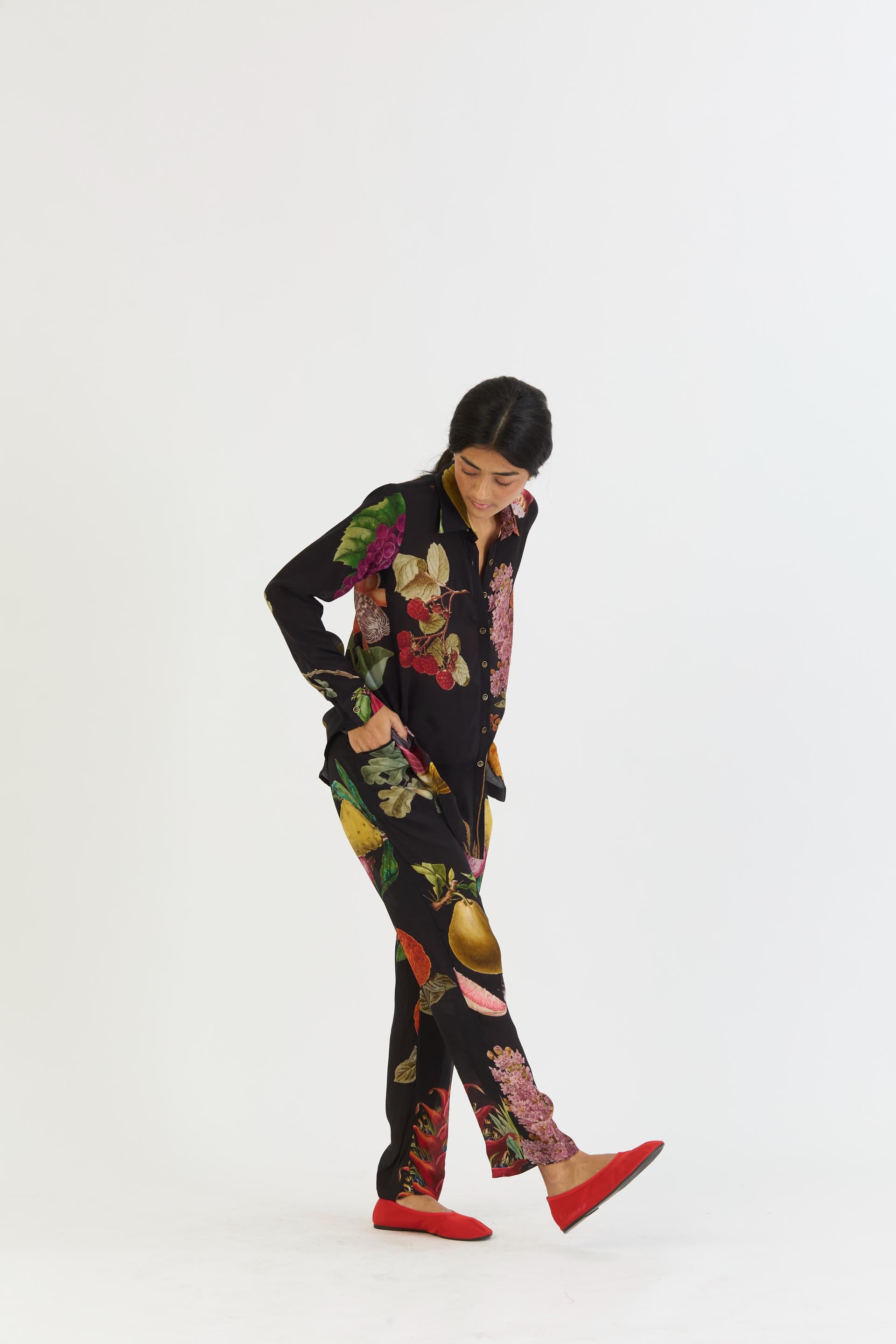 The enchanting Plum print, a breathtaking collection inspired by an old botanical tapestry. This exquisite design showcases watercolor florals, fruits, and leaves playfully dancing against a serene black background, evoking a touch of vintage charm.