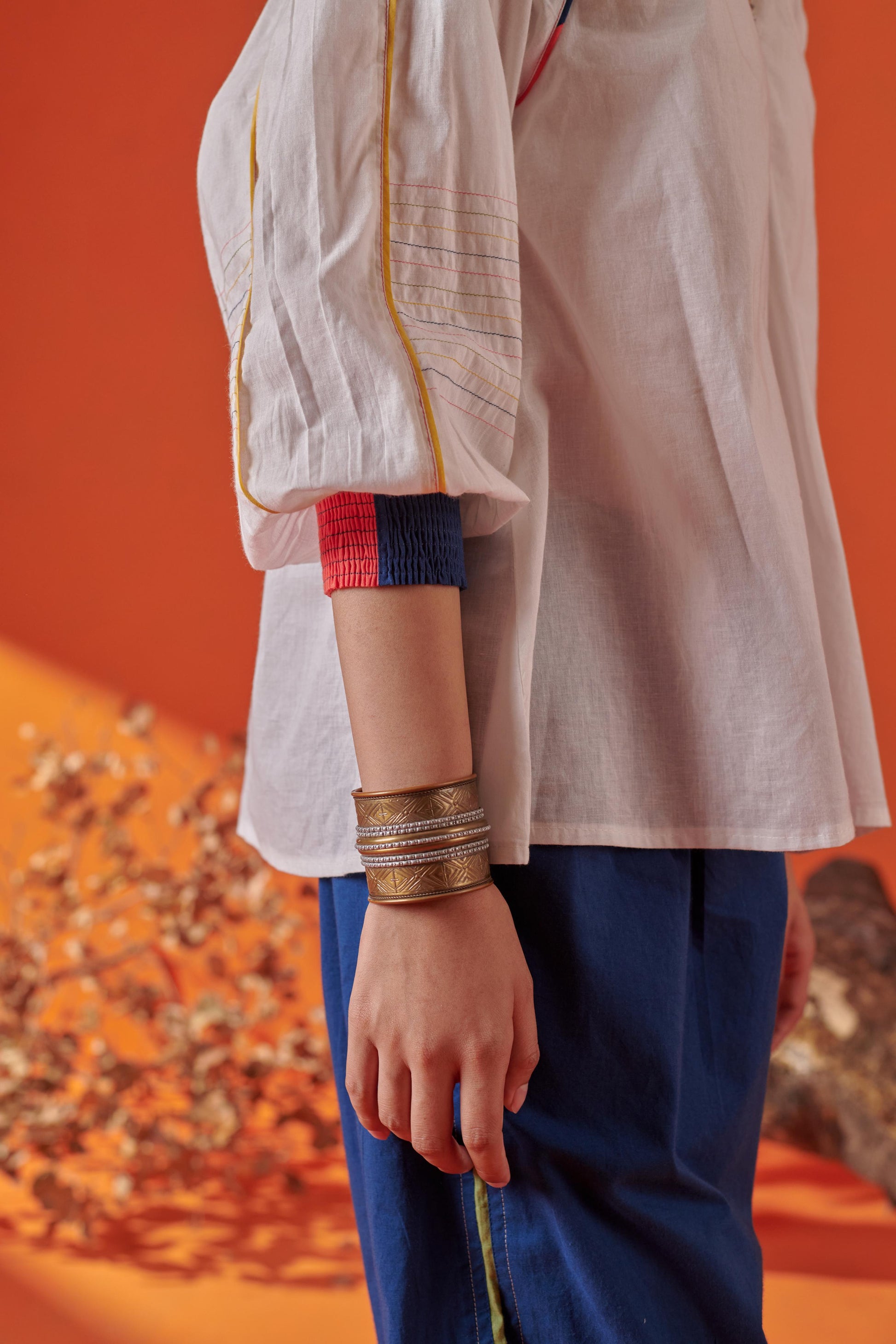The Plush Top brings a subtle statement to your everyday dressing. Multicoloured threads and vibrant binding details along the neckline and sleeves showcase the quiet joy of thoughtful craftsmanship. Perfect for workdays that flow into relaxed evenings or brunches in the sun, this top blends comfort and creative detailing effortlessly.