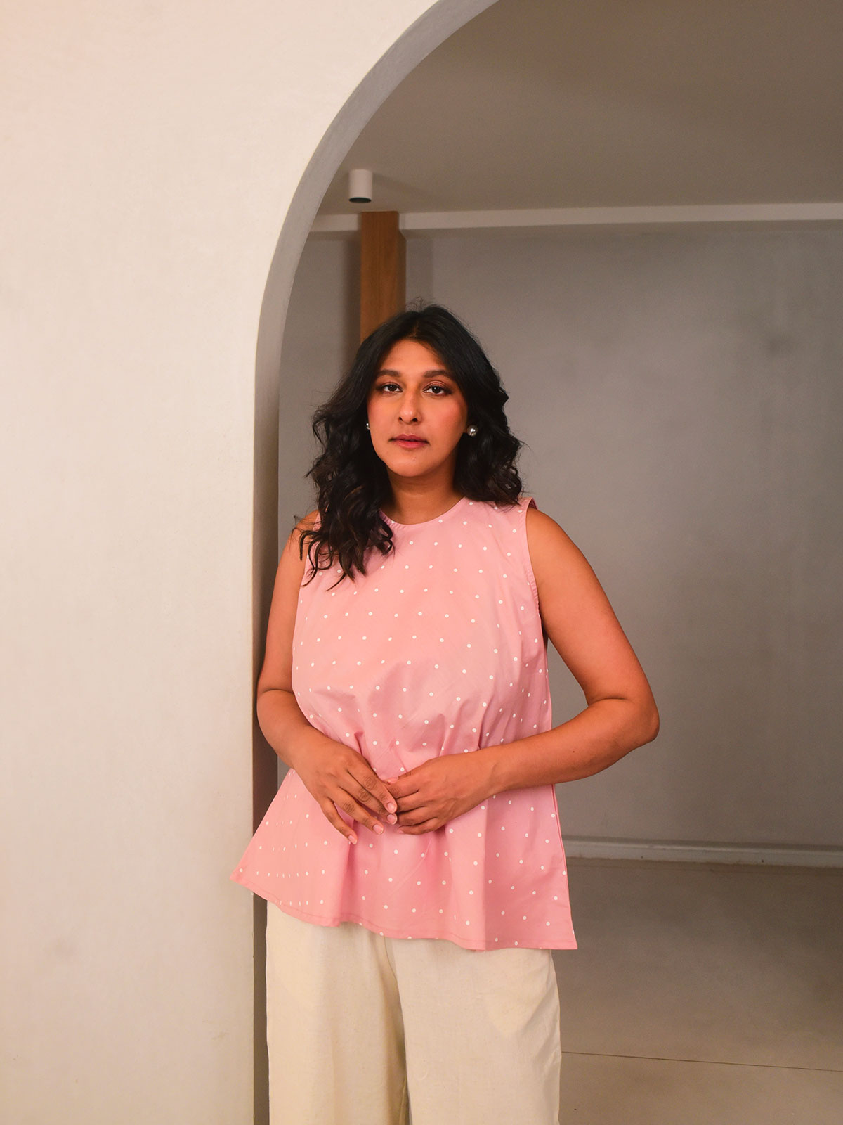 A wardrobe essential with a hint of charm, this sleeveless top is cut in our exclusive pink polka printed cotton. Featuring a relaxed fit and a subtle keyhole detail at the back, it’s the kind of piece that pairs effortlessly with denims, trousers, or skirts. Wear it tucked or loose, it's perfect for everyday errands or laid-back office days.