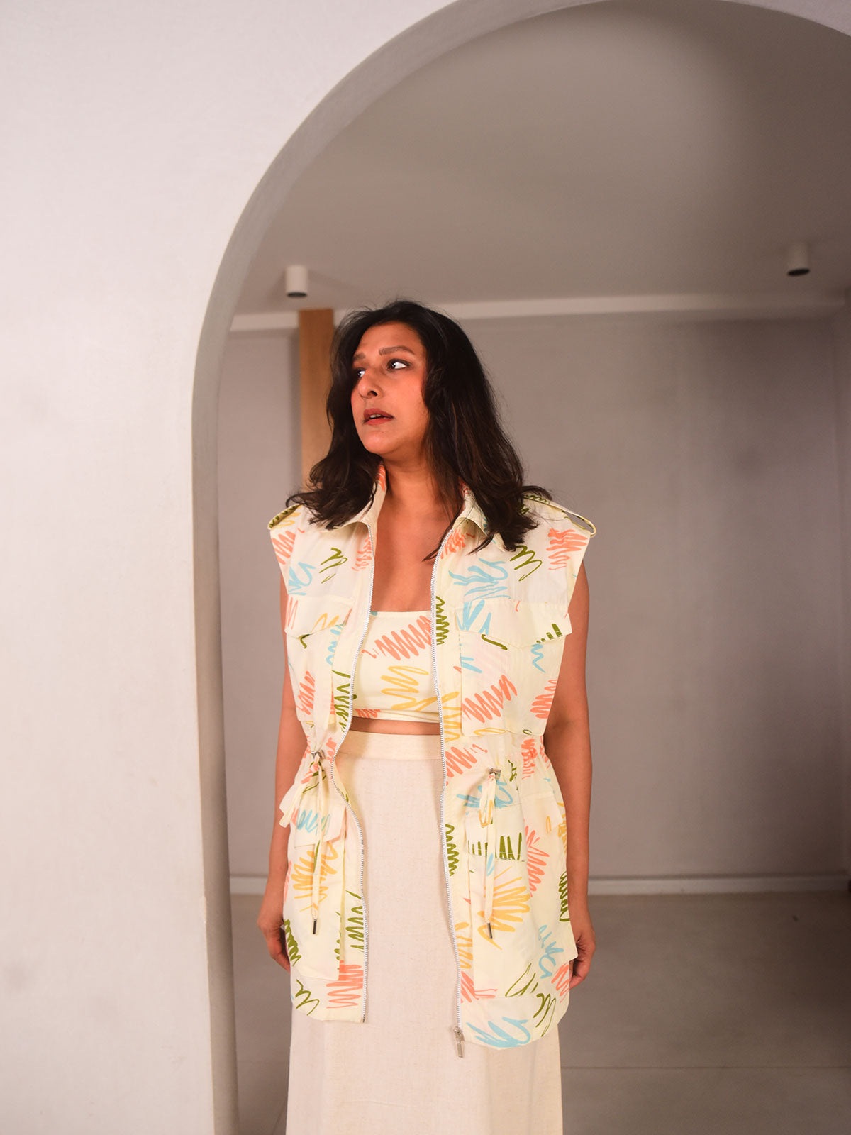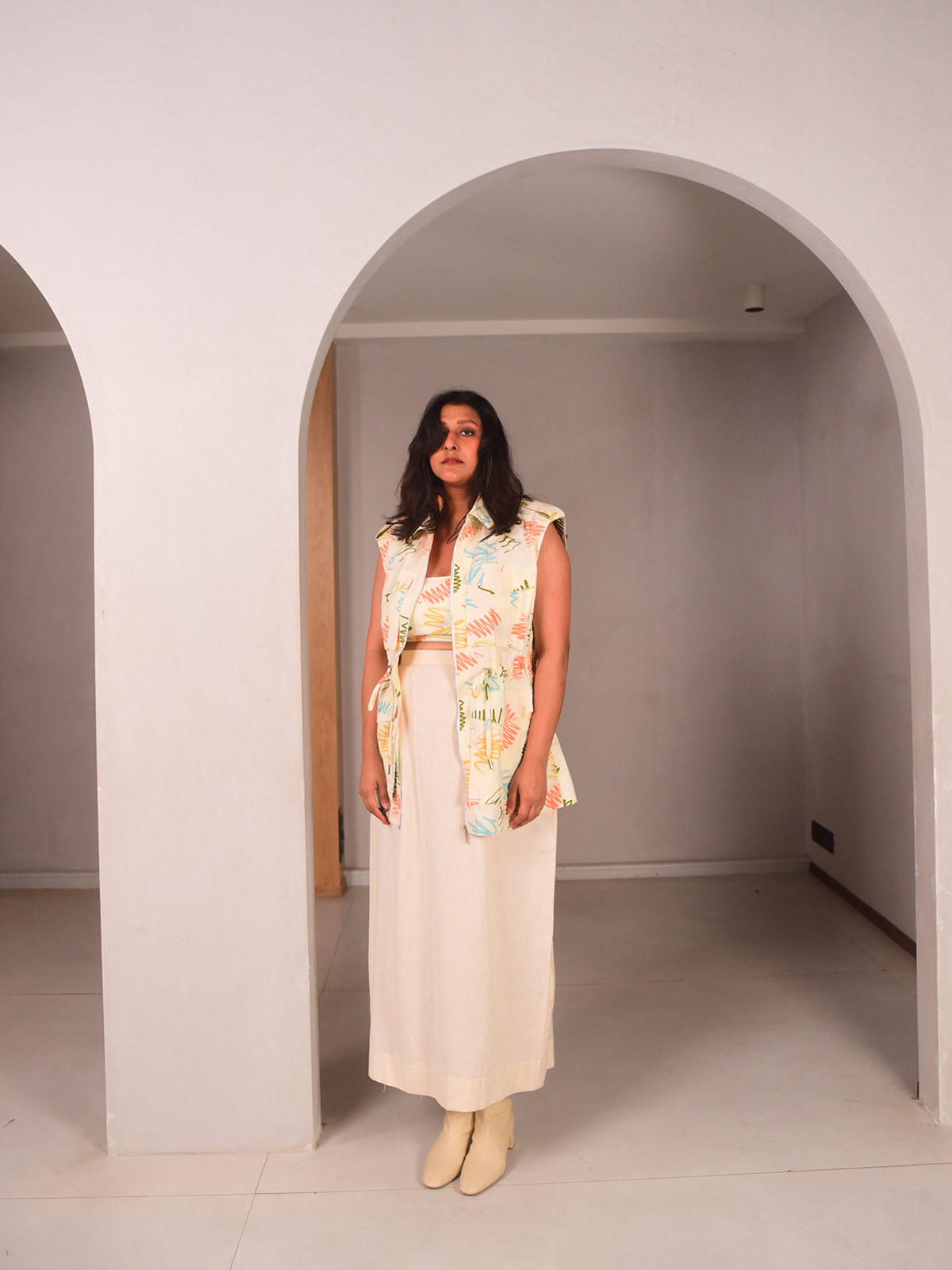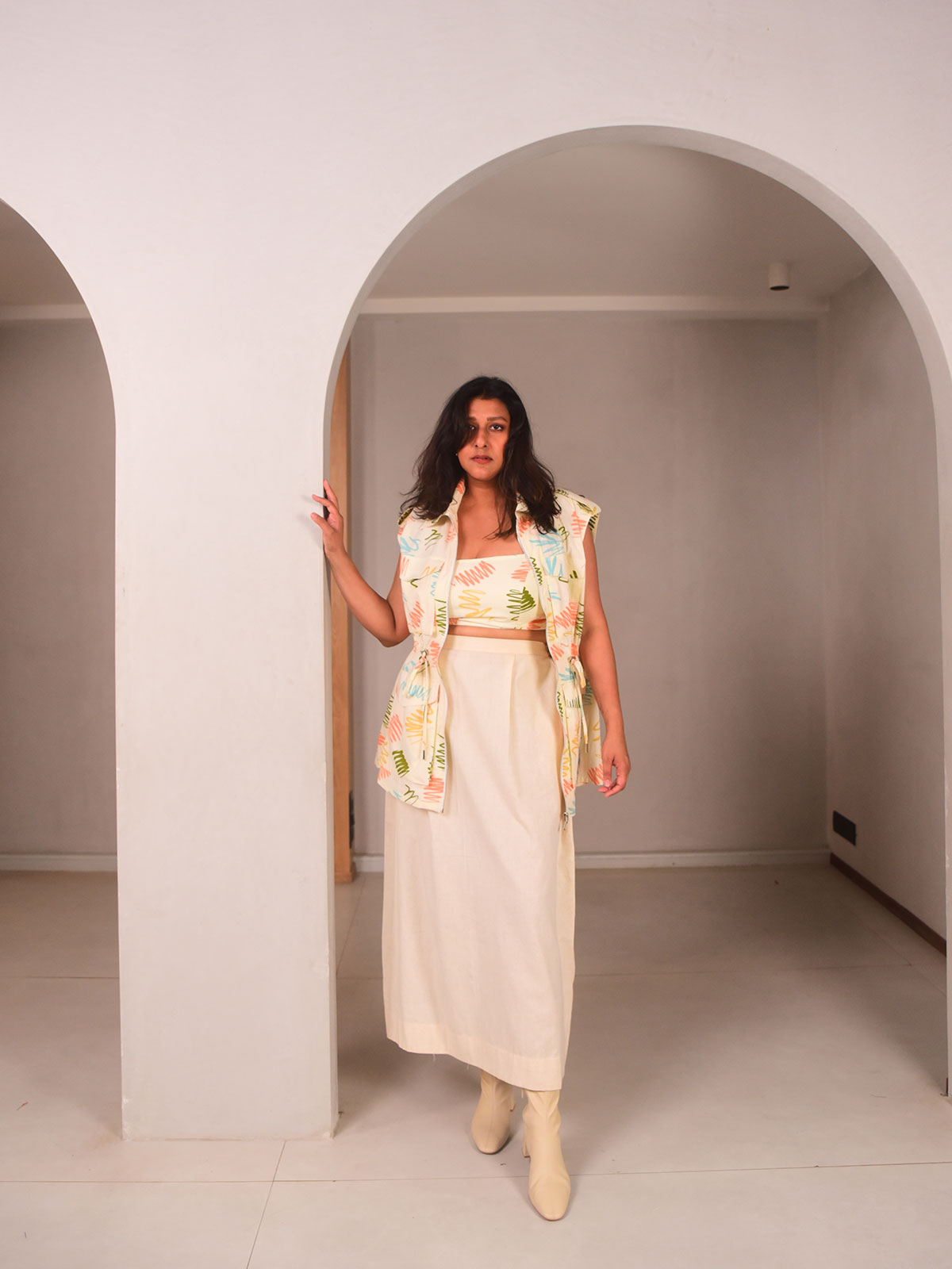 Blank this playful bralette is cut in our exlusive cream and colourful scribble hand-screen printed cotton. The fitted padded design adds a fun, feminine element to your wardrobe. Wear it with our Poppy Sleveless Jacket and Amara Linen Skirt for a stylish, modern look.blank
