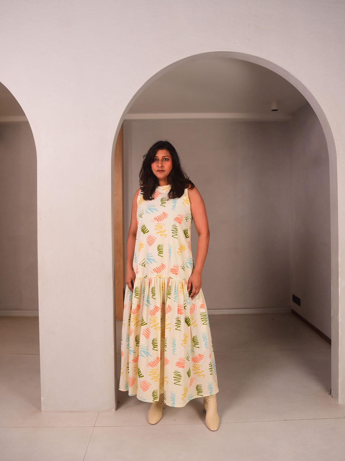 Blank the kind of dress that fits every plan and every mood. This dress is cut in our exclusive cream and colourful scribble hand-screen printed cotton. A breathable, long ruffled dress made for comfortable days, with pockets on both sides.blank