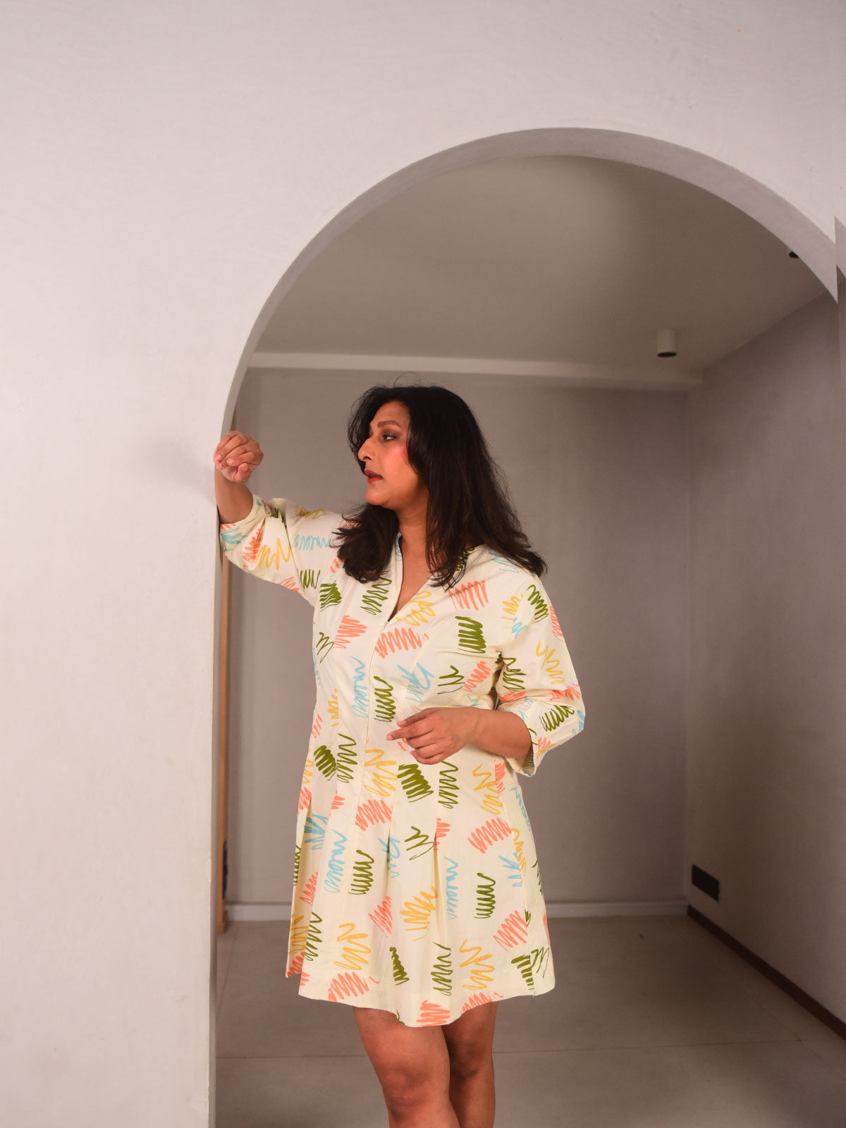 Blank this short dress features a panelled design with long sleeves, cut in our exclusive cream and colourful scribble hand-screen printed cotton. The sleeves offer structure while the print keeps it playful. Style with boots for a cool chic look.blank
