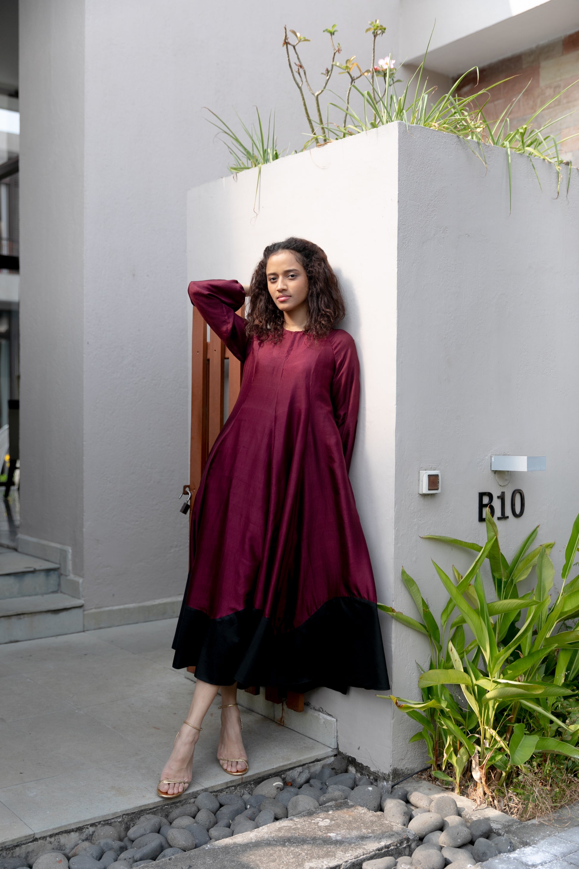 Maroon DressPanelled handwoven mulberry silk midi dress with