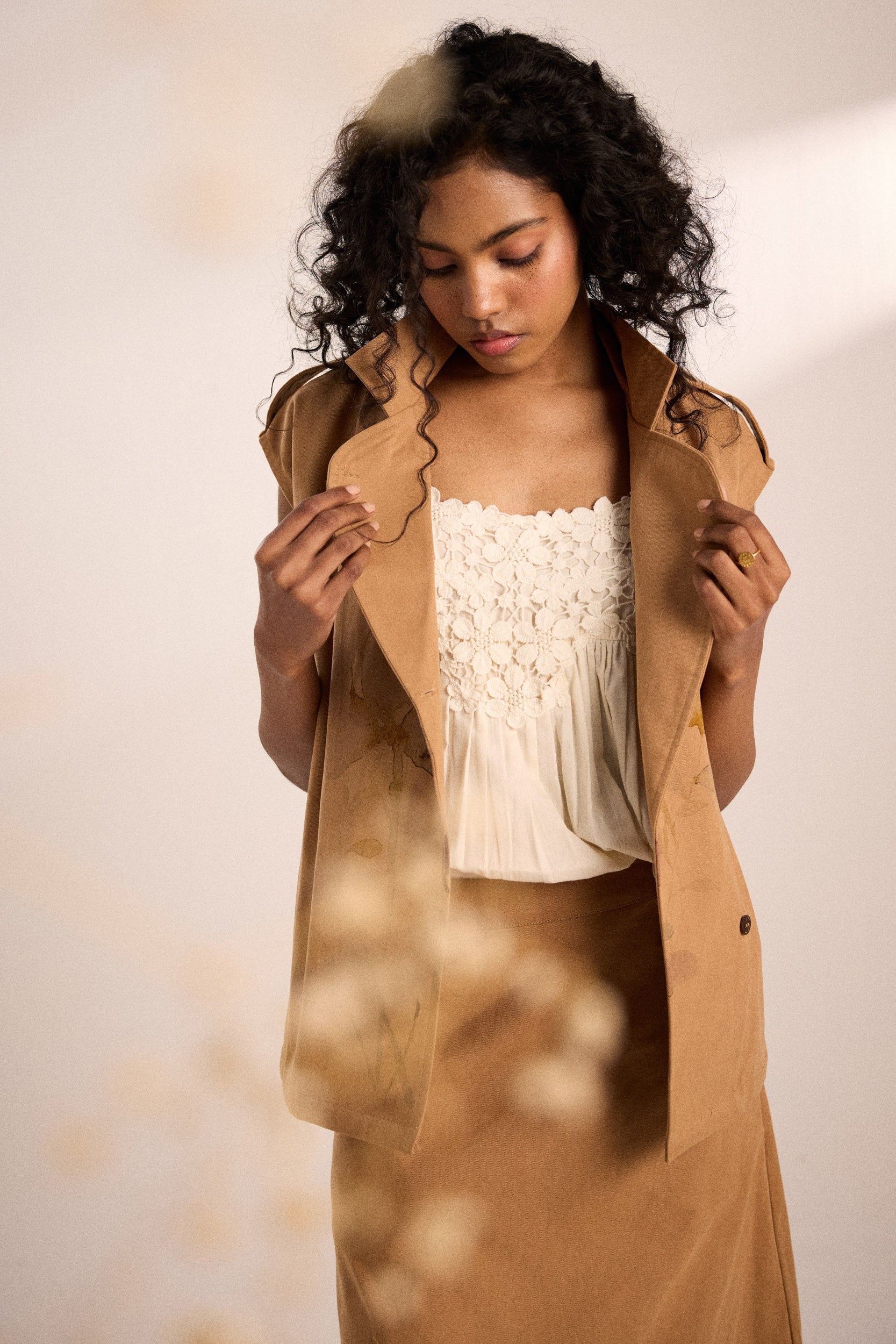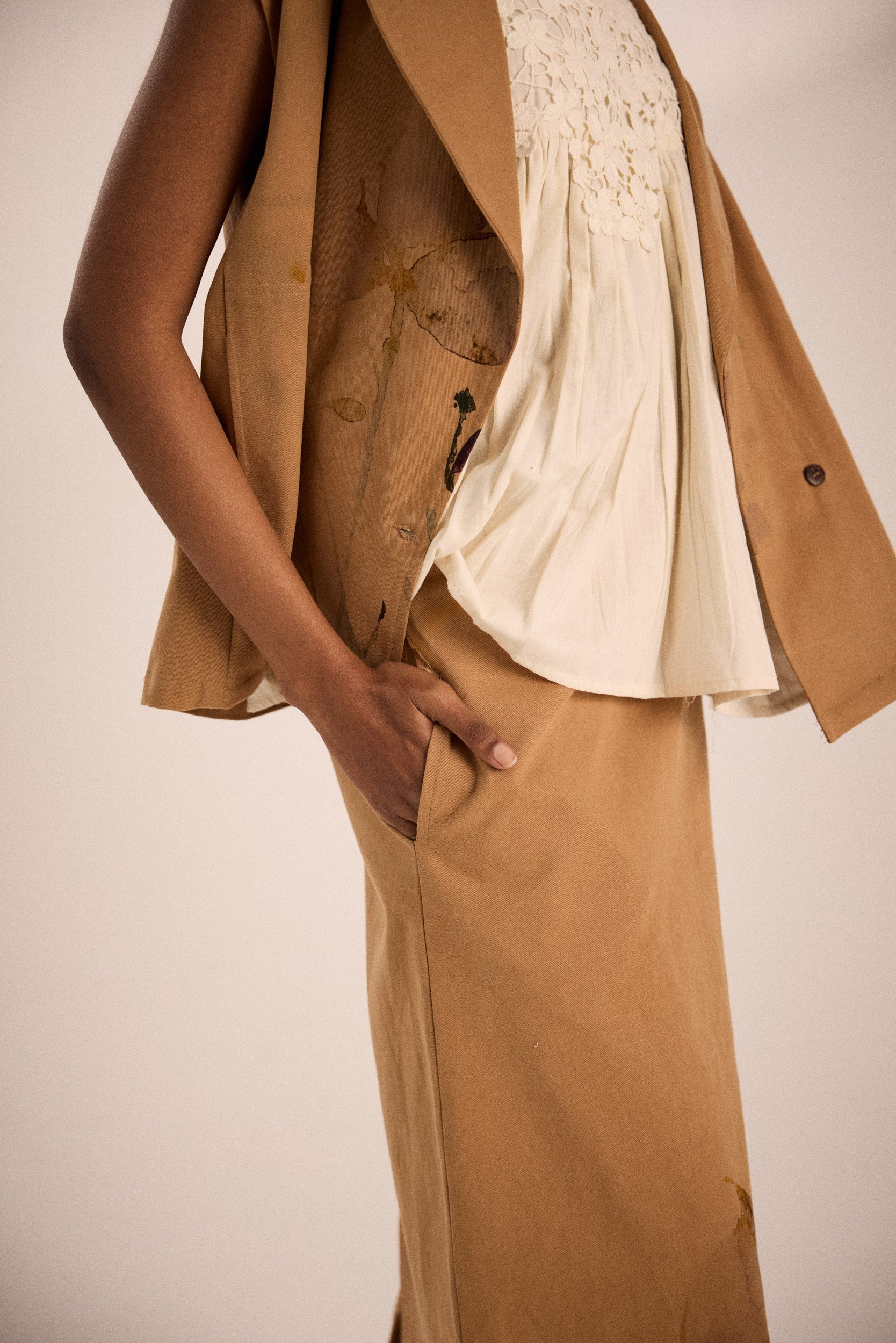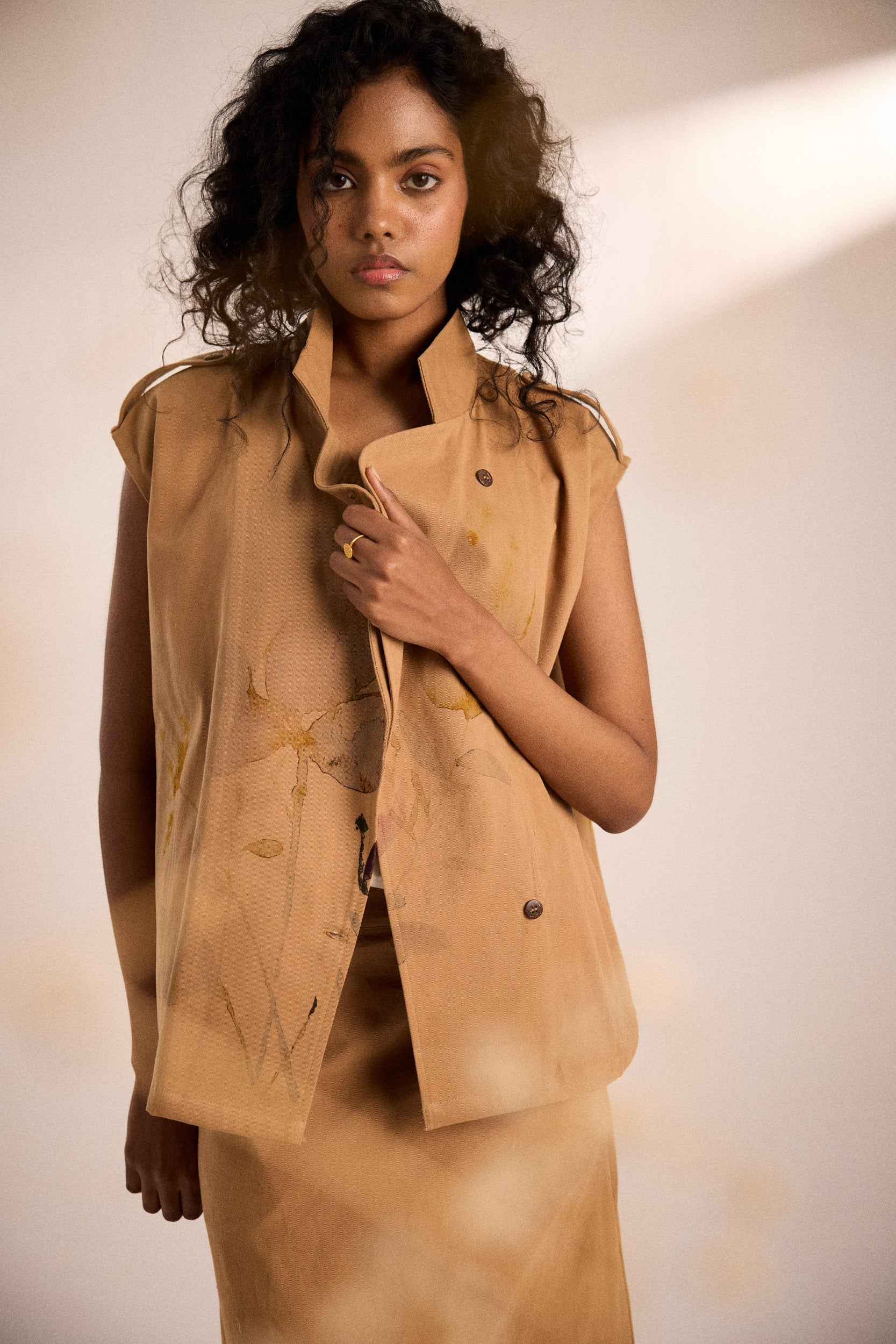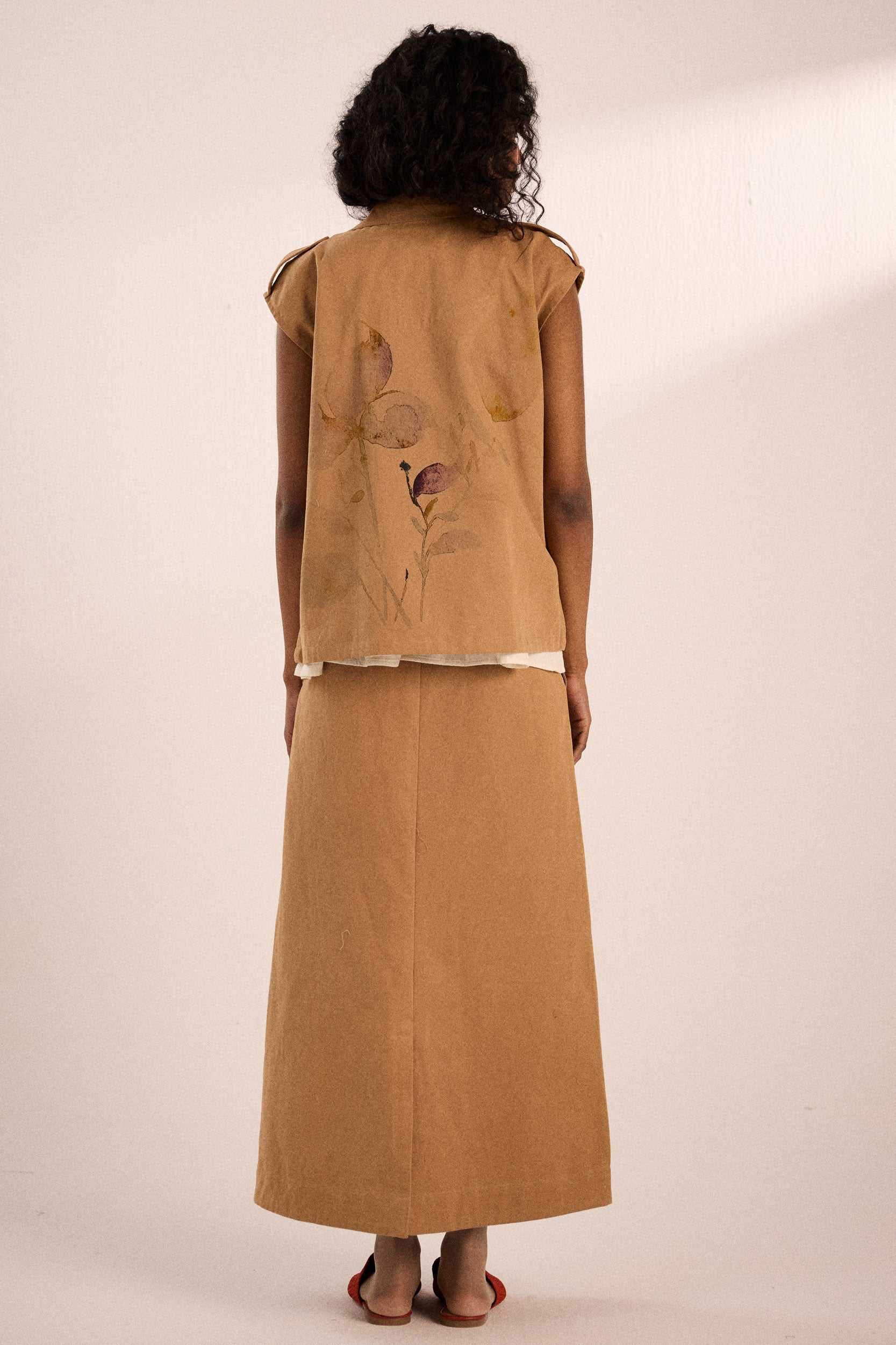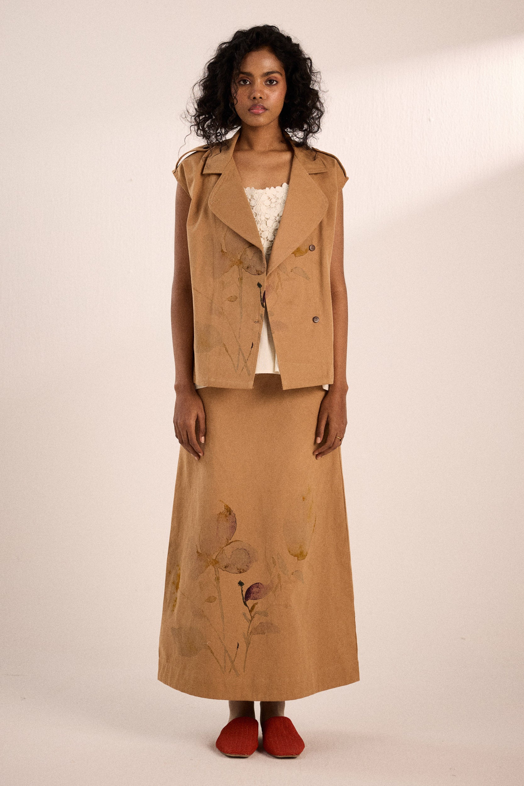A beige twill cotton co-ord set with a subtle watercolor floral print. The tunic features a notch lapel collar and front button opening, while the straight skirt includes side seam pockets.