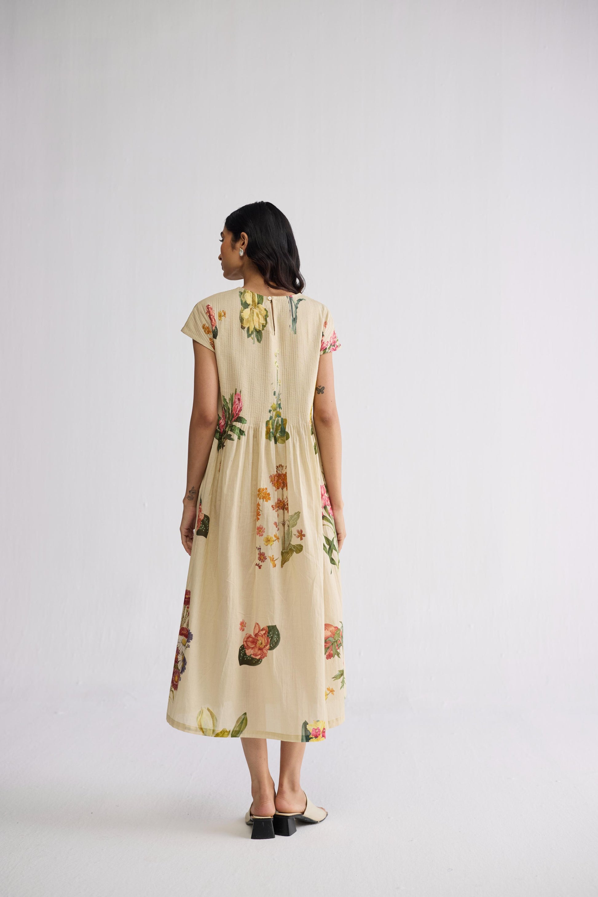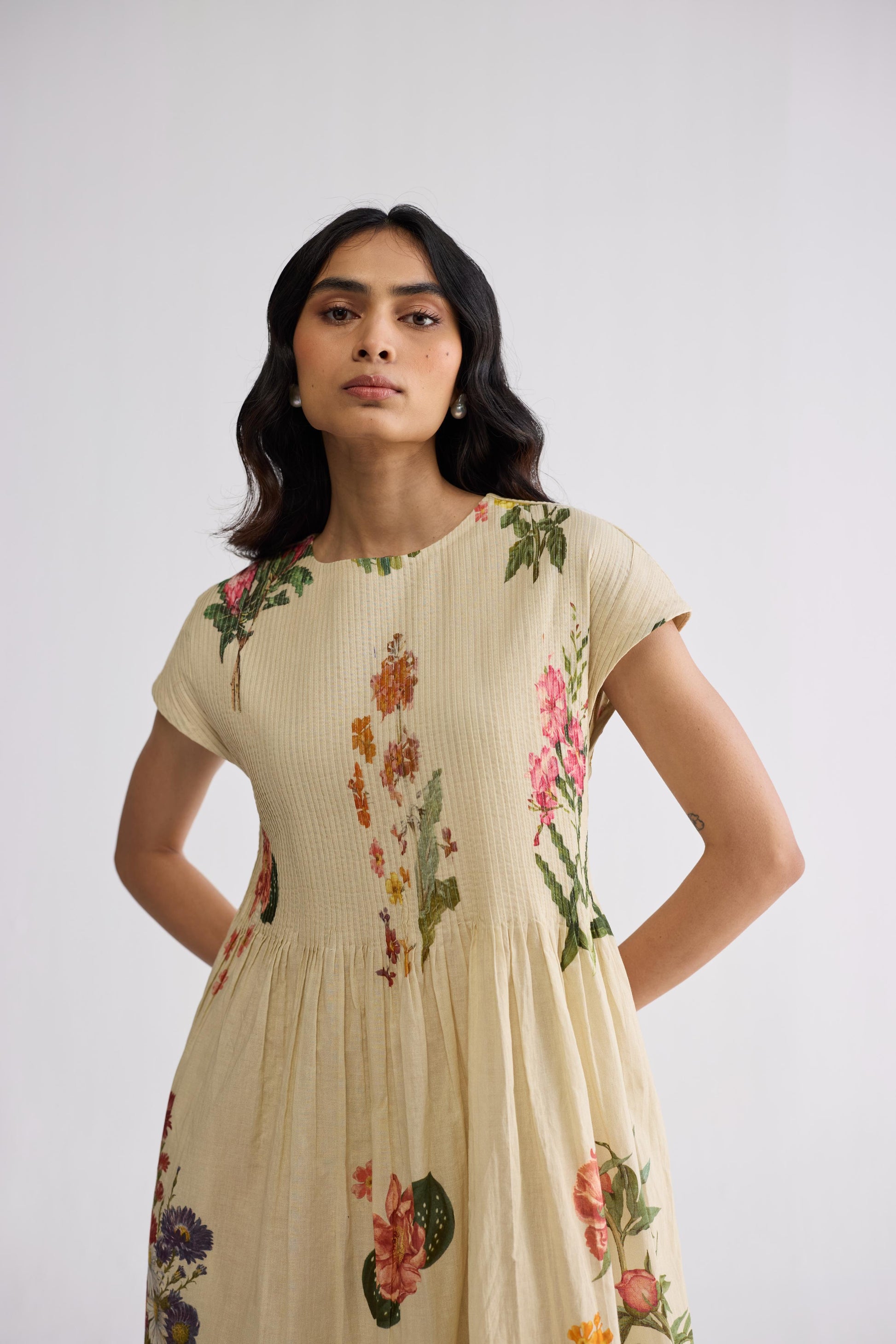 This midi dress is distinguished by its meticulous pintuck detailing that extends gracefully along both the front and back, sculpting the silhouette until the waist. The precision of the pintucks adds subtle structure and depth, enhancing the fluid drape of the garment while maintaining an effortless sense of movement. The soft round neckline and cap sleeves lend a modern restraint, while the delicate keyhole opening at the back introduces a hint of understated allure.