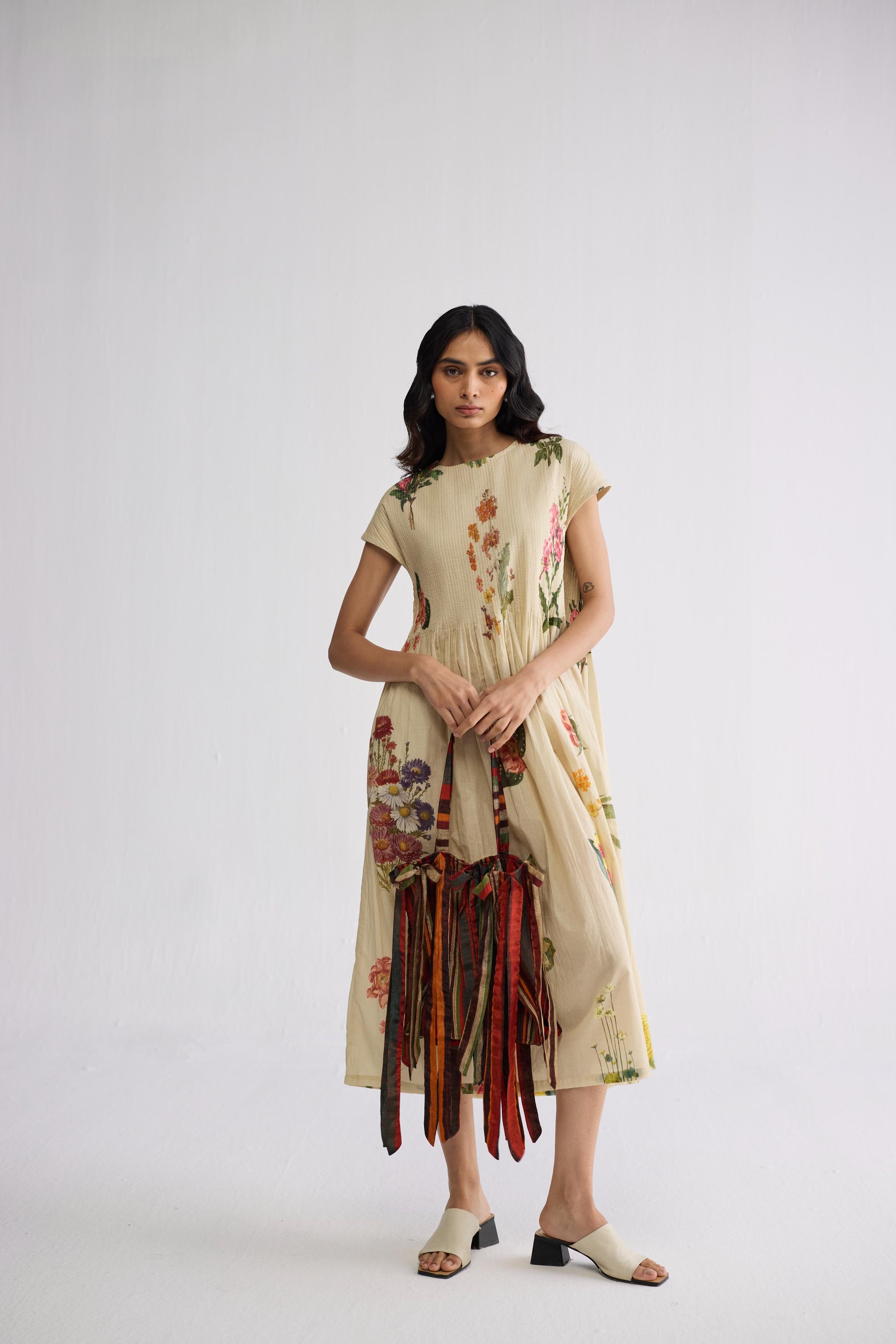 A delicate, nature-inspired floral print that captures the romance of a blooming garden. Set against a soft ivory base, the artwork features hand-painted botanicals in shades of blush pinks, warm yellows, and fresh greens. The placement of the florals feels intentional and airy, allowing each motif to breathe while creating a graceful, story-like composition. The print evokes a sense of quiet luxury—fresh, feminine, and timelessly elegant