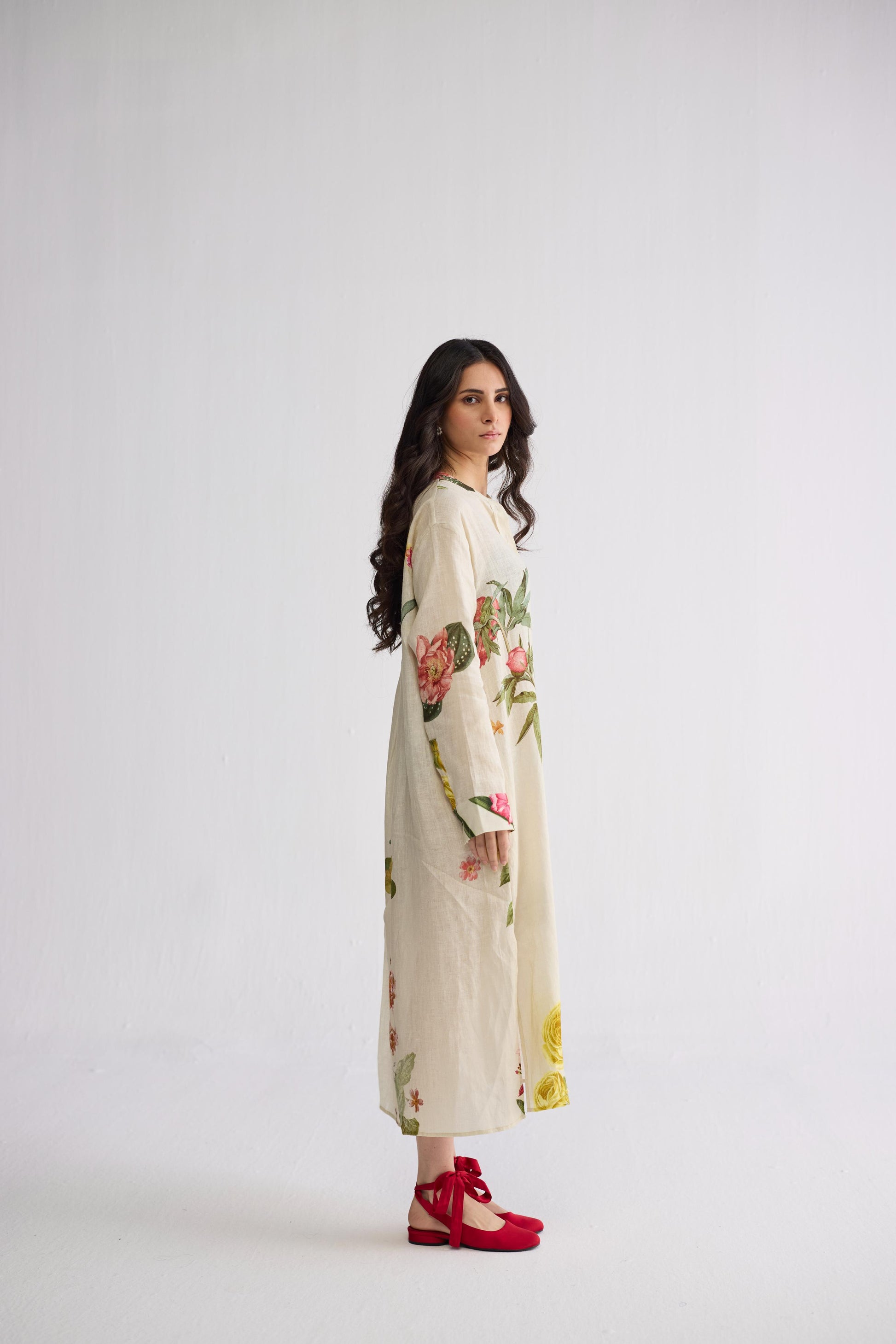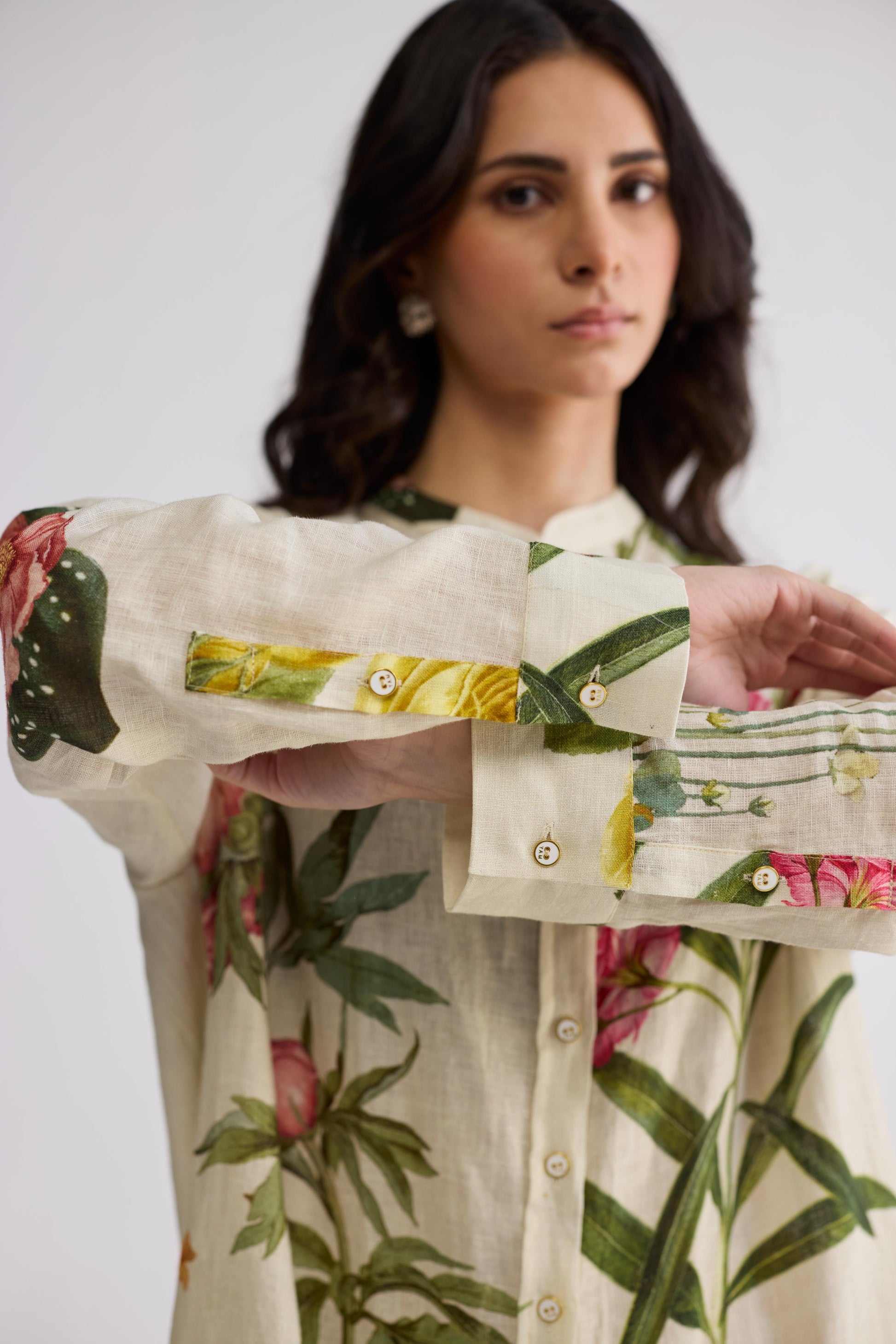 The soft neutral base is beautifully elevated with artistic botanical prints in blooming florals and foliage, creating a serene yet statement look.