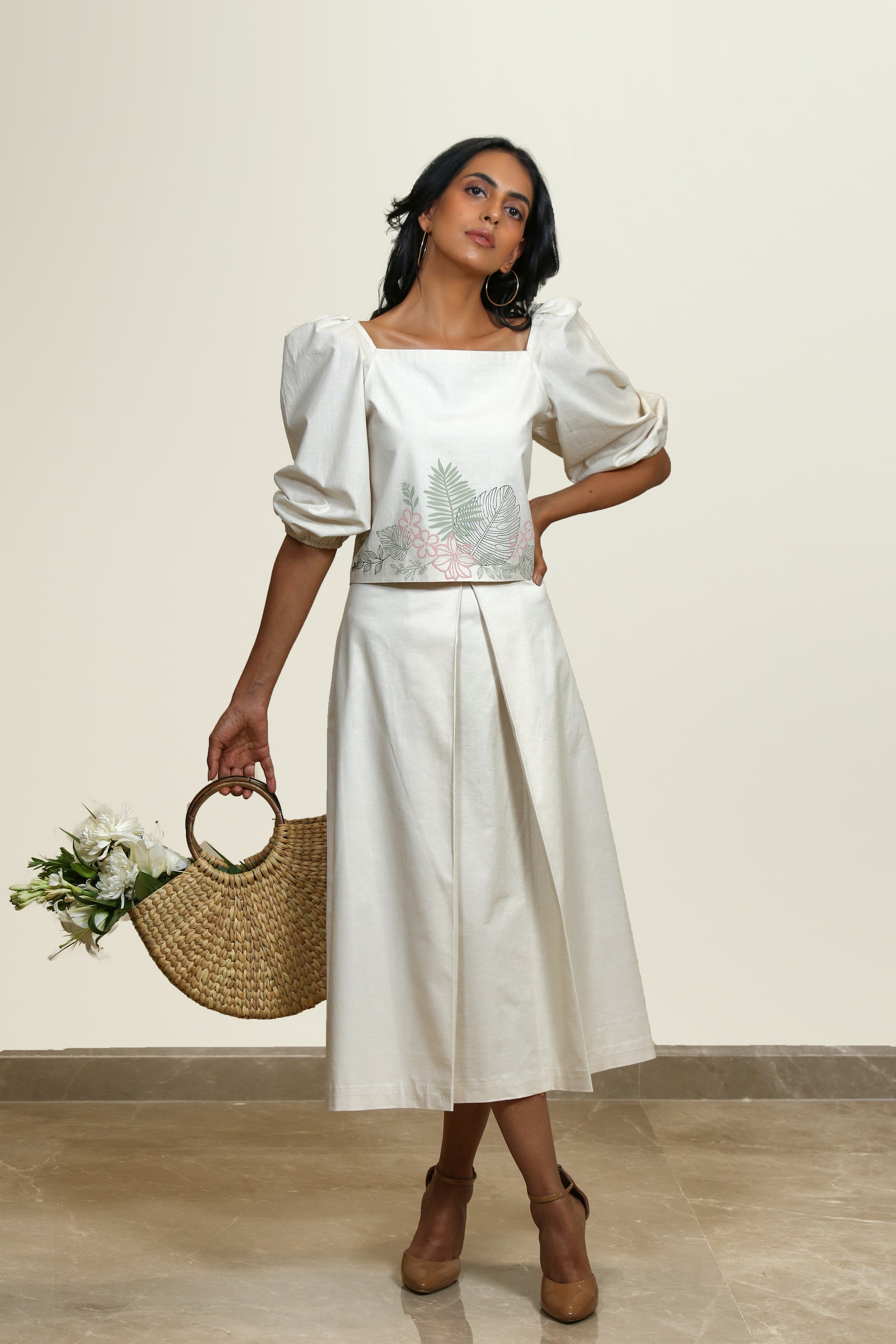 Ivory crop top with a placement print with an overlay of different patterned blocks.